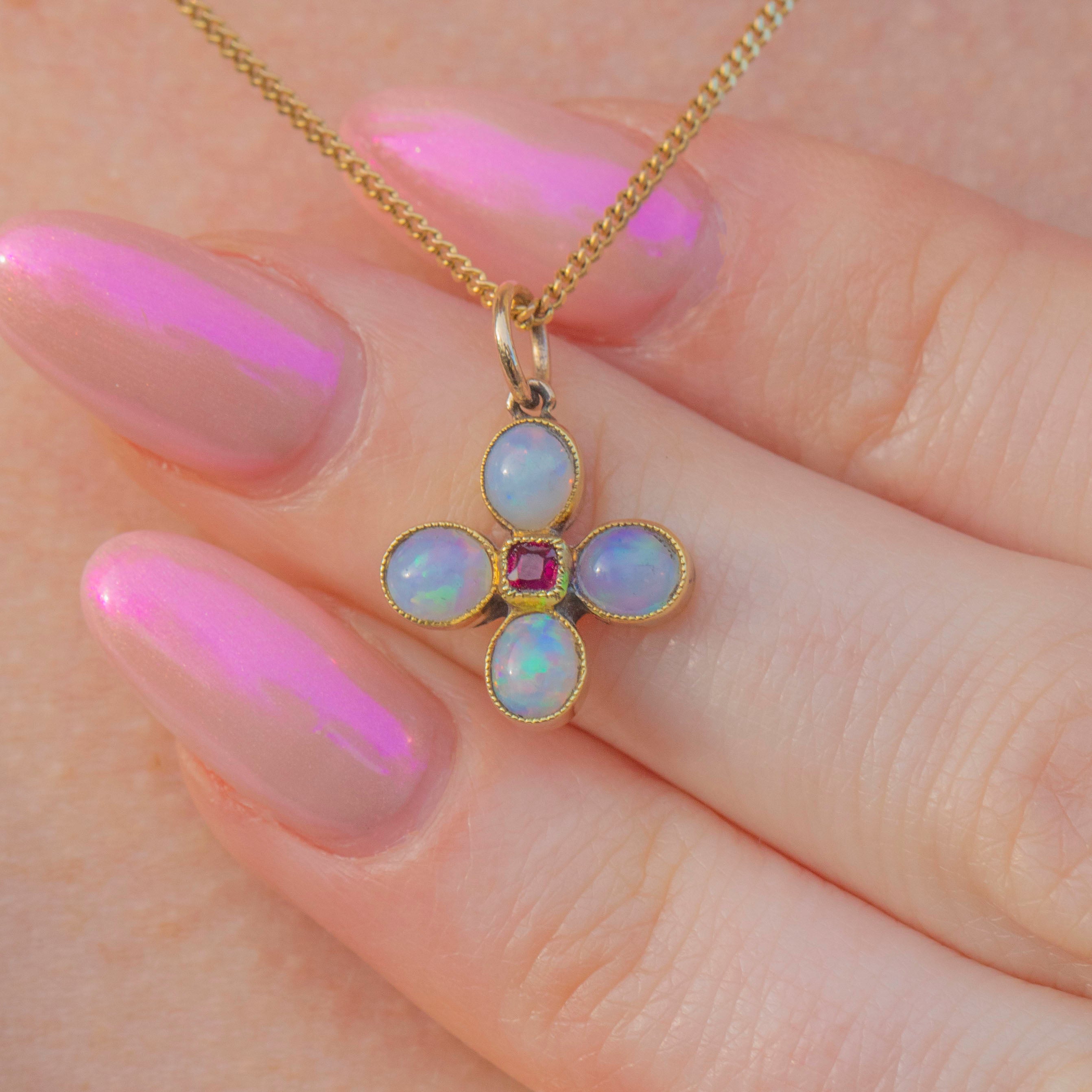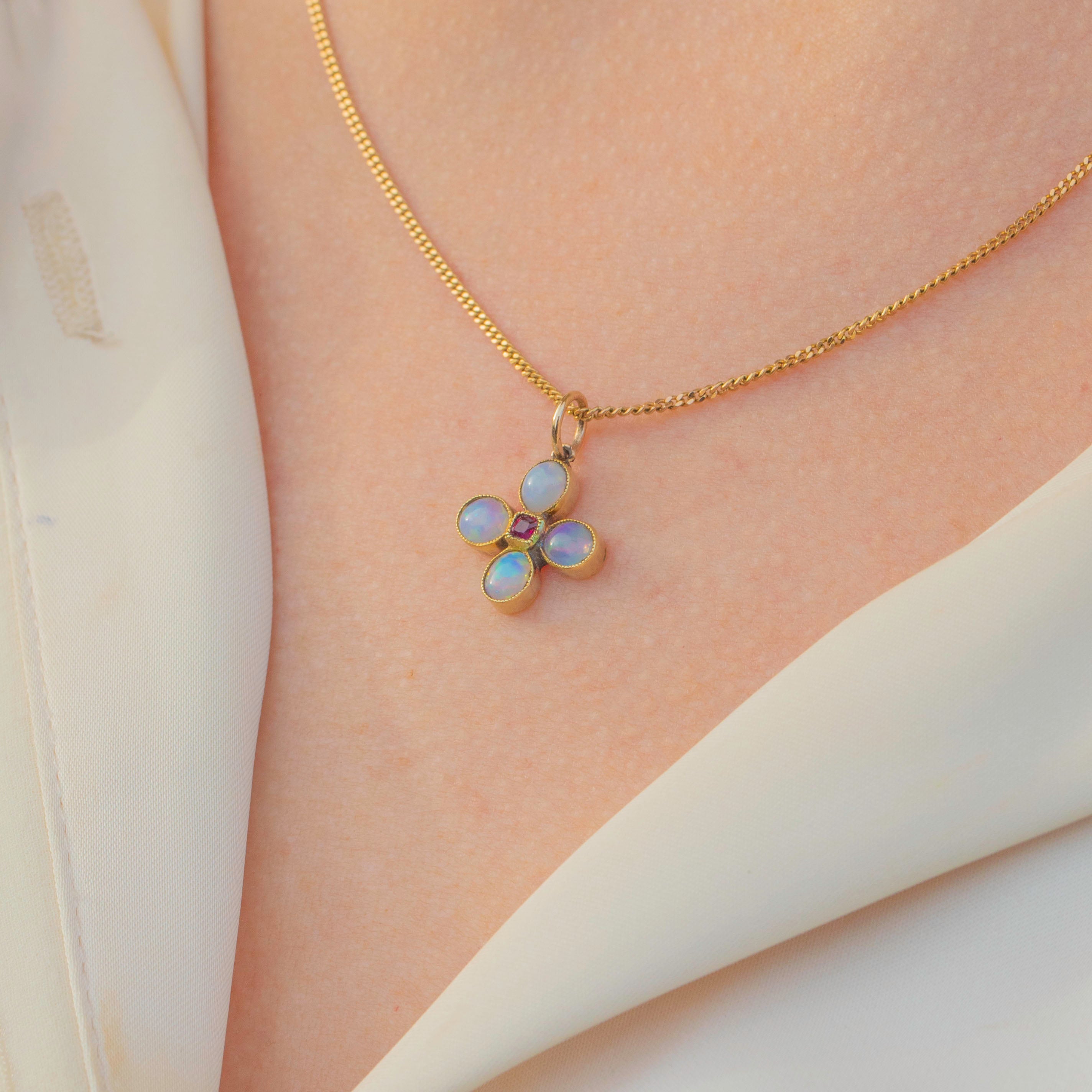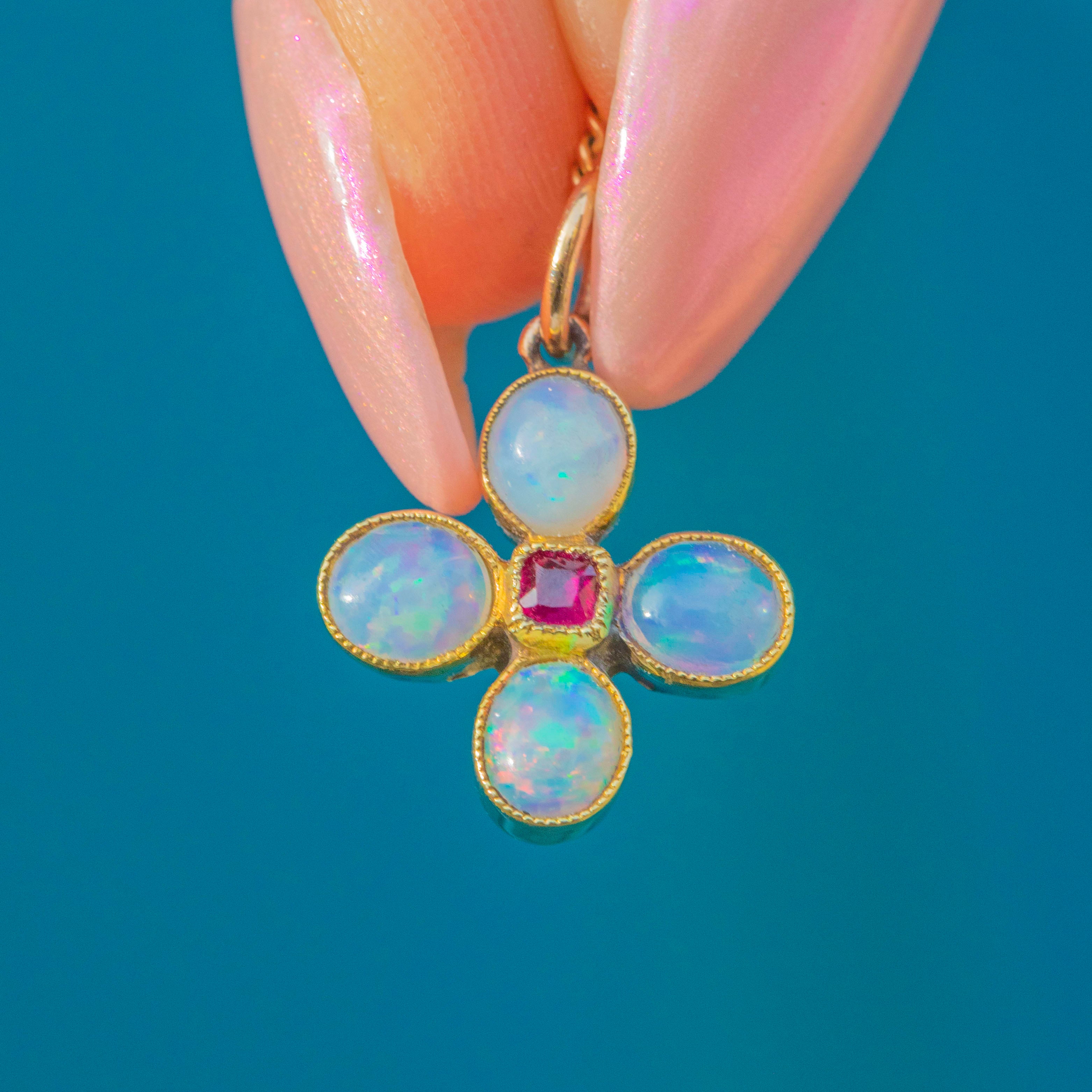 Crafted from buttery 18ct Gold, this Victorian charm features four plump Opals arranged in a charming petal design, surrounding a central radiant Ruby. Each stone catches the light wonderfully, with the iridescence of the Opals effortlessly complimented by the vibrant warmth of the Ruby.