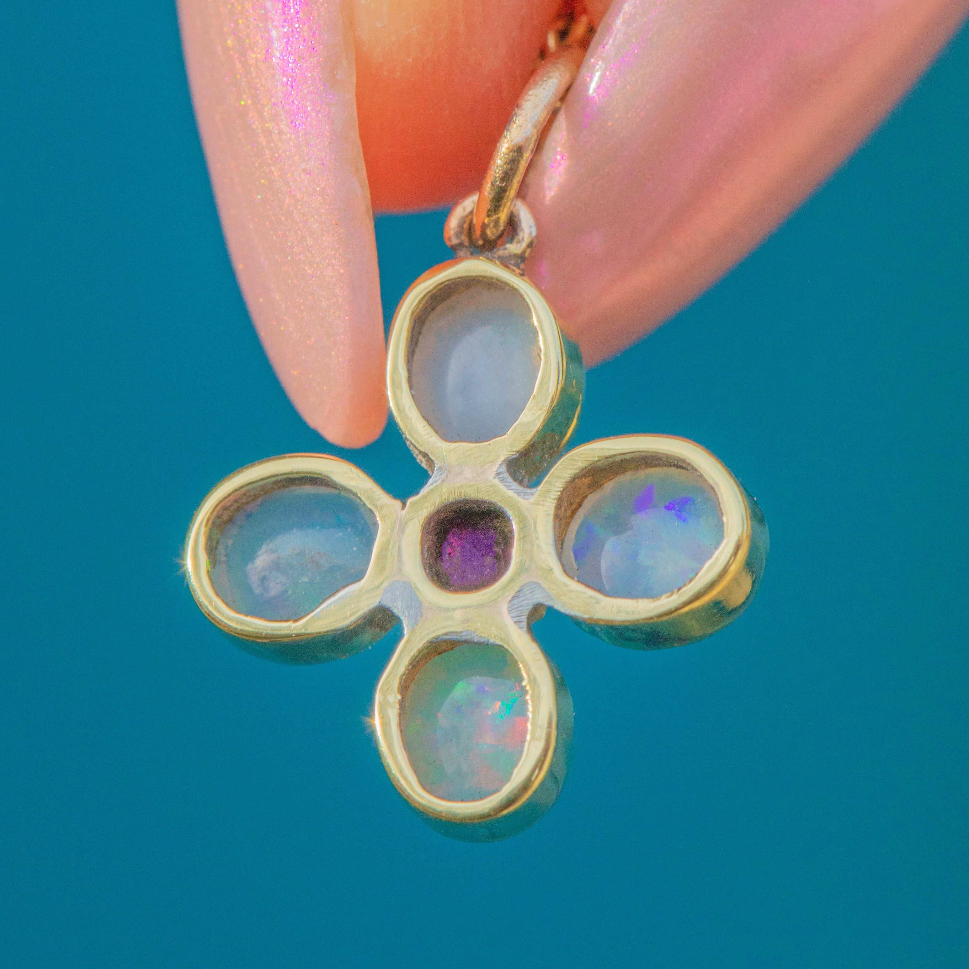 EXCELLENT: This antique 18ct Gold Opal Ruby flower charm is in excellent condition. Both her Opals and Ruby sit securely within their settings, and the charm has a securely soldered jump ring allowing for confident wear. There are some minor marks to the Opals commensurate with age, however this is only noticeable under a jeweller's loupe.