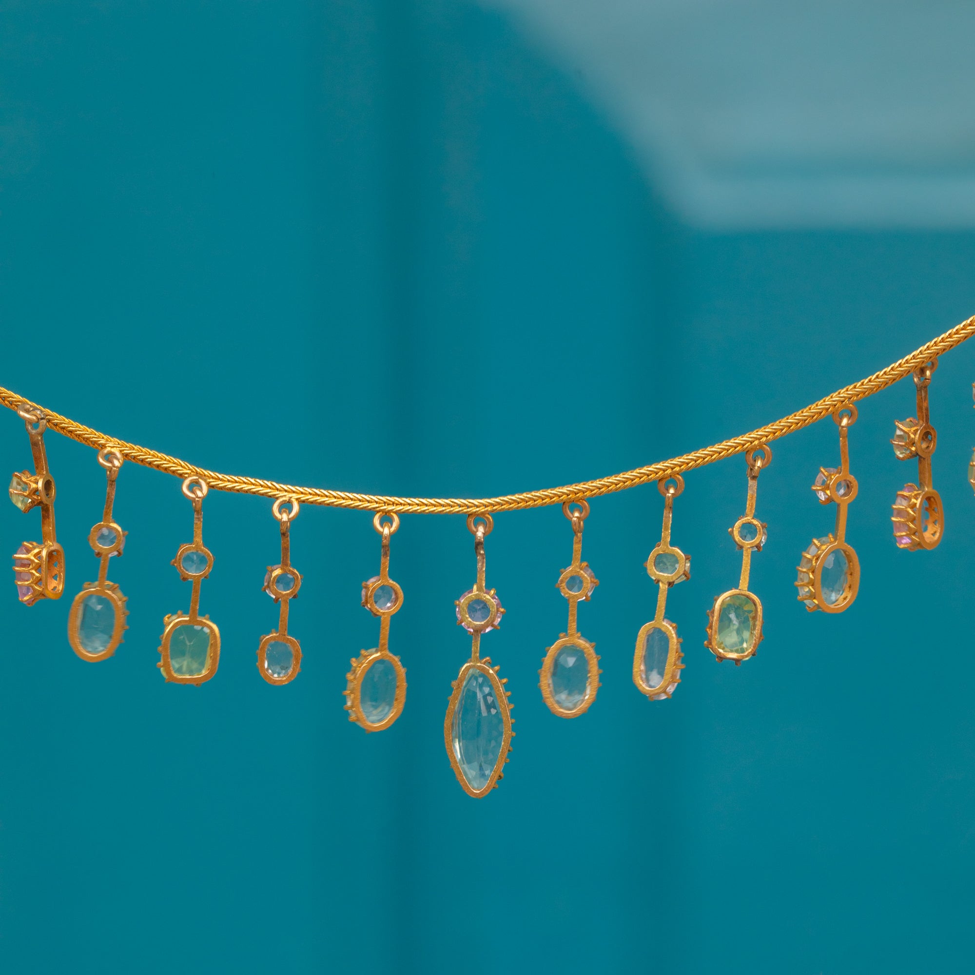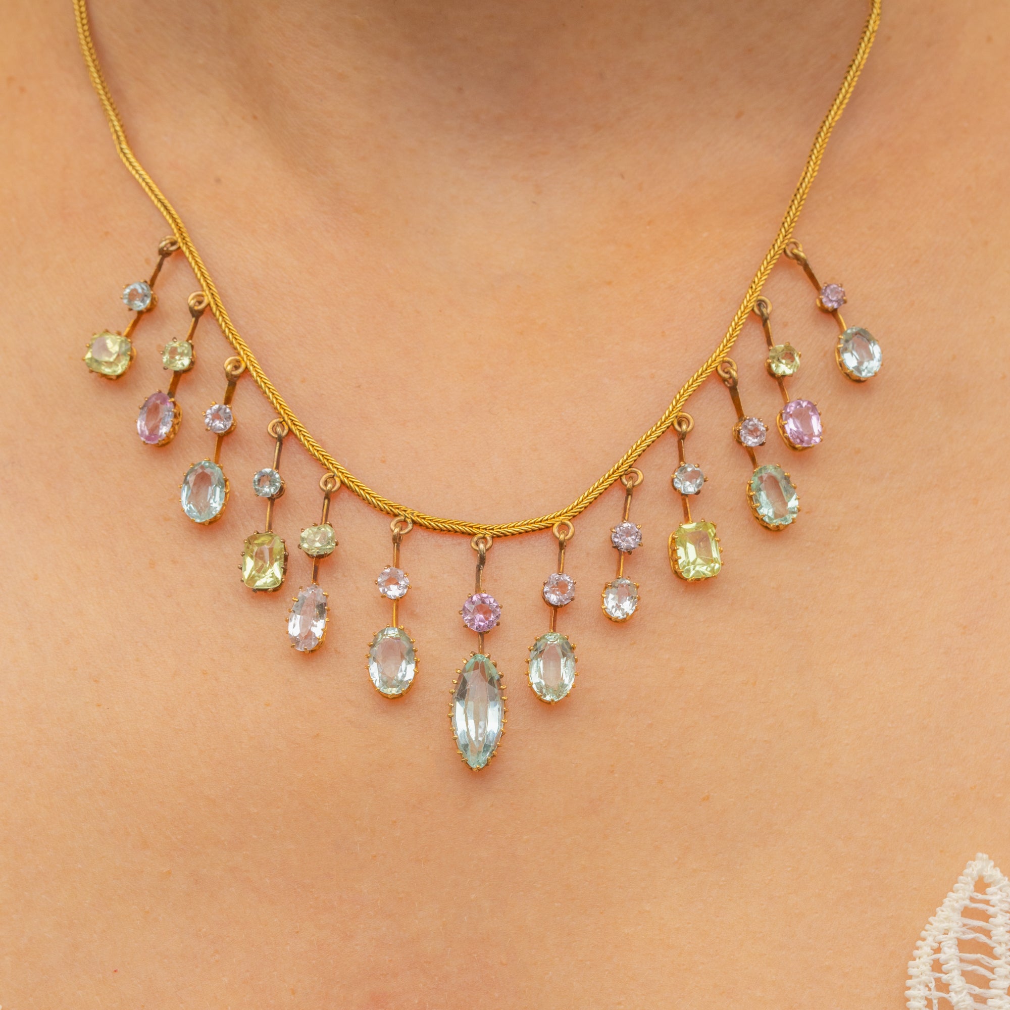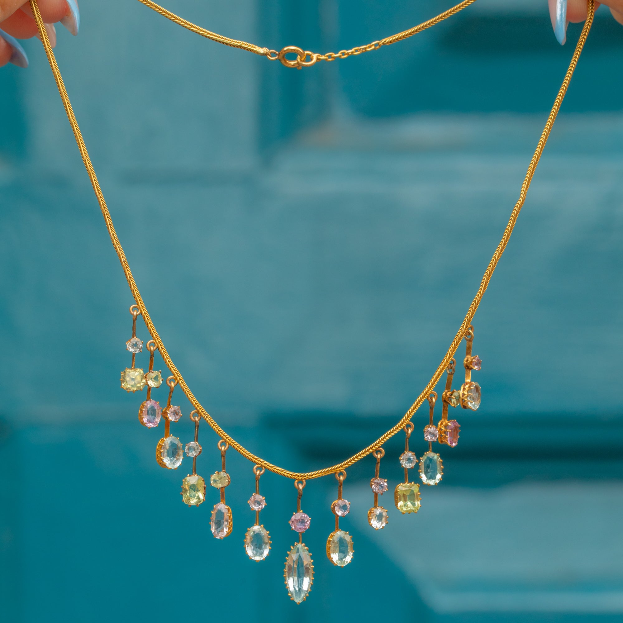 Antique 18ct Gold Pink Topaz, Aquamarine, Chrysoberyl Fringe Necklace