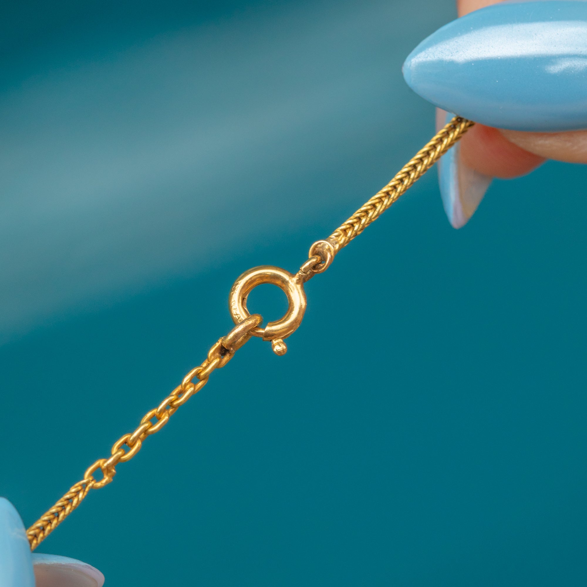 In quintessential Victorian fashion, the gemstones are displayed within warm 18ct Gold claws and suspend elegantly in a delicate fringe formation. Complete with a rich 18ct Gold foxtail chain, this antique fringe necklace is sure to bring ample regal charm to your attire.