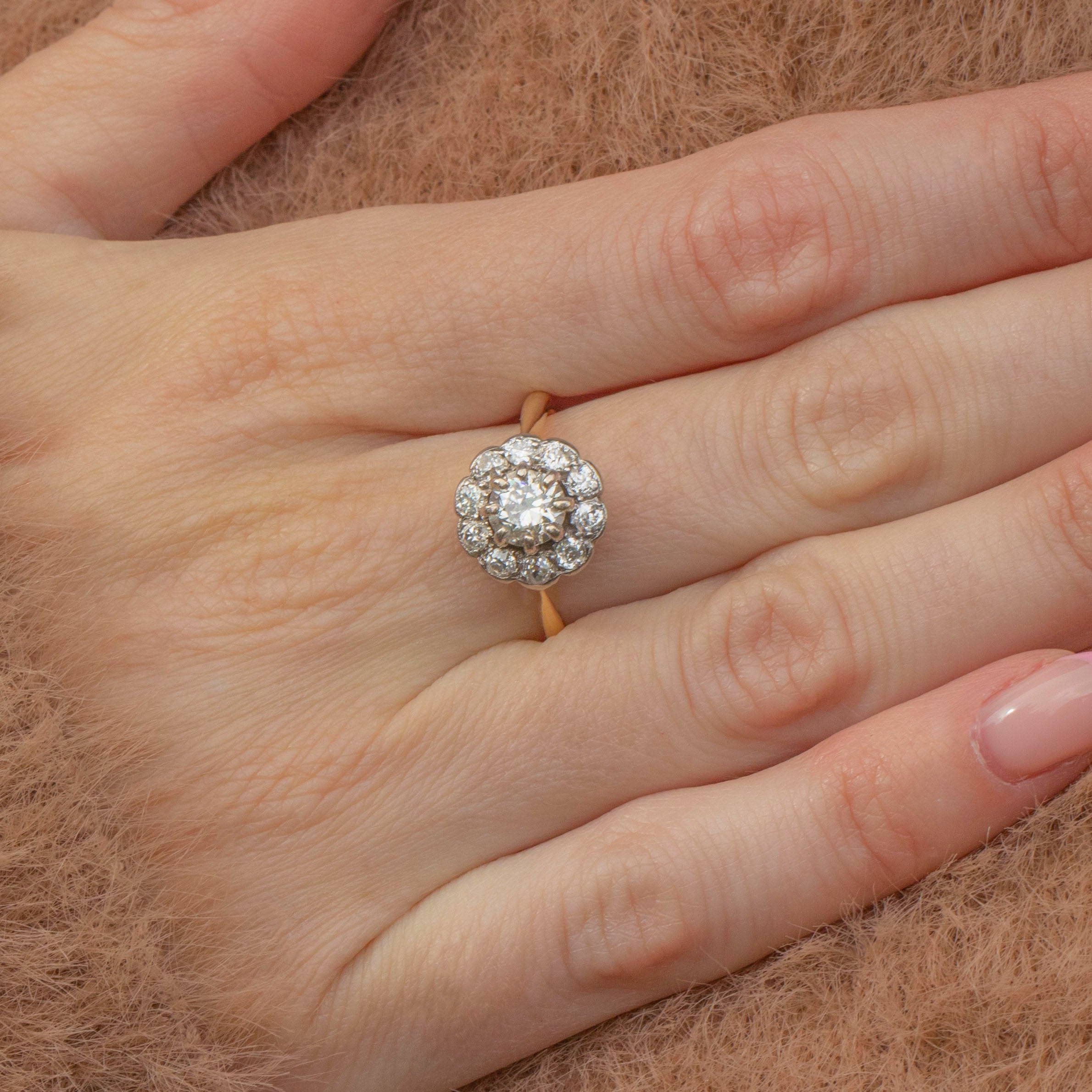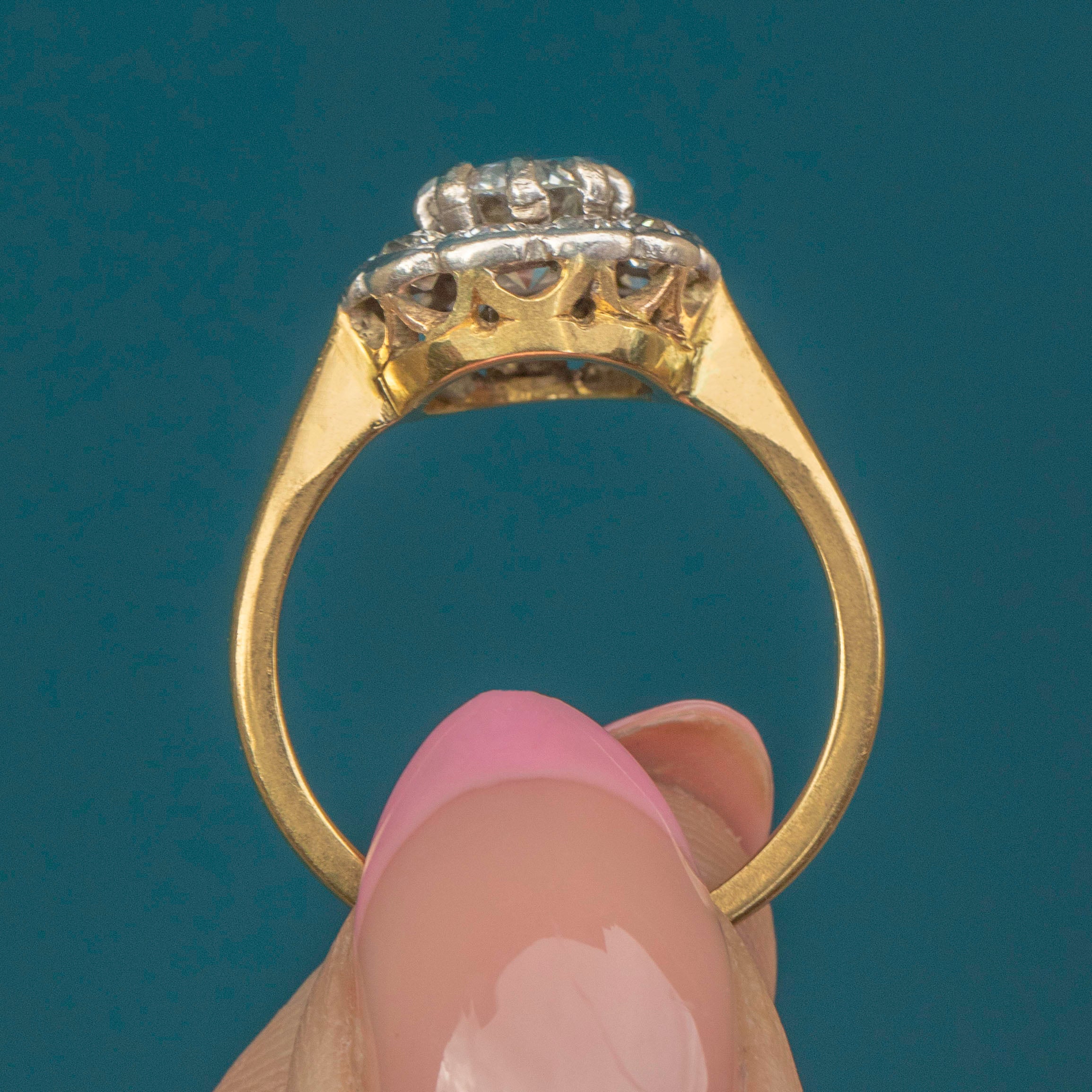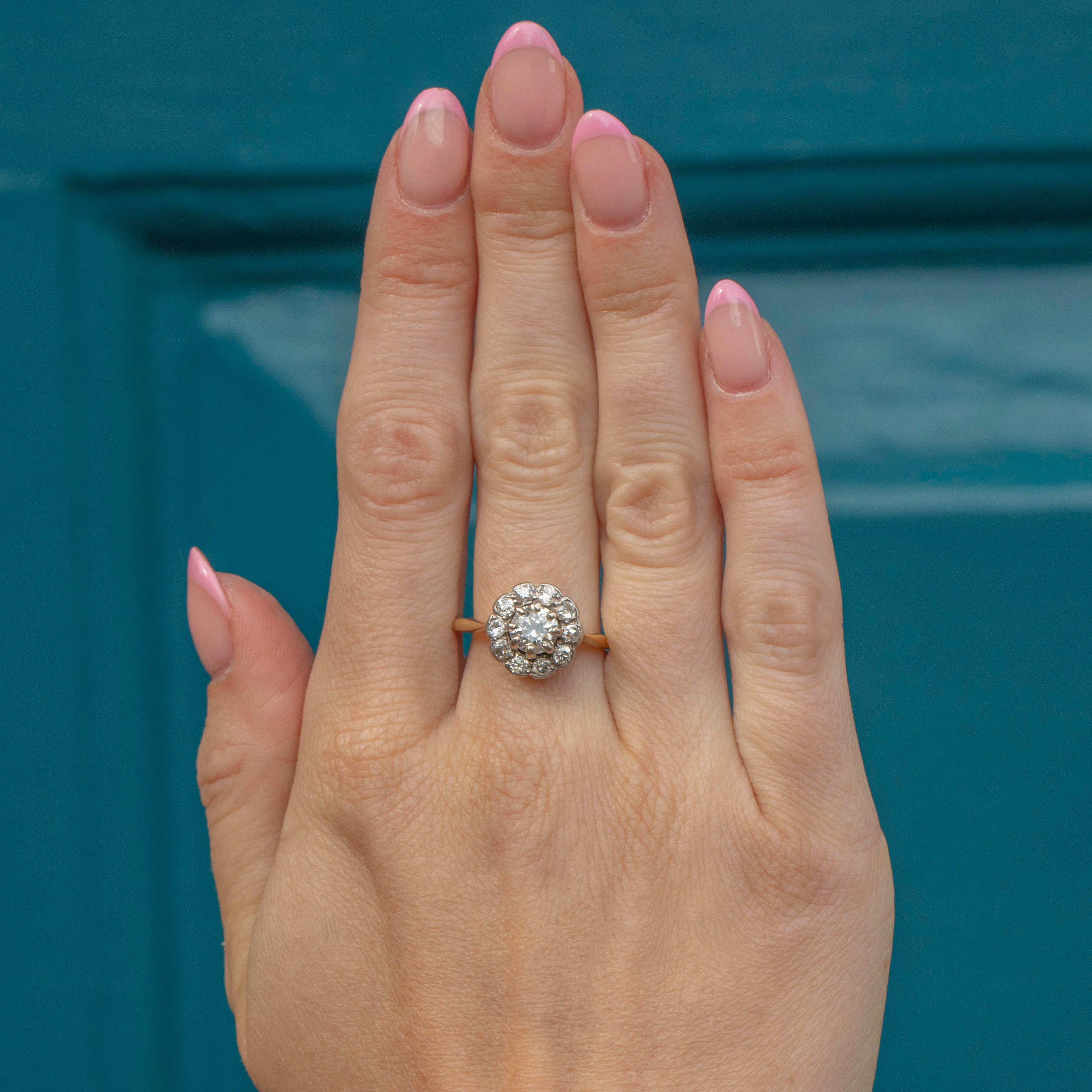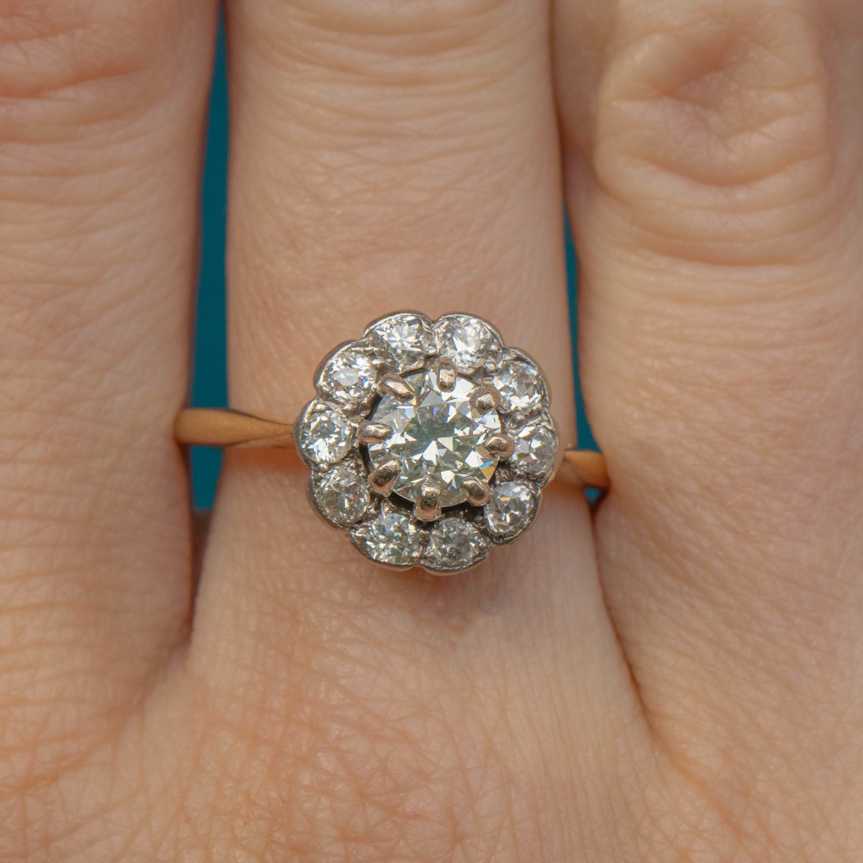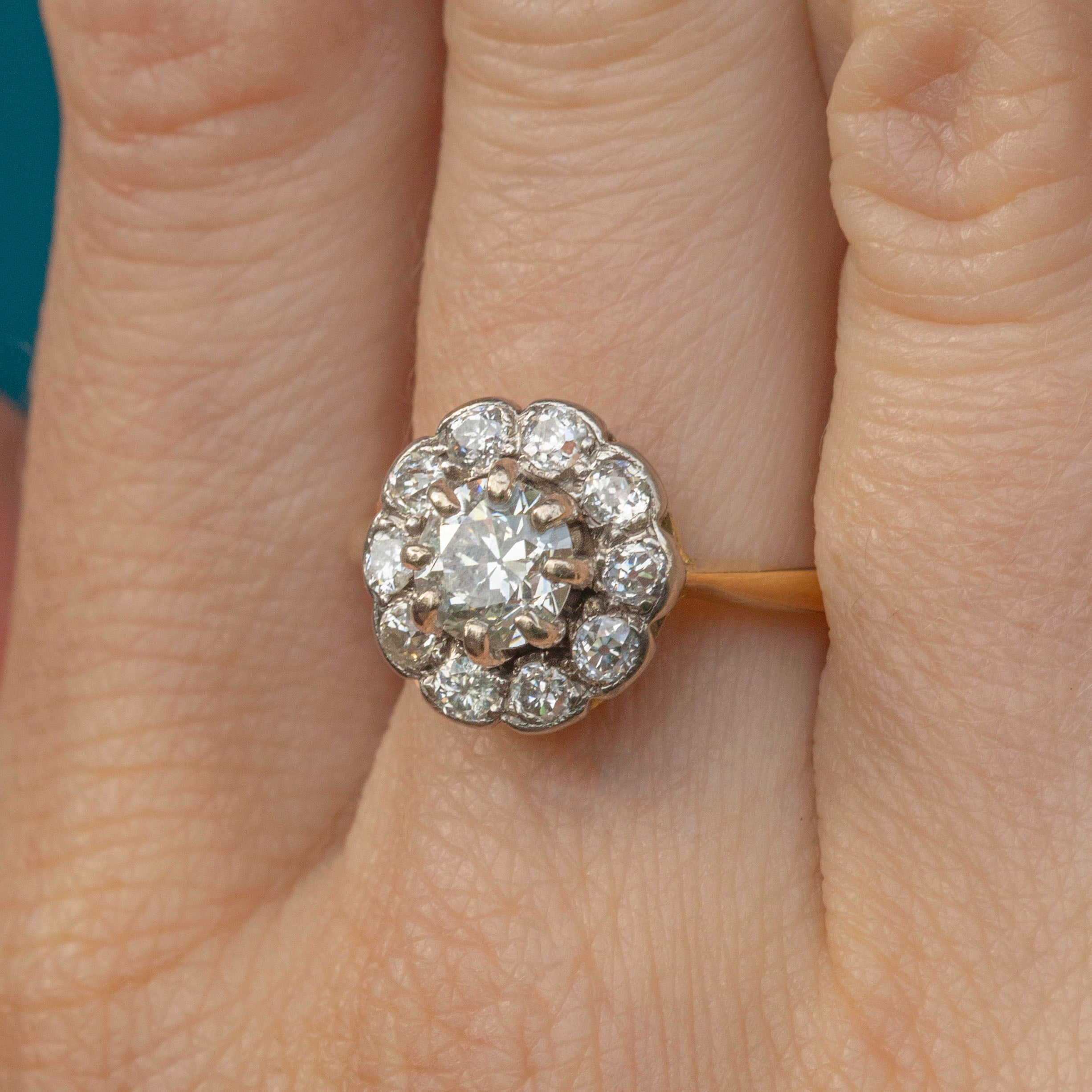 This exquisite antique 18ct Gold & Platinum Diamond flower ring showcases a captivating flower-shaped design, boasting a delectable 0.75ct central Old-European Diamond that will enchant any bride-to-be.
