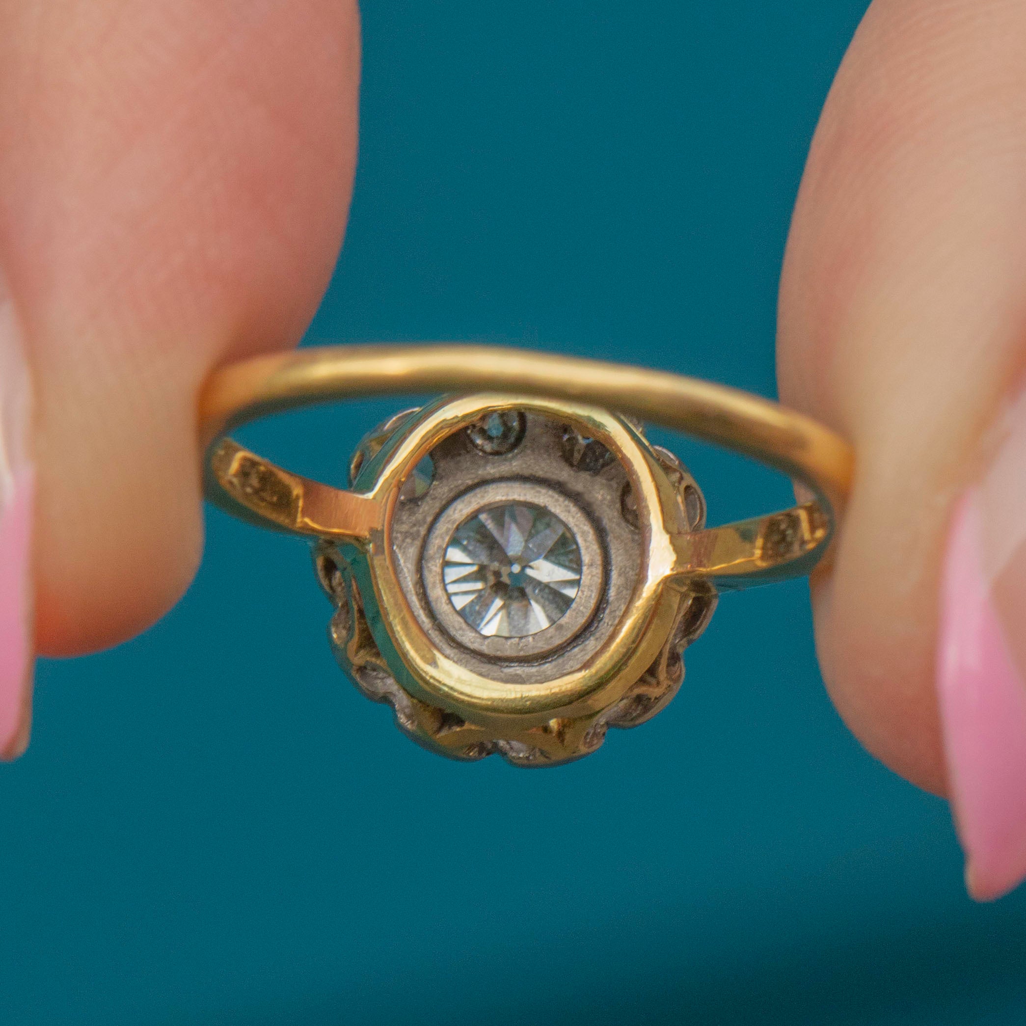 VERY GOOD. This antique 18ct Gold & Platinum Diamond flower ring is in wonderful condition. Her glistering Old-European Diamonds are all present and securely set in Platinum, and although her central Diamond has a tiny fleabite on her surface, this is only visible under close scrutiny with a jeweller's loop. Her 18ct Gold has aged well over the years with no scuffs or scratches to note. She is an absolute delight to behold!