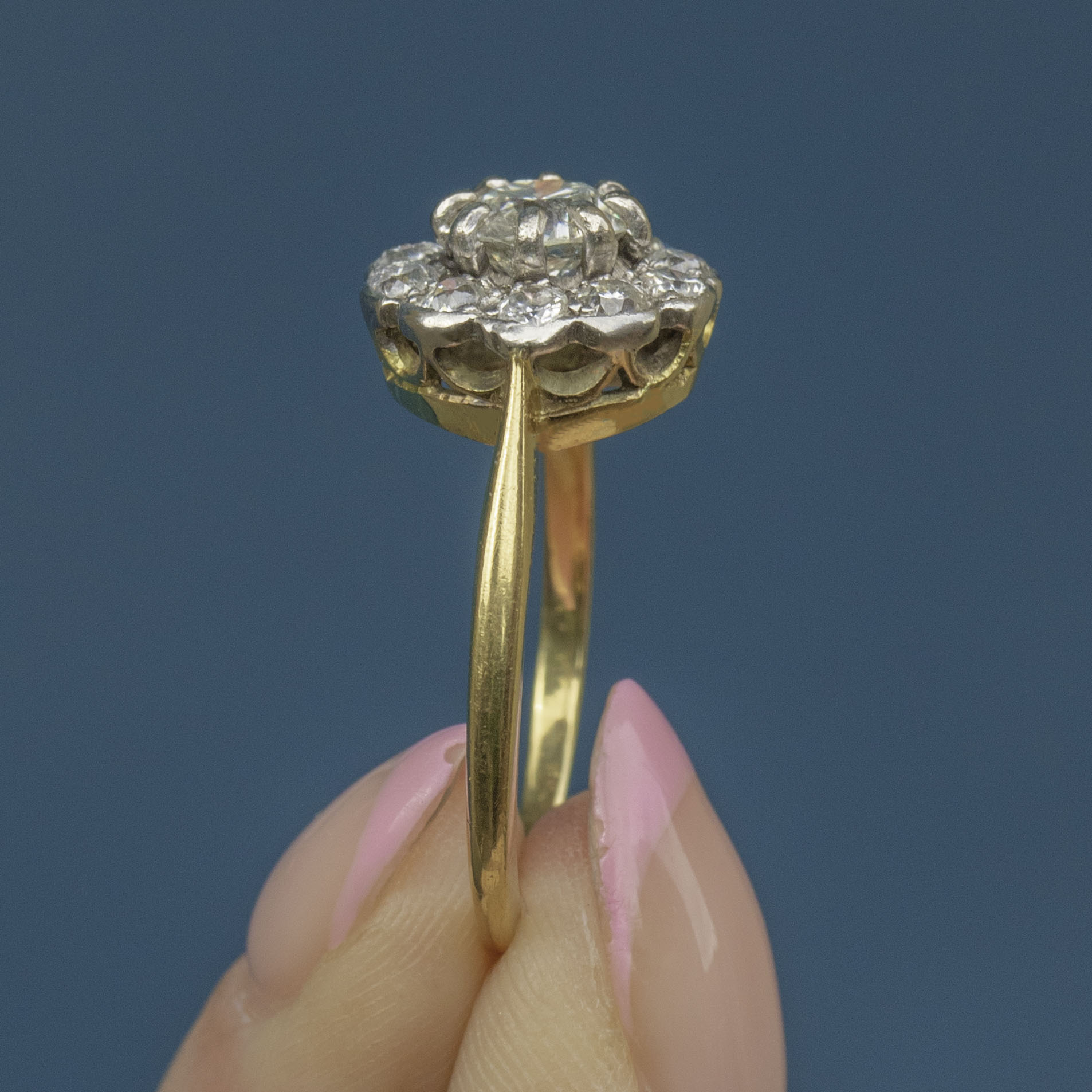 Antique 18ct Gold & Platinum Diamond Flower Ring, 0.75ct Central Old-European Diamond