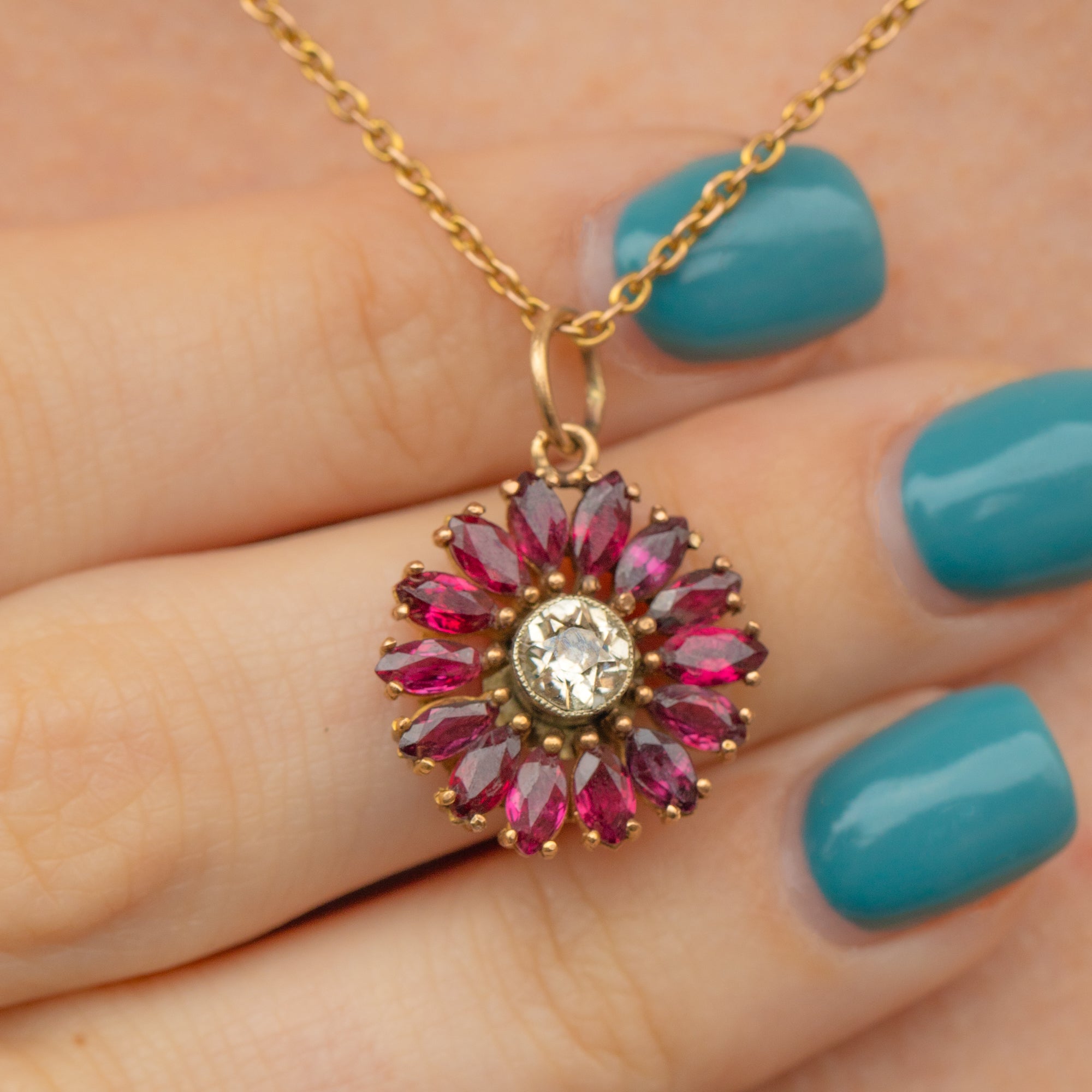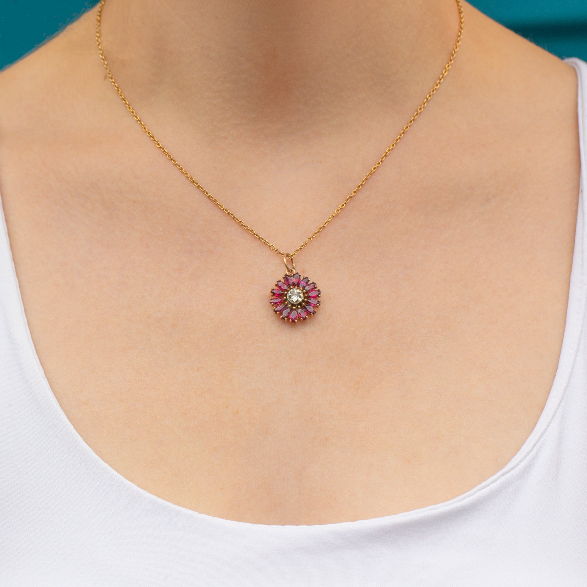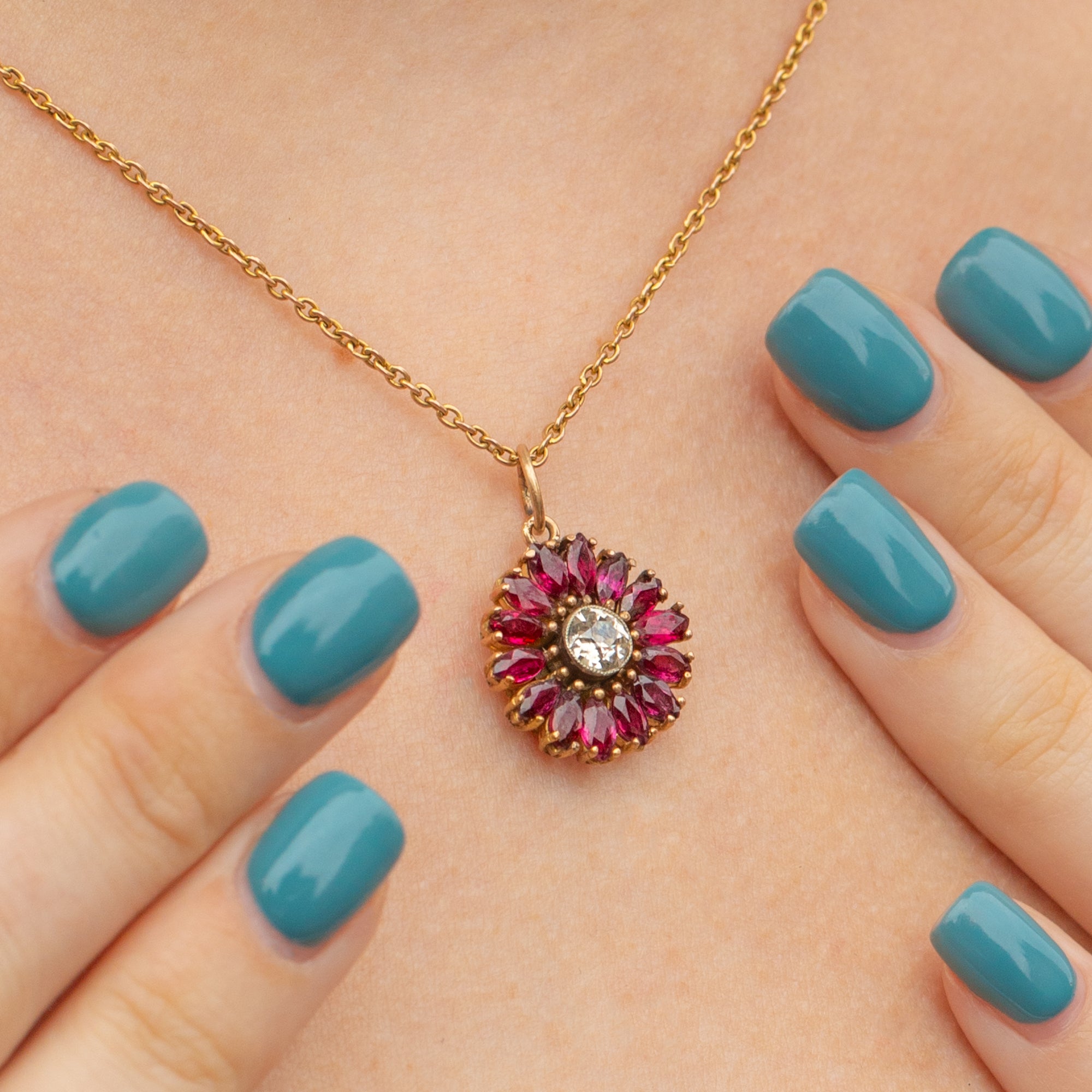We simply adore this 18ct Gold Ruby Diamond flower cluster pendant! Pretty pink Rubies halo a large 0.50ct Diamond, boasting a huge sparkle and crisp white colours forming her dinky daisy form. Rubies and Diamonds have been a popular pairing throughout the Edwardian period and it's clear to see why due to their undeniably feminine splendour.