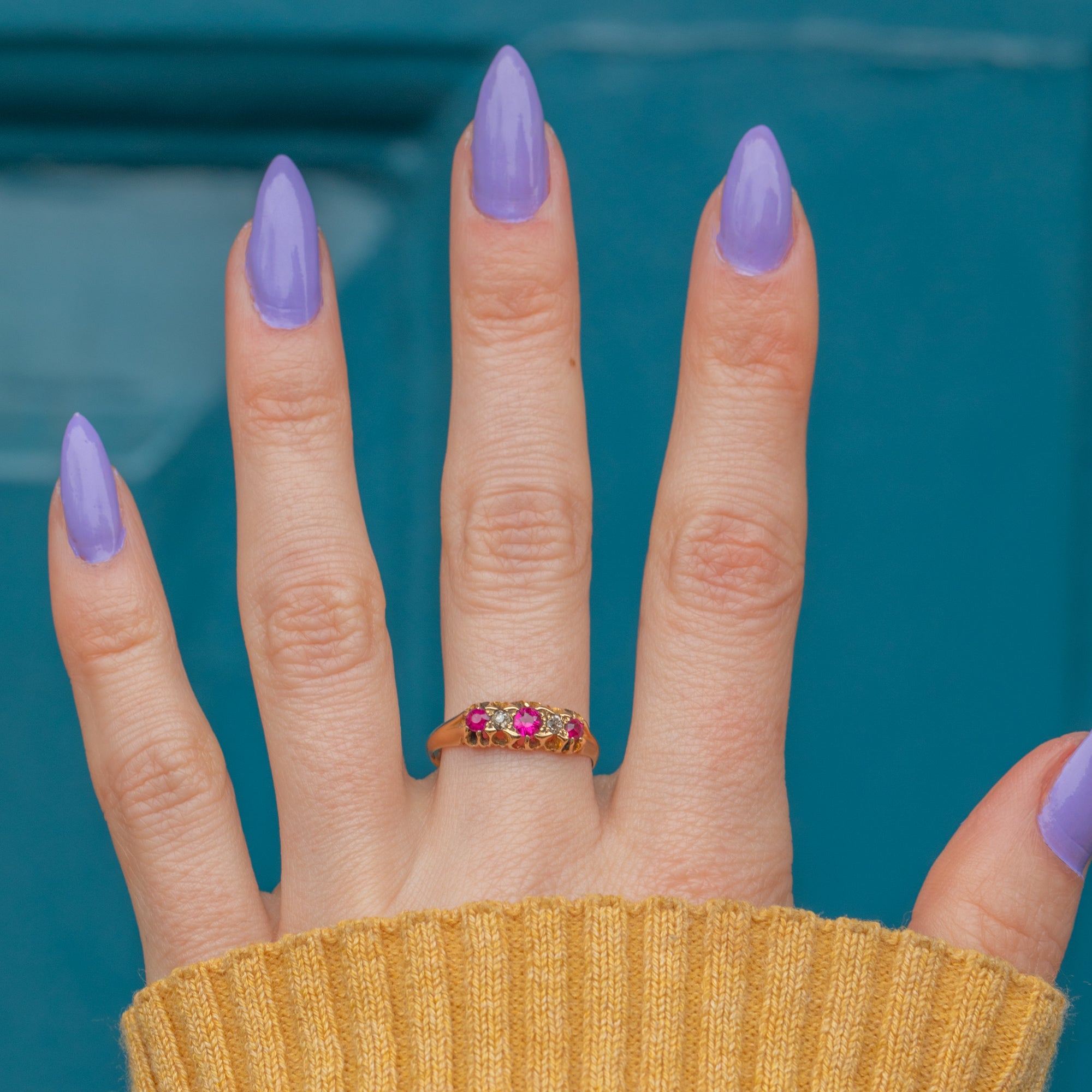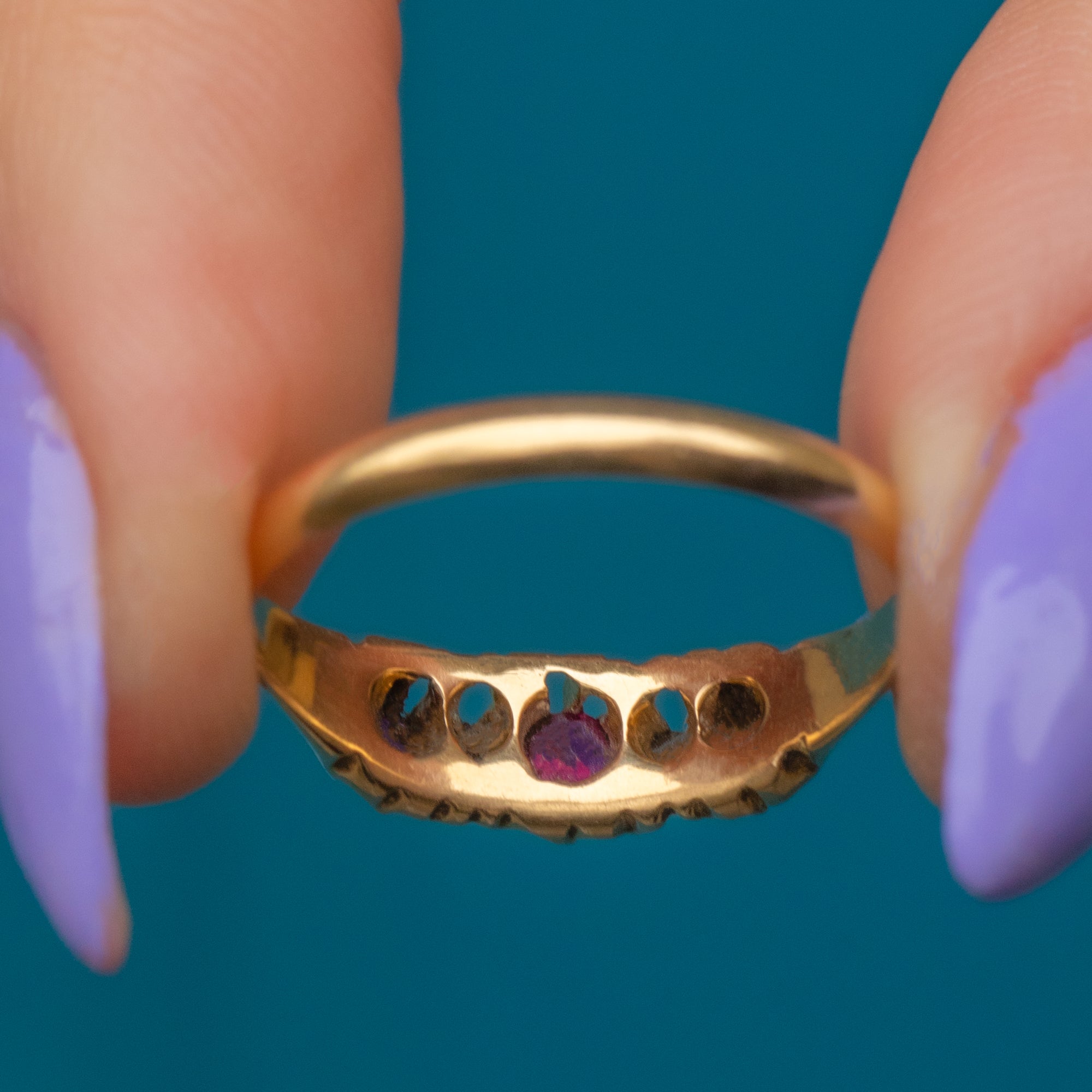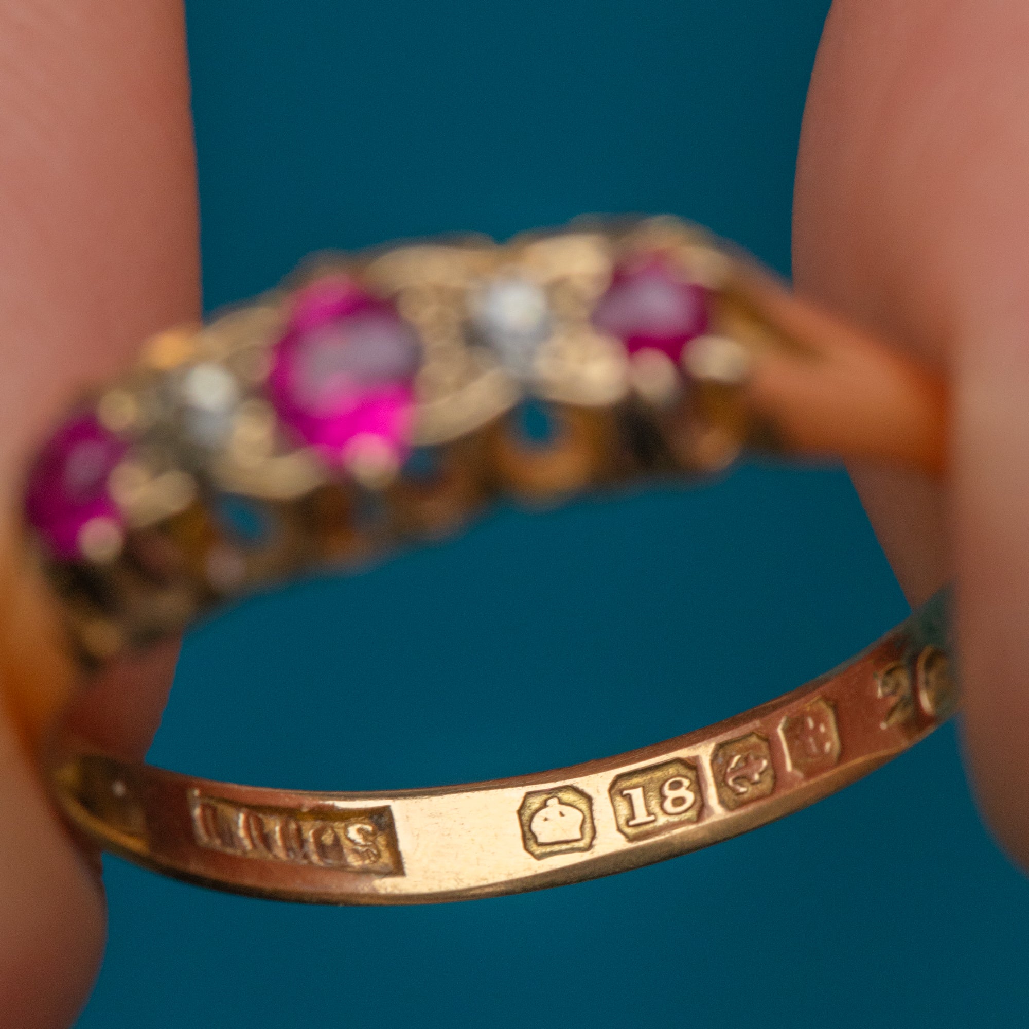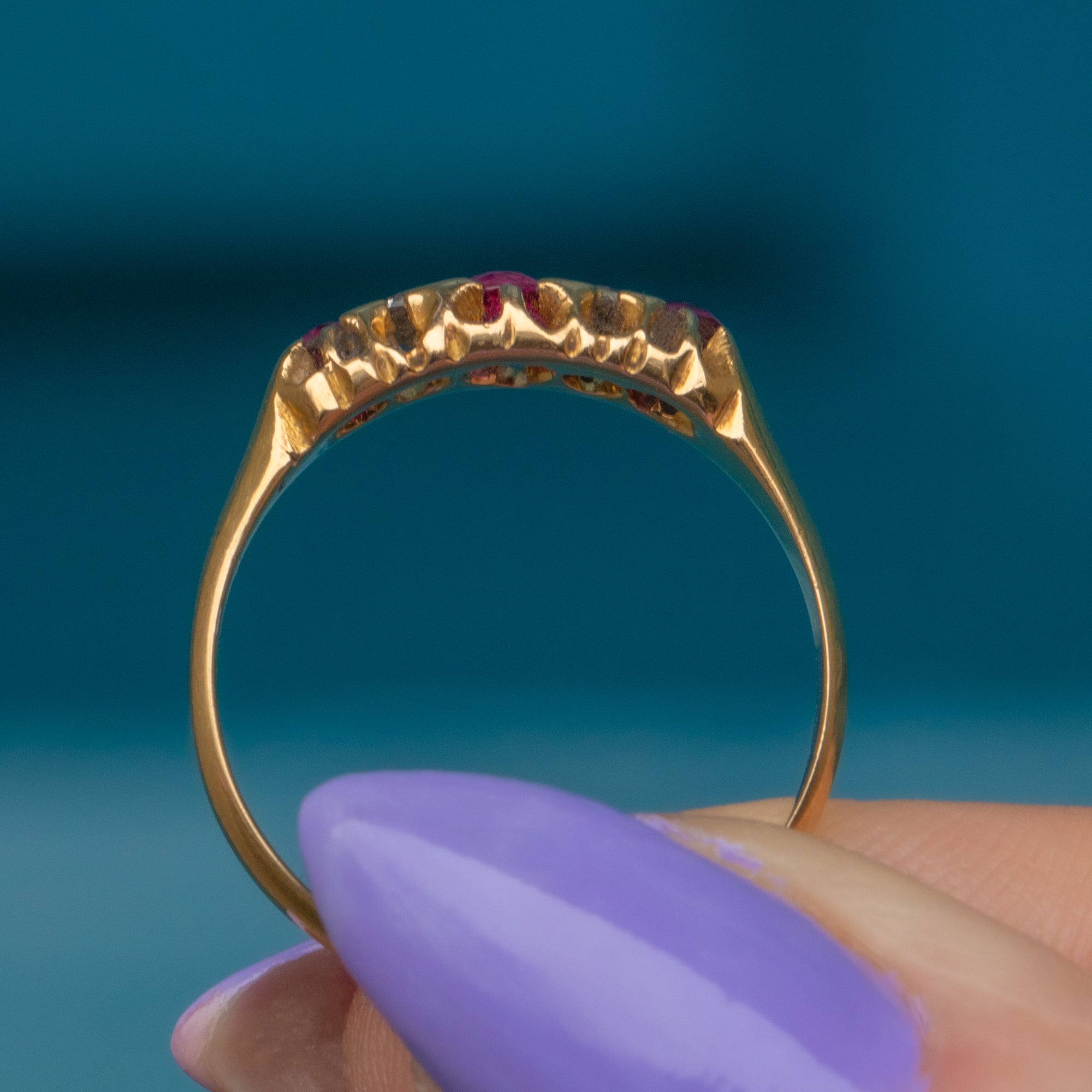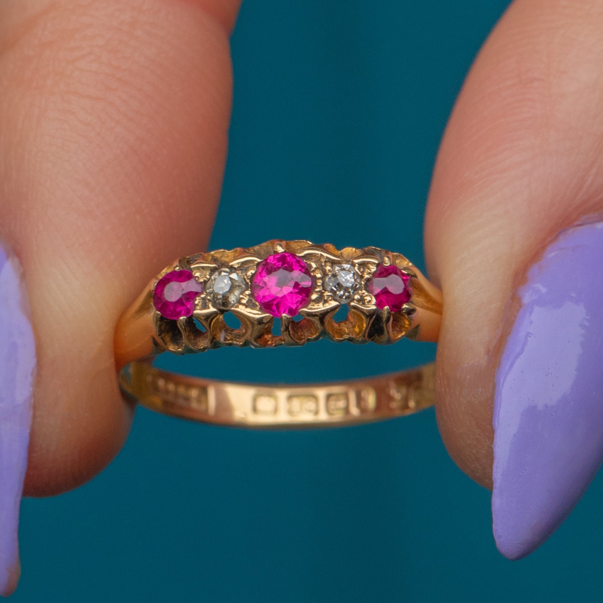 You are sure to get your sparkle fix with this piece with bright Diamonds nestling in between those wonderful Rubies. The ring band is crafted from solid 18ct Gold and hallmarked to 1918, making this piece all the more special!