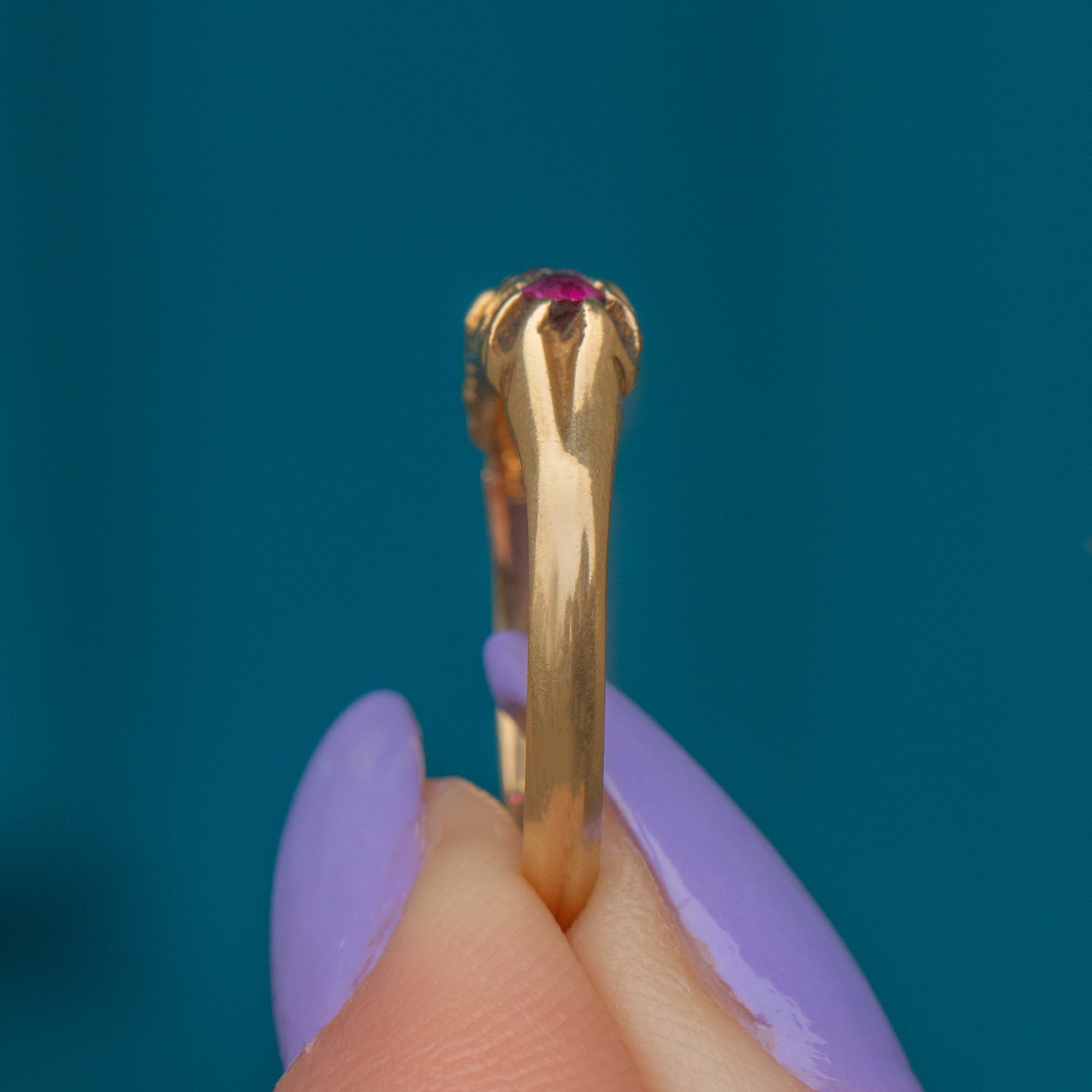 MATERIALS: Tests as 18ct Gold, Ruby (0.40ct), Diamond.