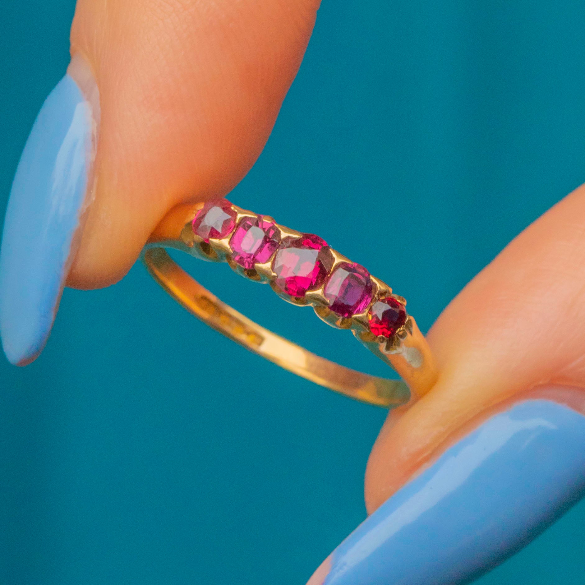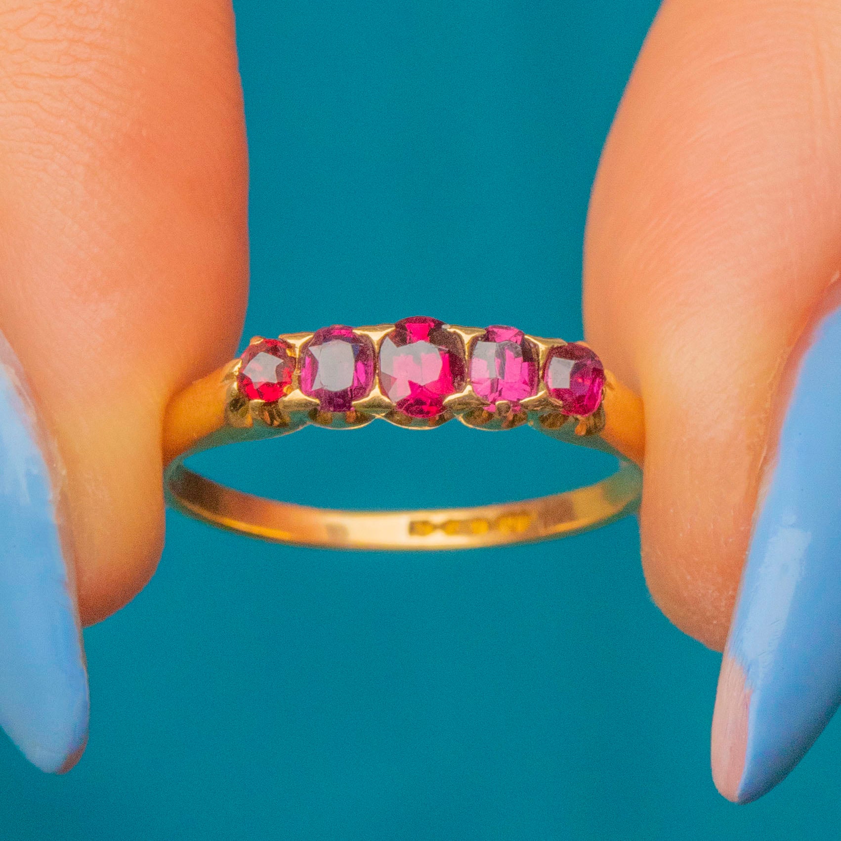 VERY GOOD-EXCELLENT. This antique 18ct Gold Ruby five stone ring is in excellent overall condition. The Rubies are securely set and display vibrant hues with only minor surface wear consistent with age. The Gold band shows light wear, typical of antique jewellery, but remains intact and free from significant dents or damage, with a full set of English hallmarks inside!