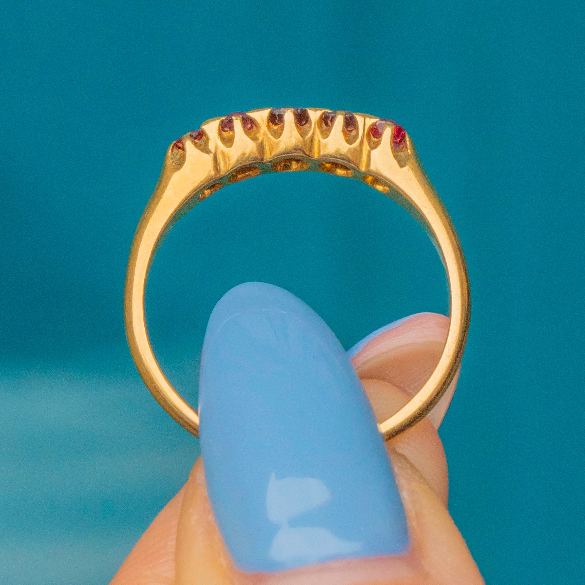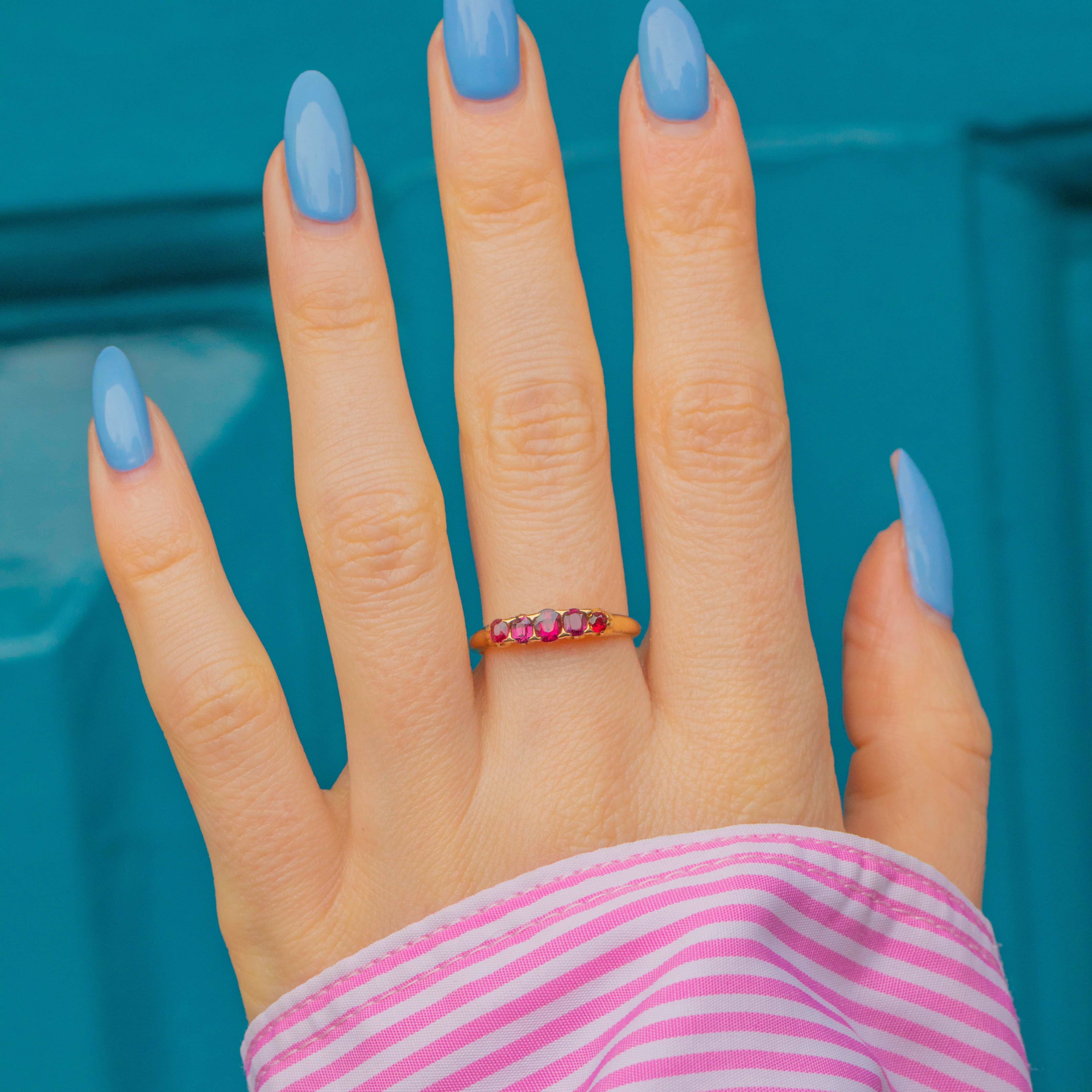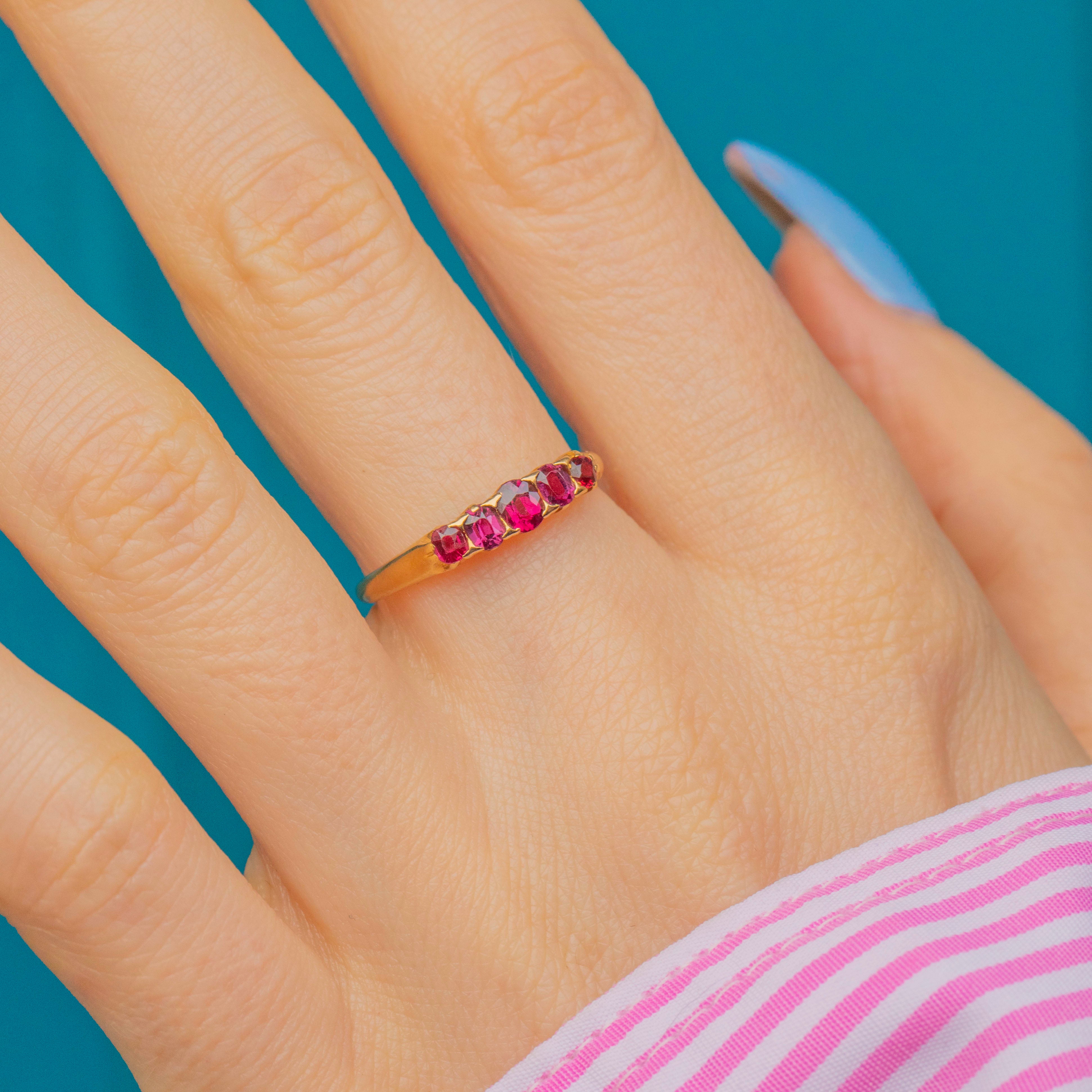 This sultry antique 18ct Gold Ruby five stone ring is bright, versatile and easy to wear!