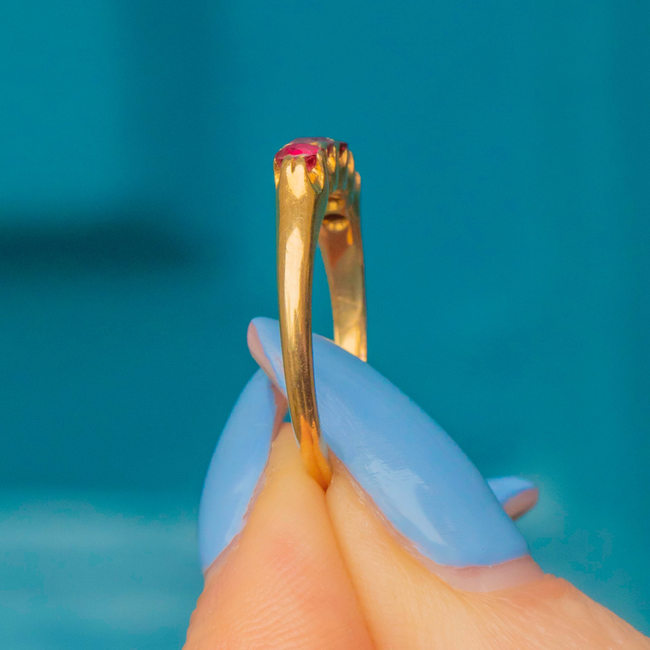 The ring is fully hallmarked to the year 1915 and is set with five beautiful natural Rubies with a combined weight of 0.25ct. They have a gorgeous bright pink hue that pops against the Gold and the tapered band is effortlessly falttering!