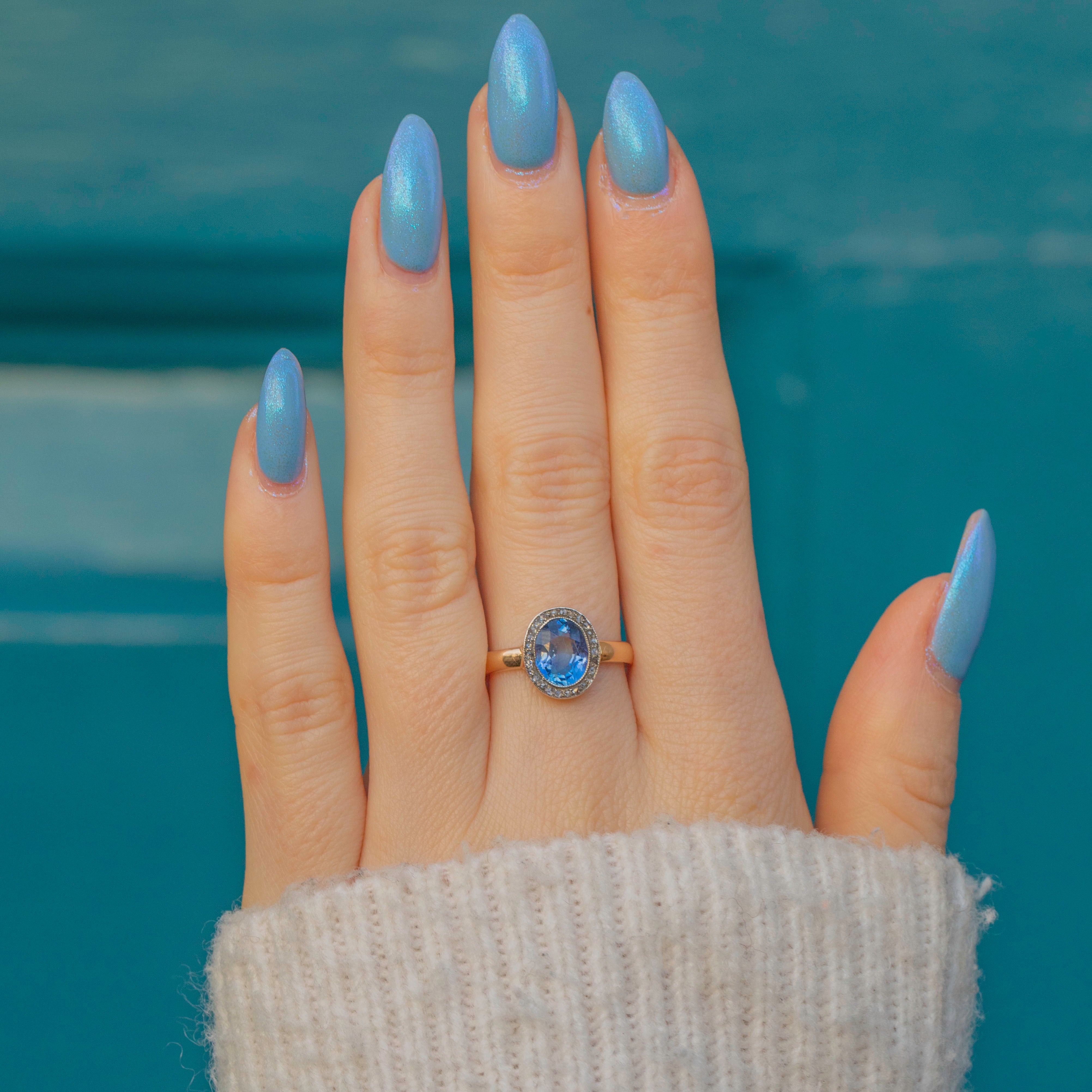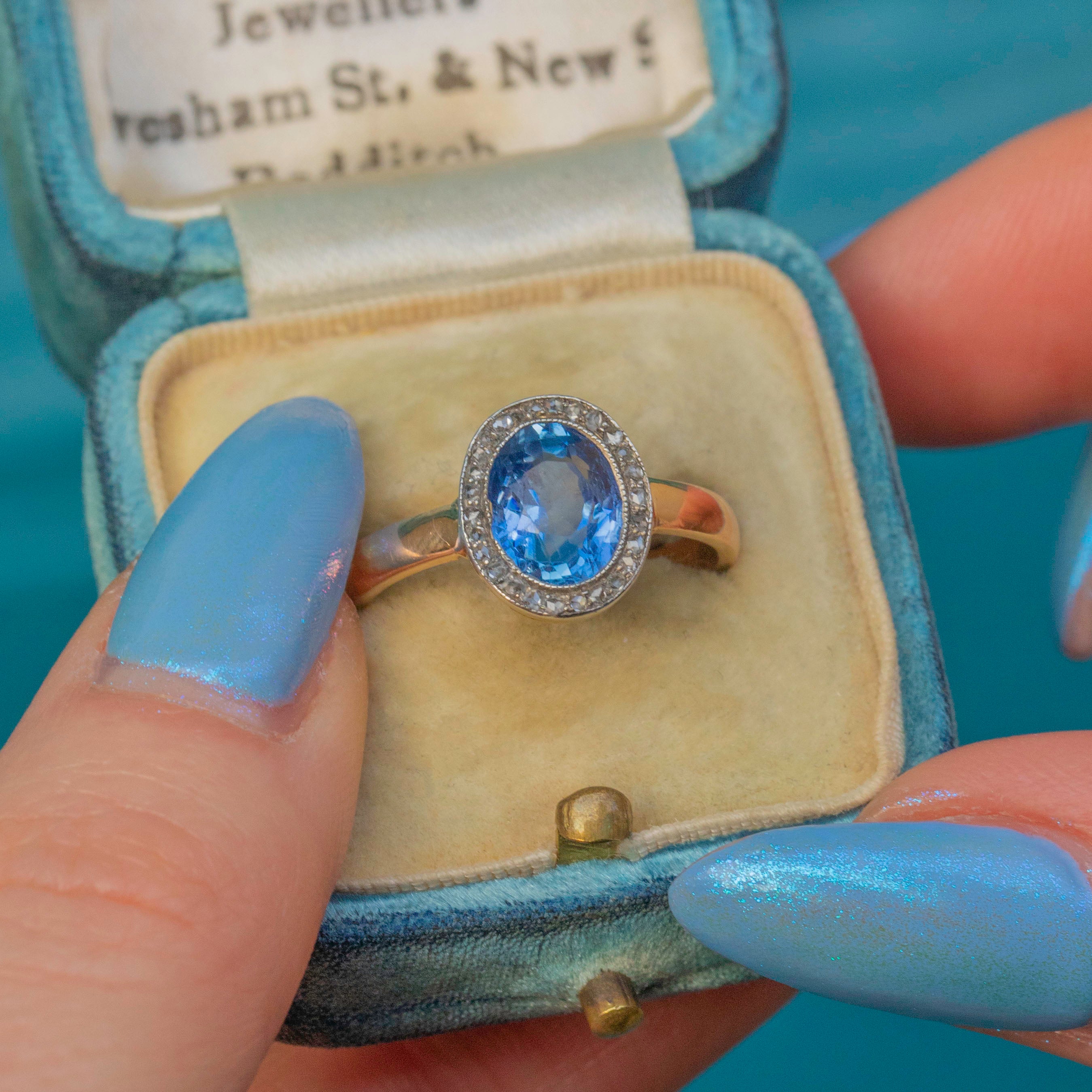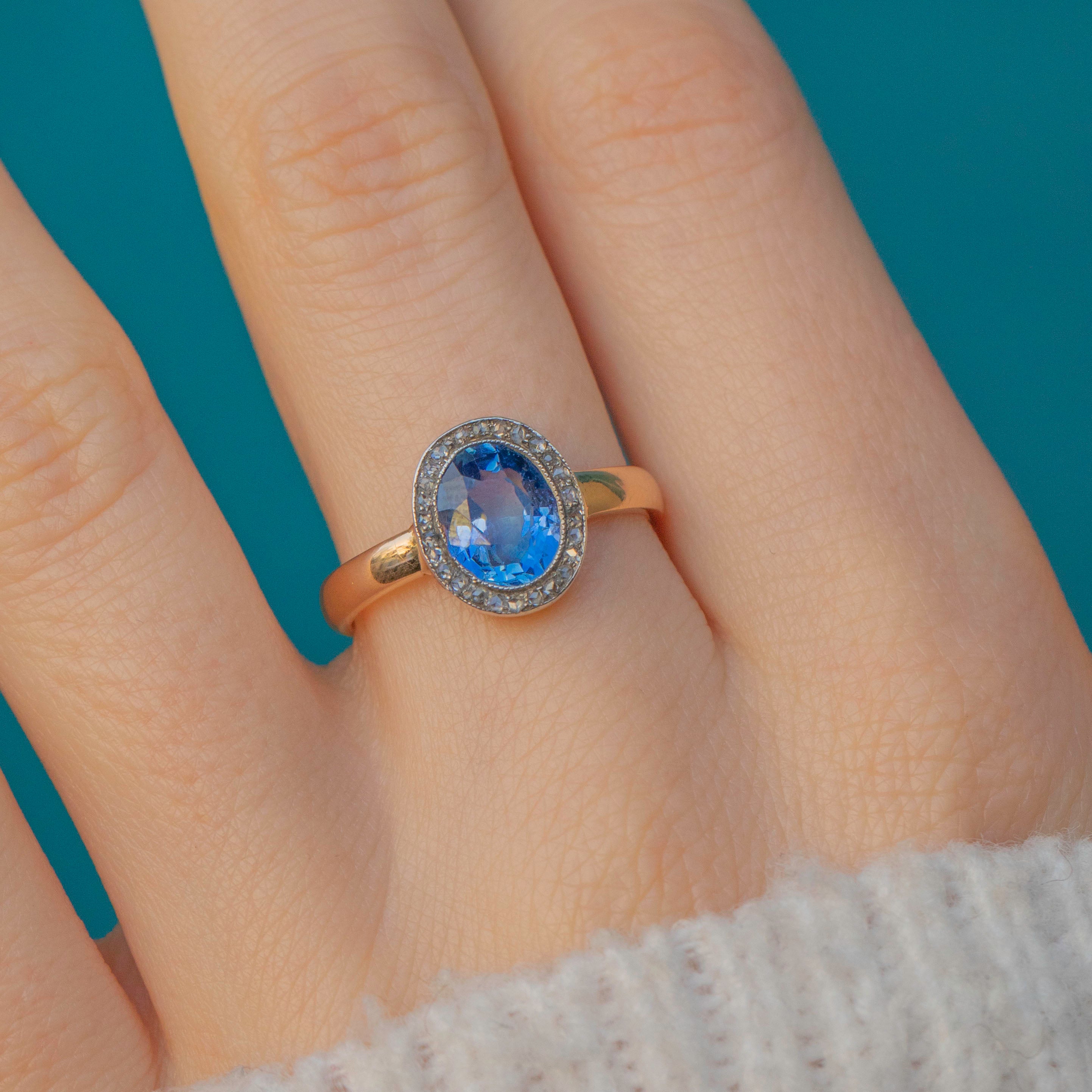 This antique 18ct Gold Sapphire Diamond cluster ring is the epitome of elegance! Crafted from solid 18ct Gold with Silver settings, as was typical of the era, this ring features a 1.65ct natural, no heat, deeply saturated blue Sapphire, haloed by scintillating rose-cut Diamonds.