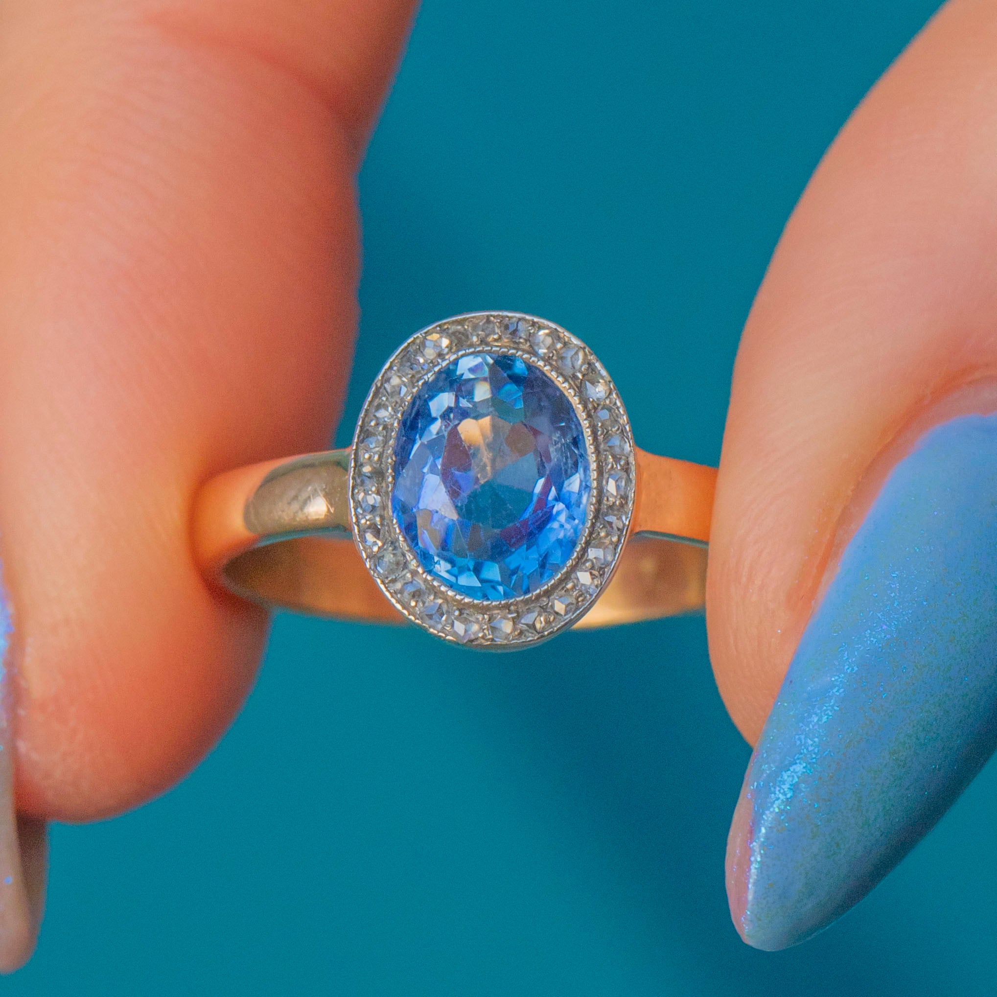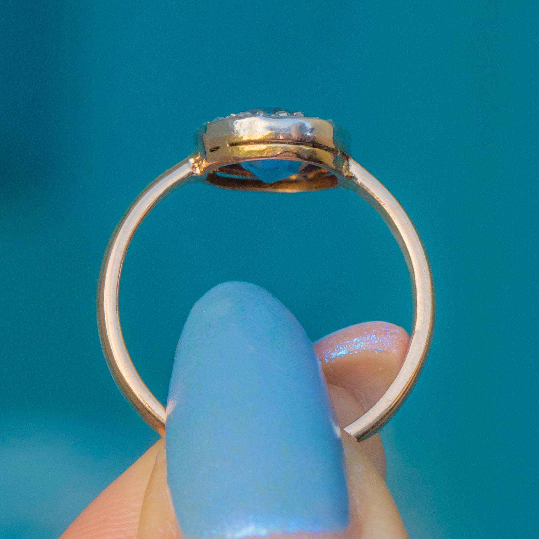 MATERIALS: Tests as 18ct Gold, Silver, Natural unheated Sapphire (1.65ct), Rose-cut Diamond.