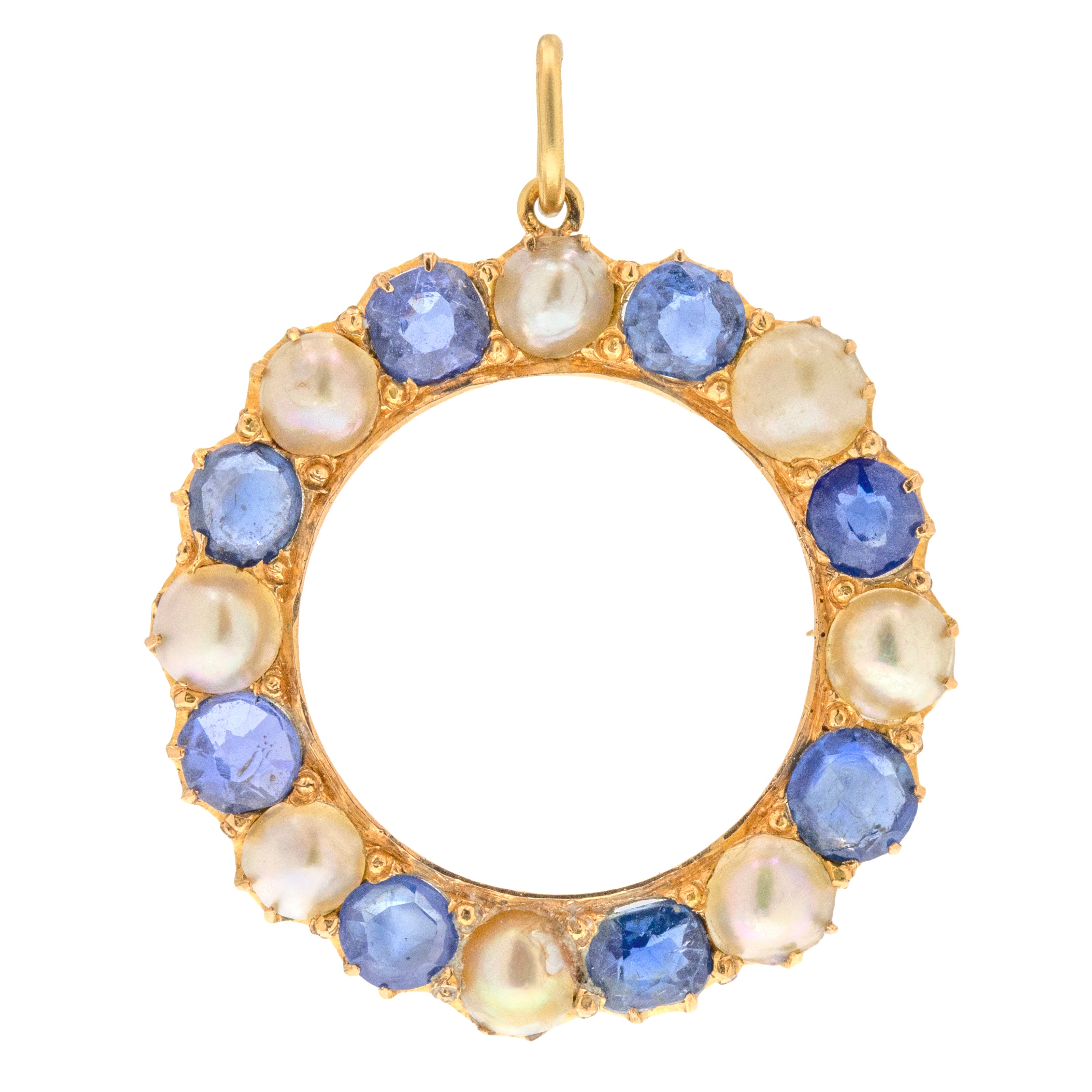 Antique 18ct Gold Sapphire Pearl Roundel Pendant, 3.00ct