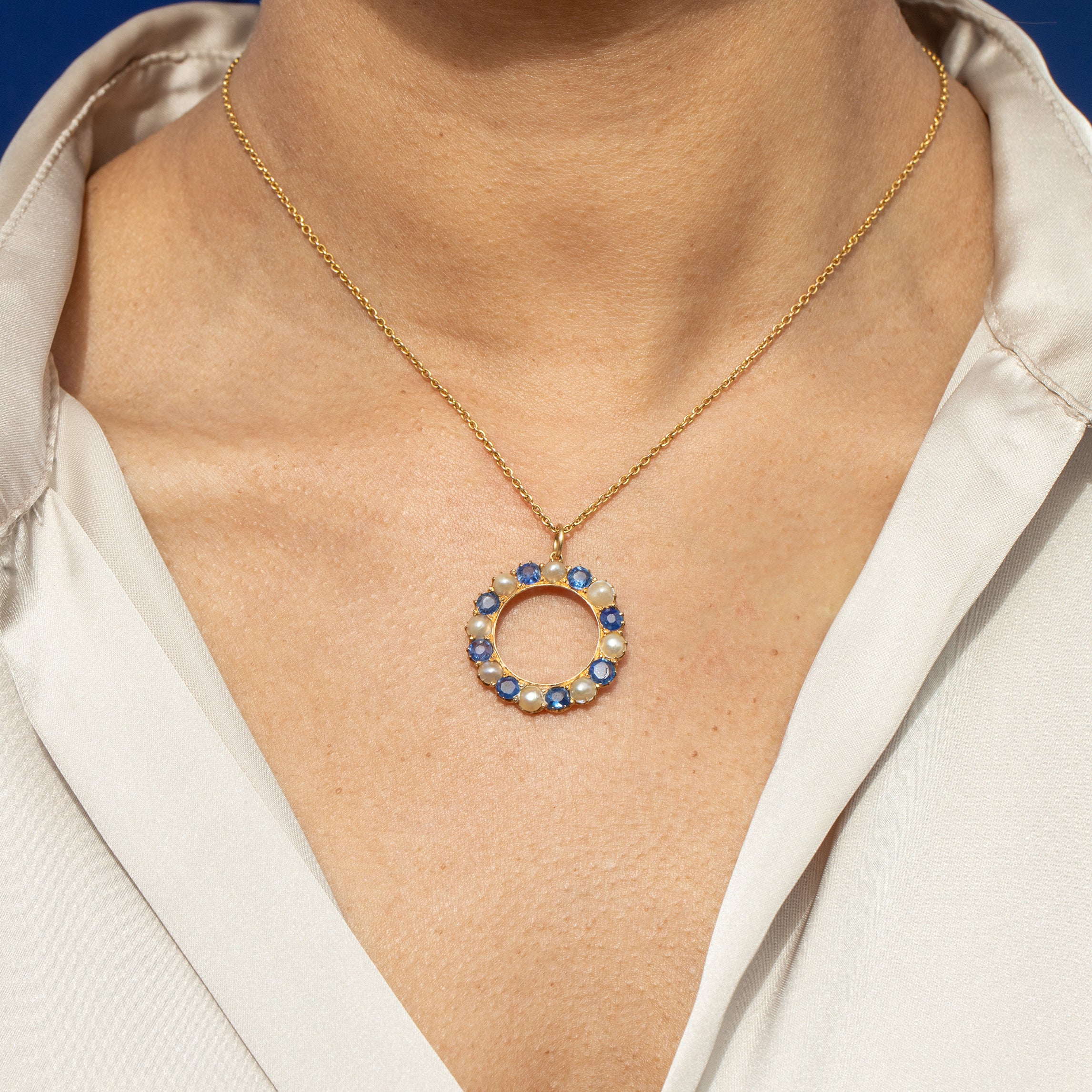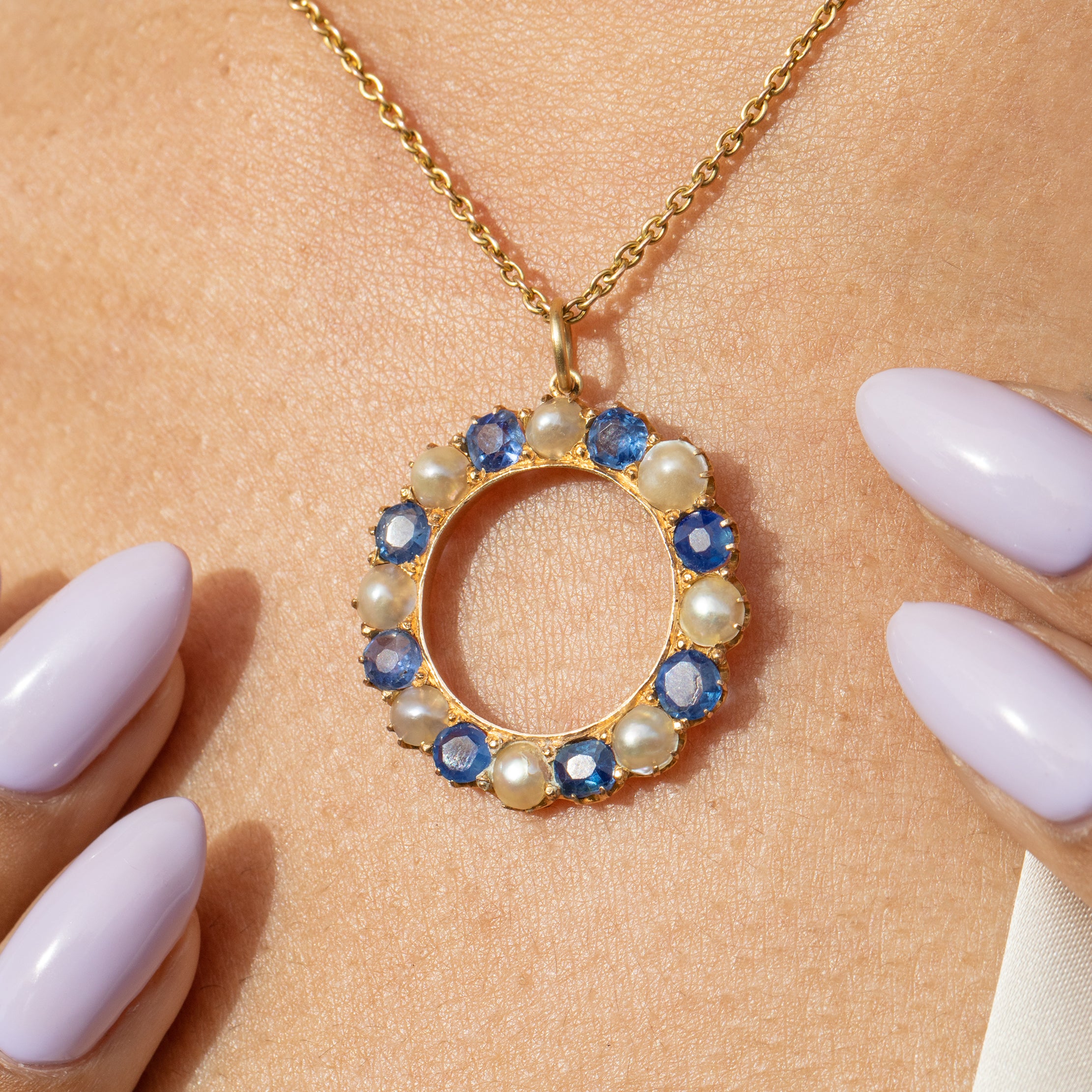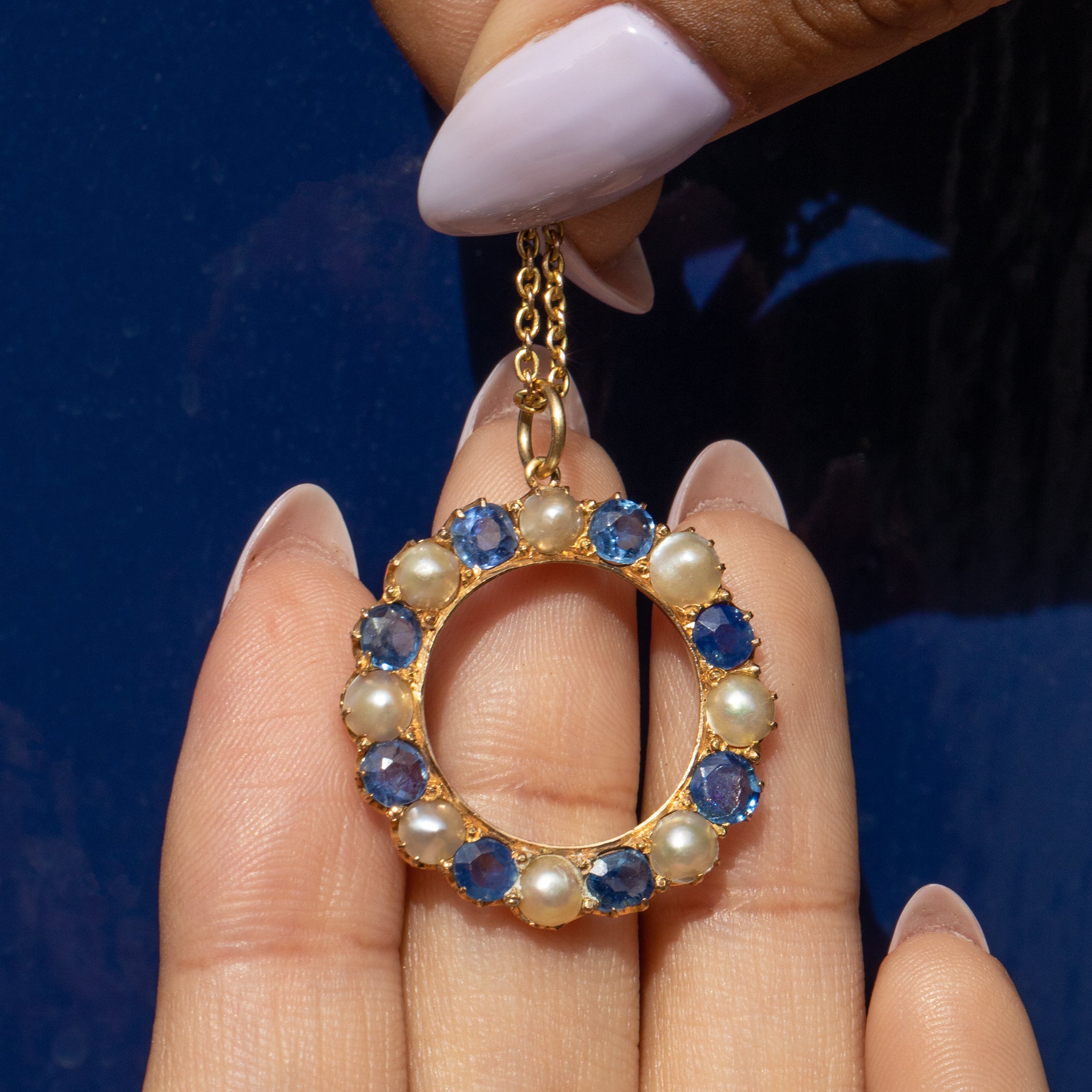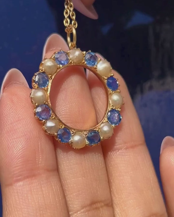 This antique 18ct Gold Sapphire Pearl roundel pendant is a testament to the craftsmanship of the Victorian era! Crafted from lustrous 18ct Gold and adorned with a captivating arrangement of deep blue Sapphires and creamy Pearls, this antique pendant will add a touch of luxury to your collection.
