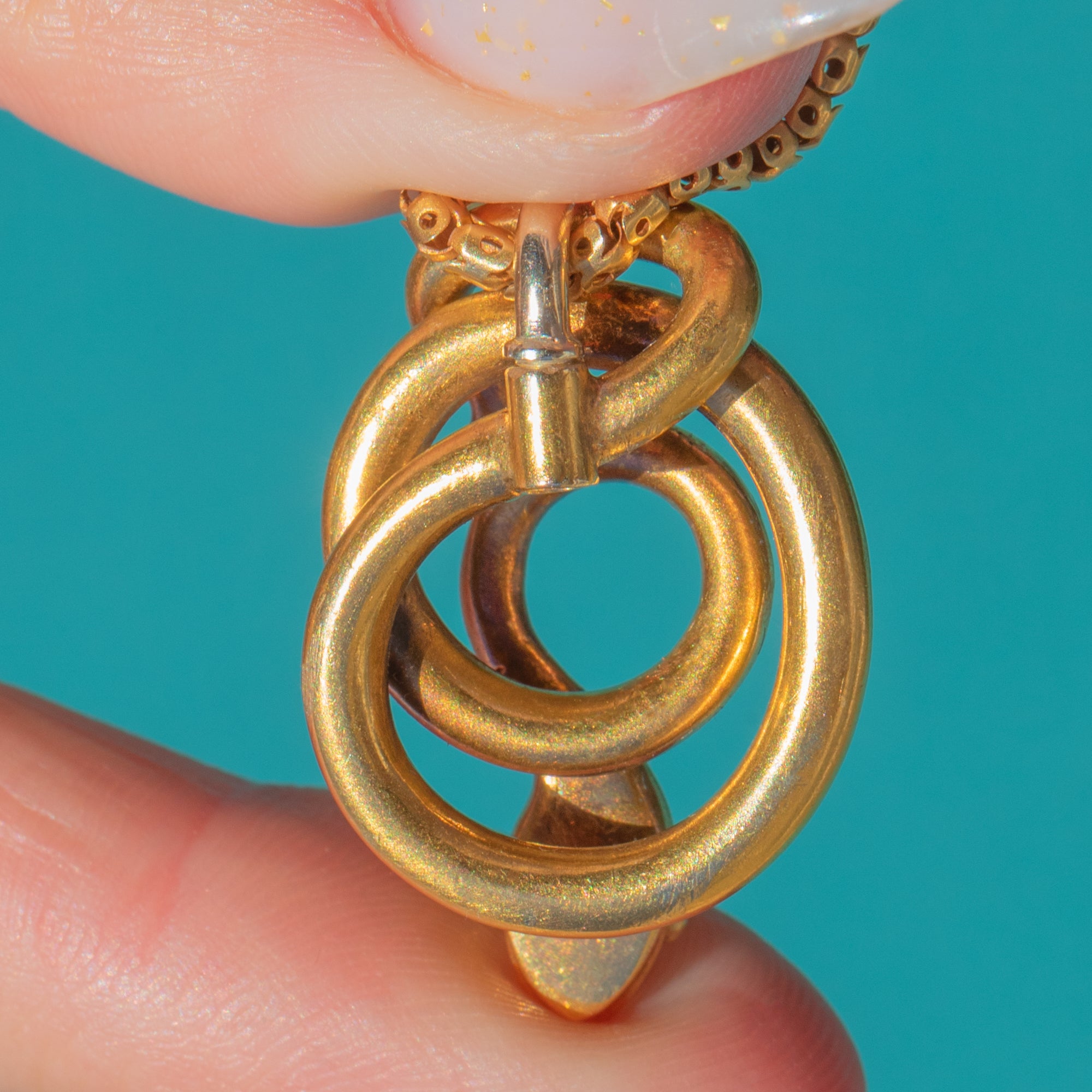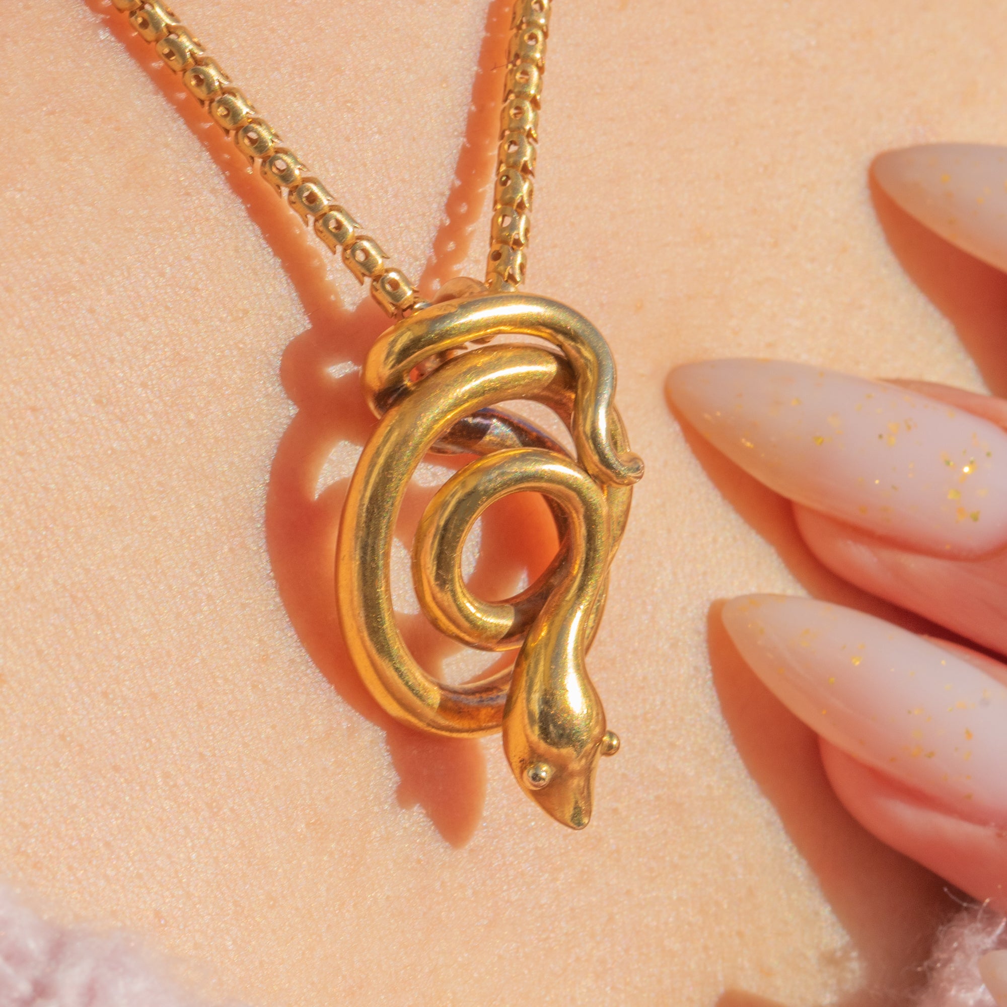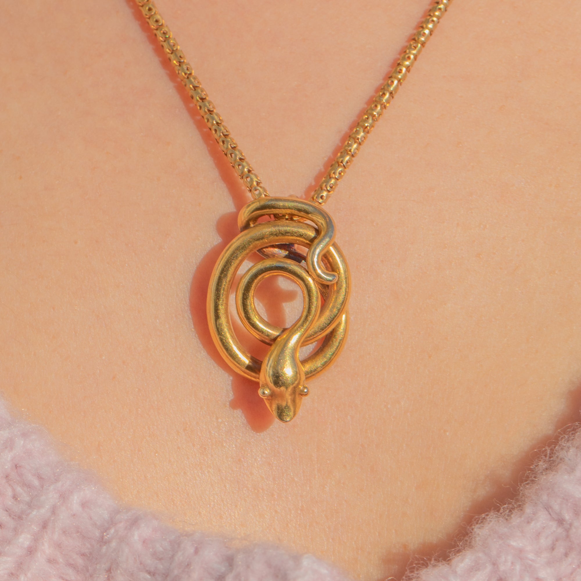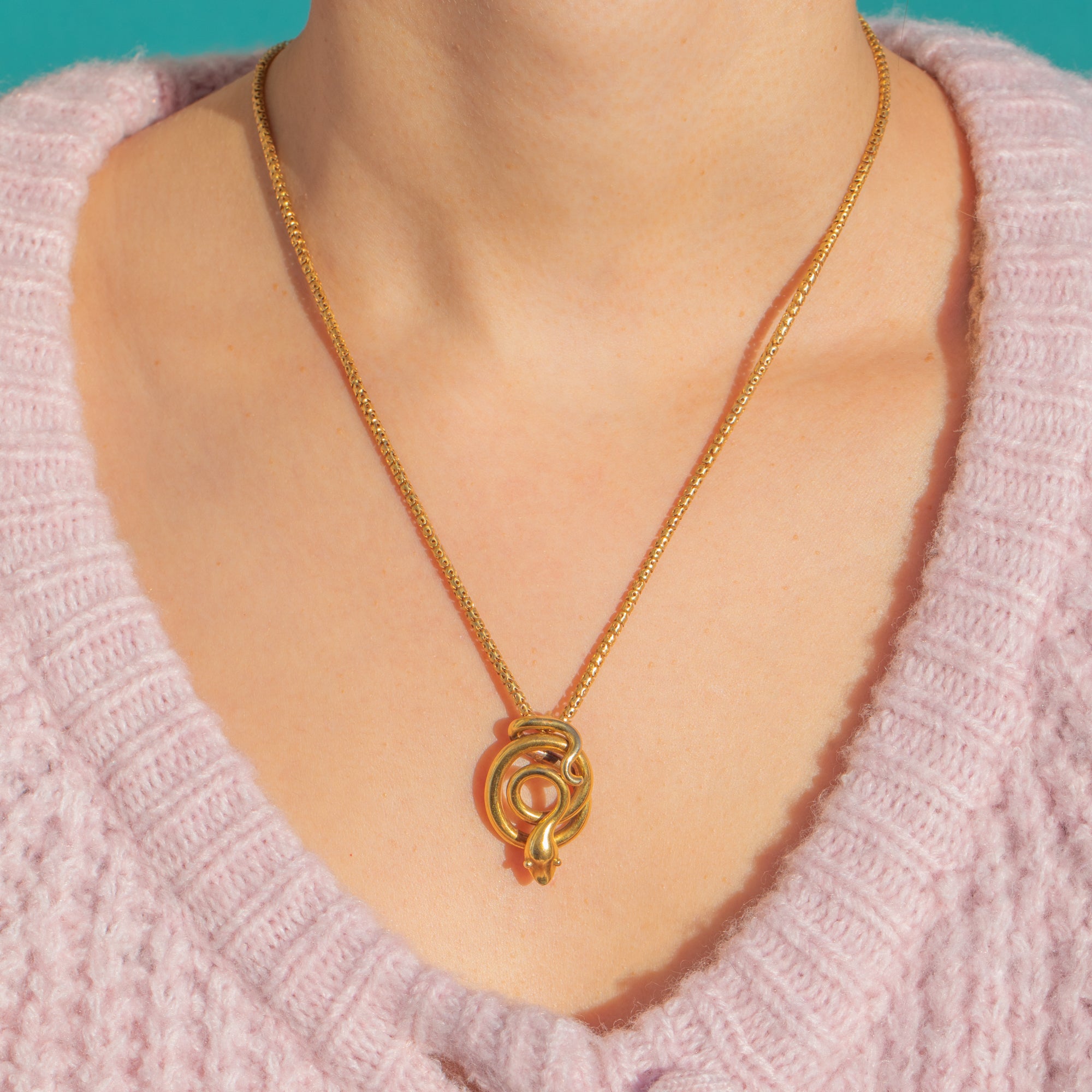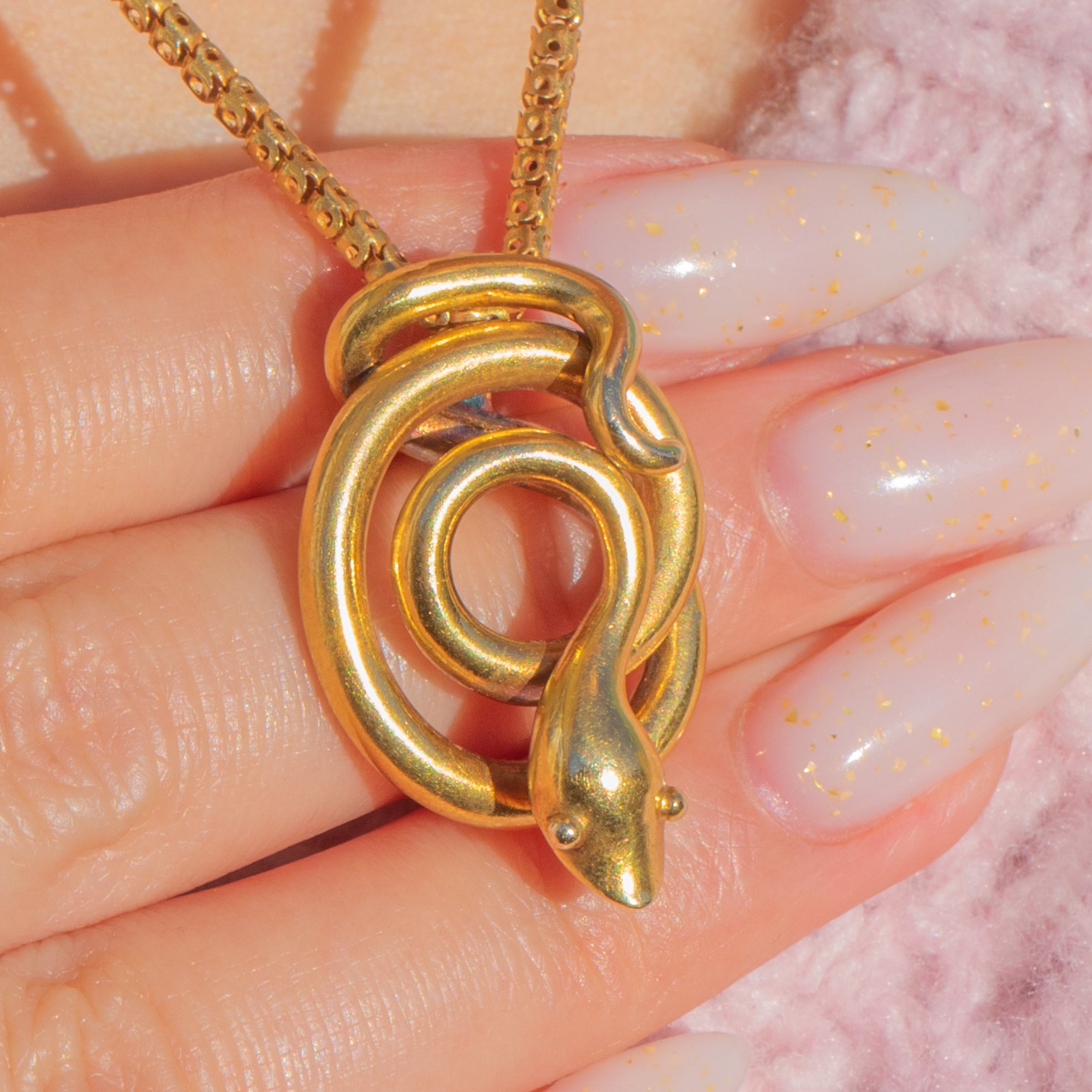 Sleek, symbolic and beautifully sculptural, this Victorian 18ct Gold snake pendant coils into a smooth, compact loop with tiny engraved eyes and an integrated top coil bail. Its polished surfaces gleam with a warm antique patina for that effortless, talismanic allure.