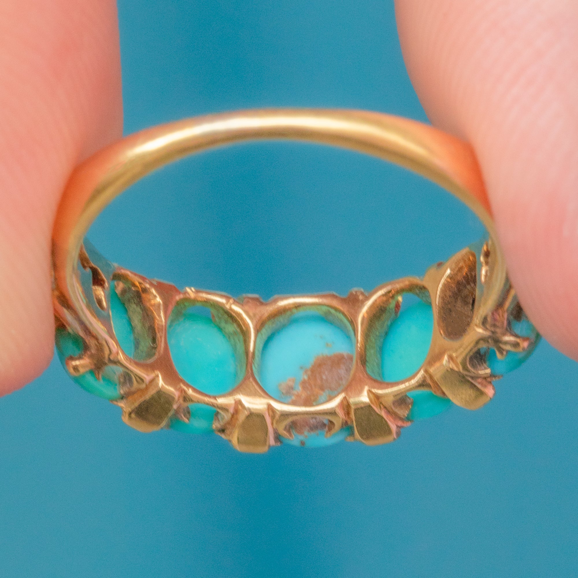 VERY GOOD. This antique 18ct Gold ring has five secure Turquoise gems set within it, as well as small but twinkly Diamond spacers. The ring wears comfortably, and the only thing to note is a slight resize mark towards the back of the band. There is some of the Turquoise's natural matrix present, only visible at the back.
