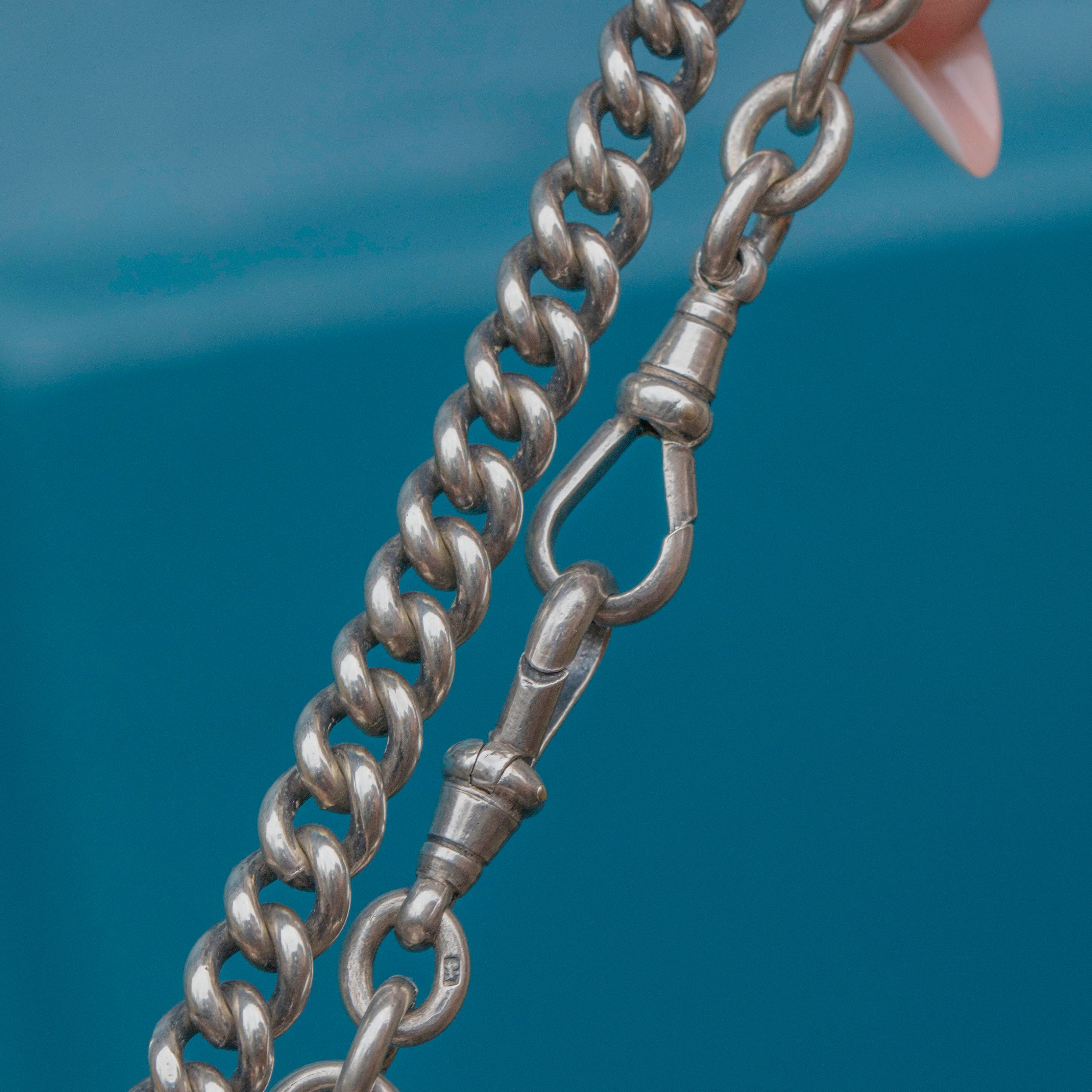 VERY GOOD-EXCELLENT: This antique Silver Albert chain is in superb condition. The links are uniform and secure, and her dog-clips are in perfect working order. There are some minor signs of wear to the Silver commensurate with age, however, this is difficult to spot without a jeweller's loupe. In great condition, this Victorian chain is a must-have!