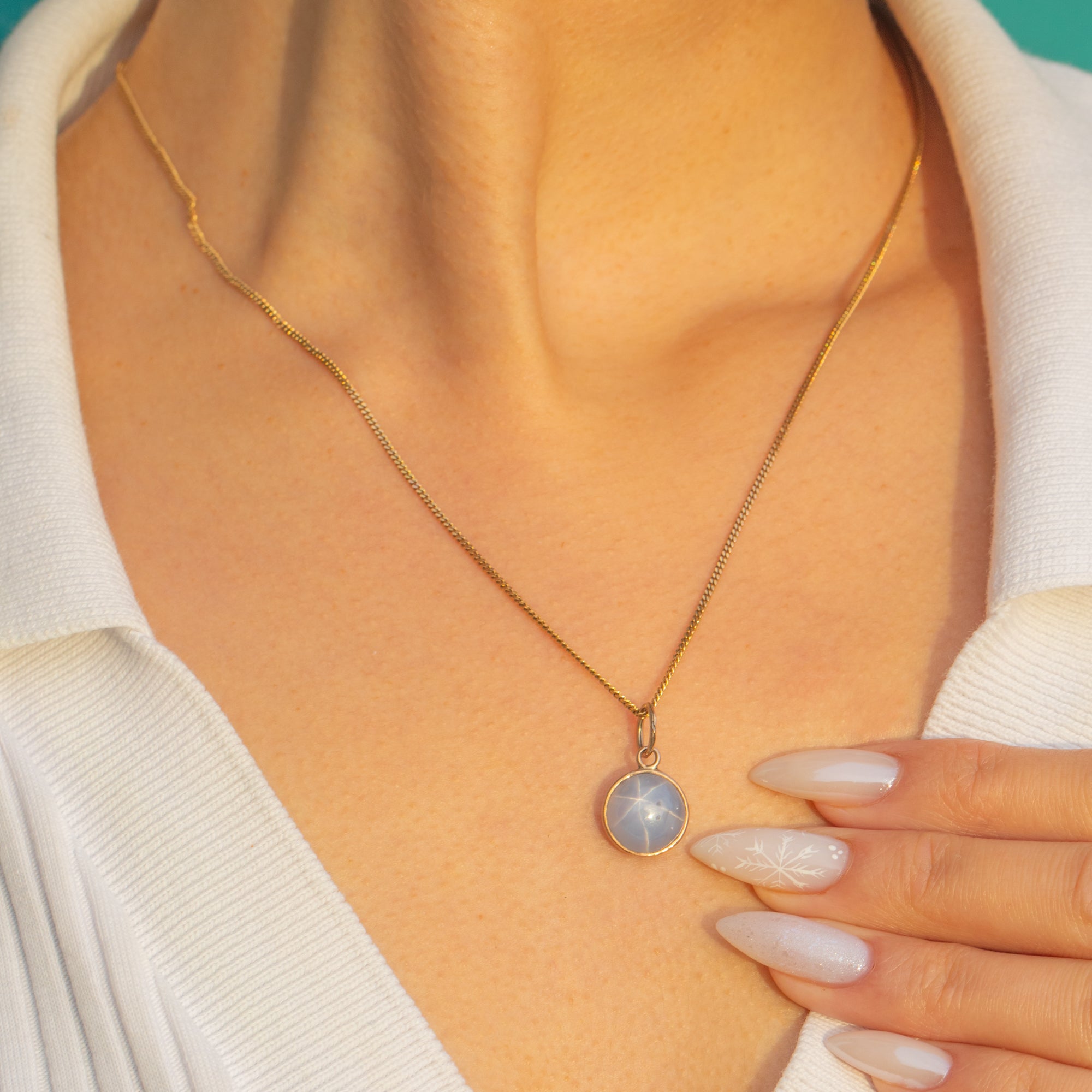 EXCELLENT: The Star Sapphire presents beautifully with only the most delicate natural surface features visible under magnification. The 9ct Gold rub-over setting is smooth and secure, and the split ring bale is in excellent order. Overall, minimal wear consistent with age, suggesting the piece has been well cared for.