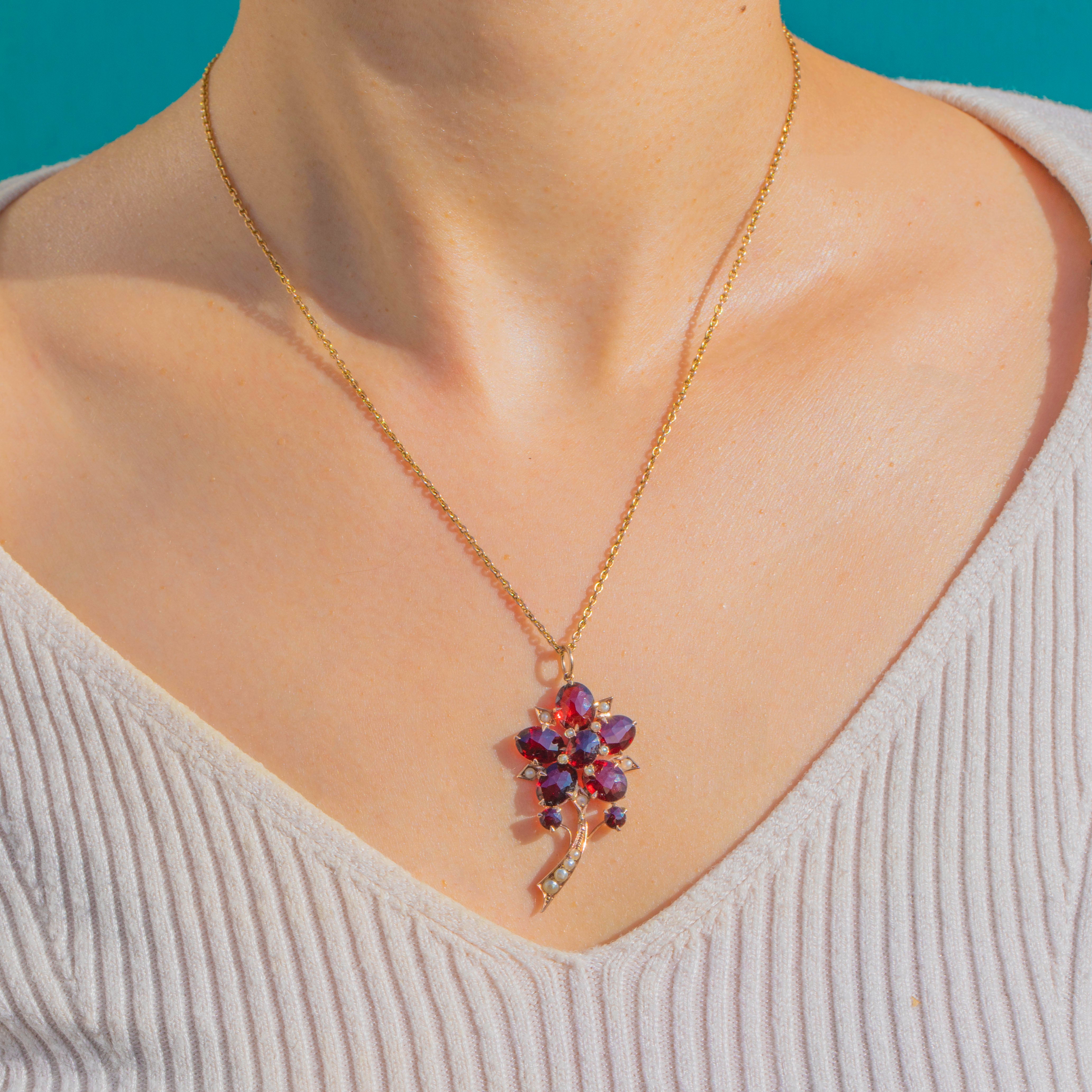 A quintessential Victorian beauty, this pendant unfurls as a floral spray of deep wine-red Garnets set in warm 8ct Gold, tapering to a graceful foliate stem kissed with creamy Seed Pearls. The articulated, hand‑assembled construction lends a subtle, elegant movement, while the rich tones of the Garnets glow against the buttery Gold.