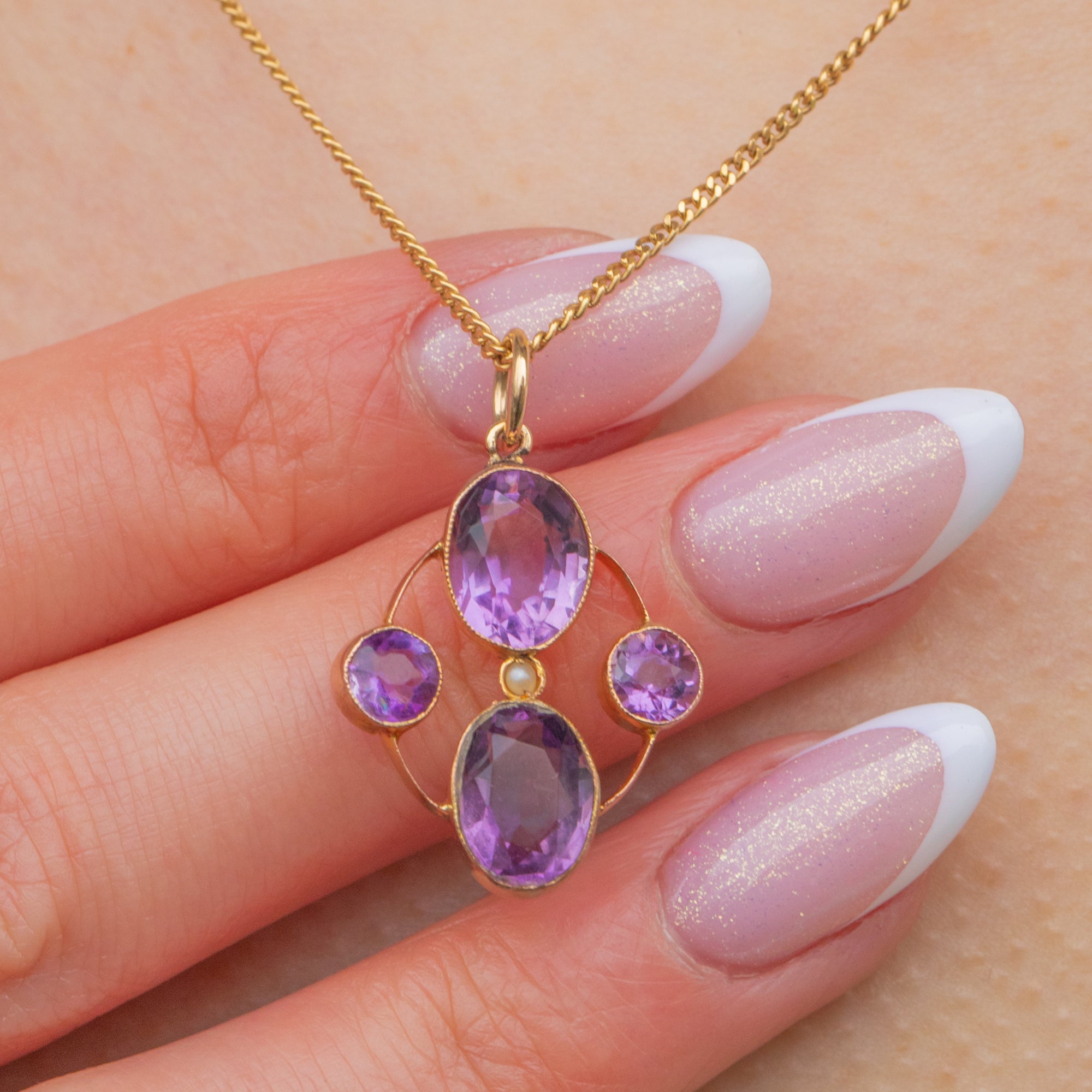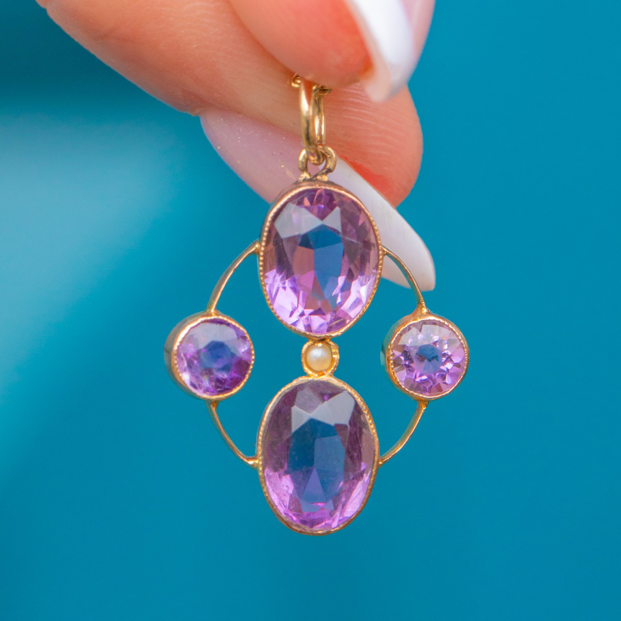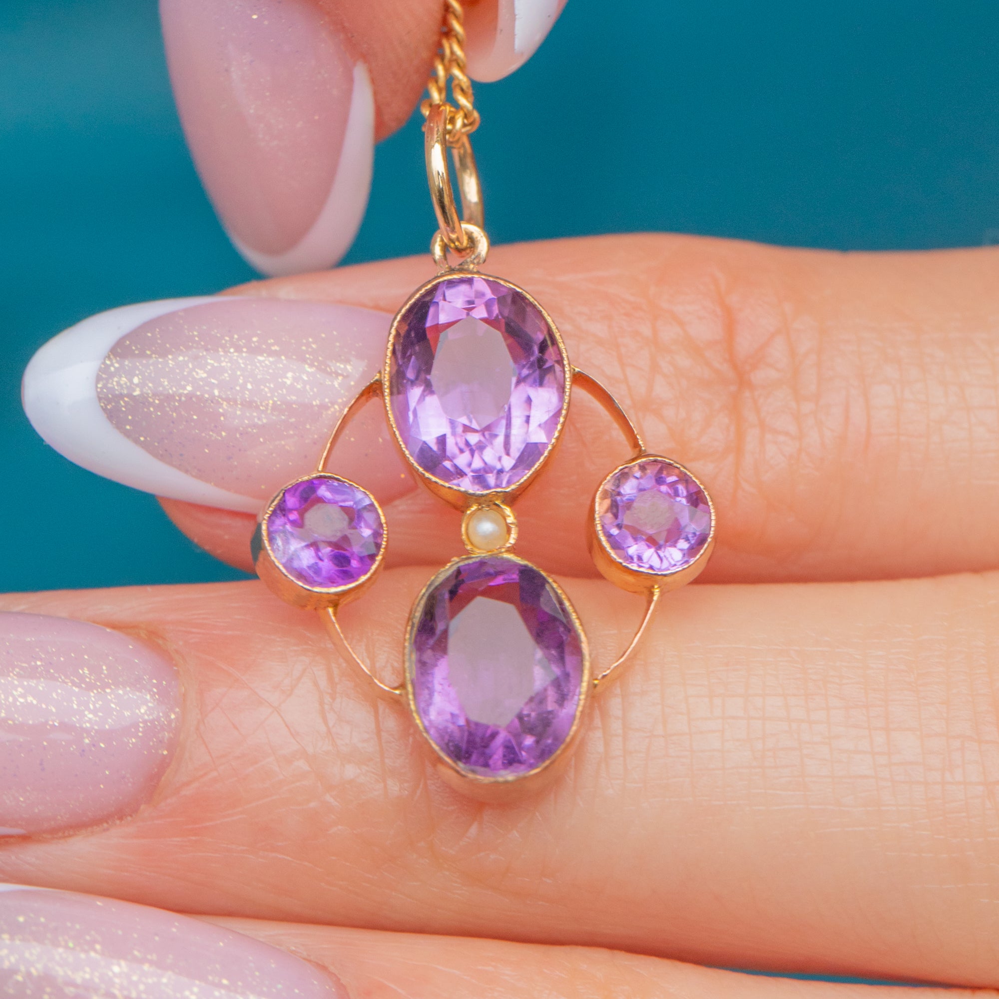 This Victorian pendant features a quadrant of regal Amethysts, radiating gorgeous lilac and lavender hues, each set within buttery 9ct Gold bezels. In her centre sits an dainty Seed Pearl, adding an iridescent accent.