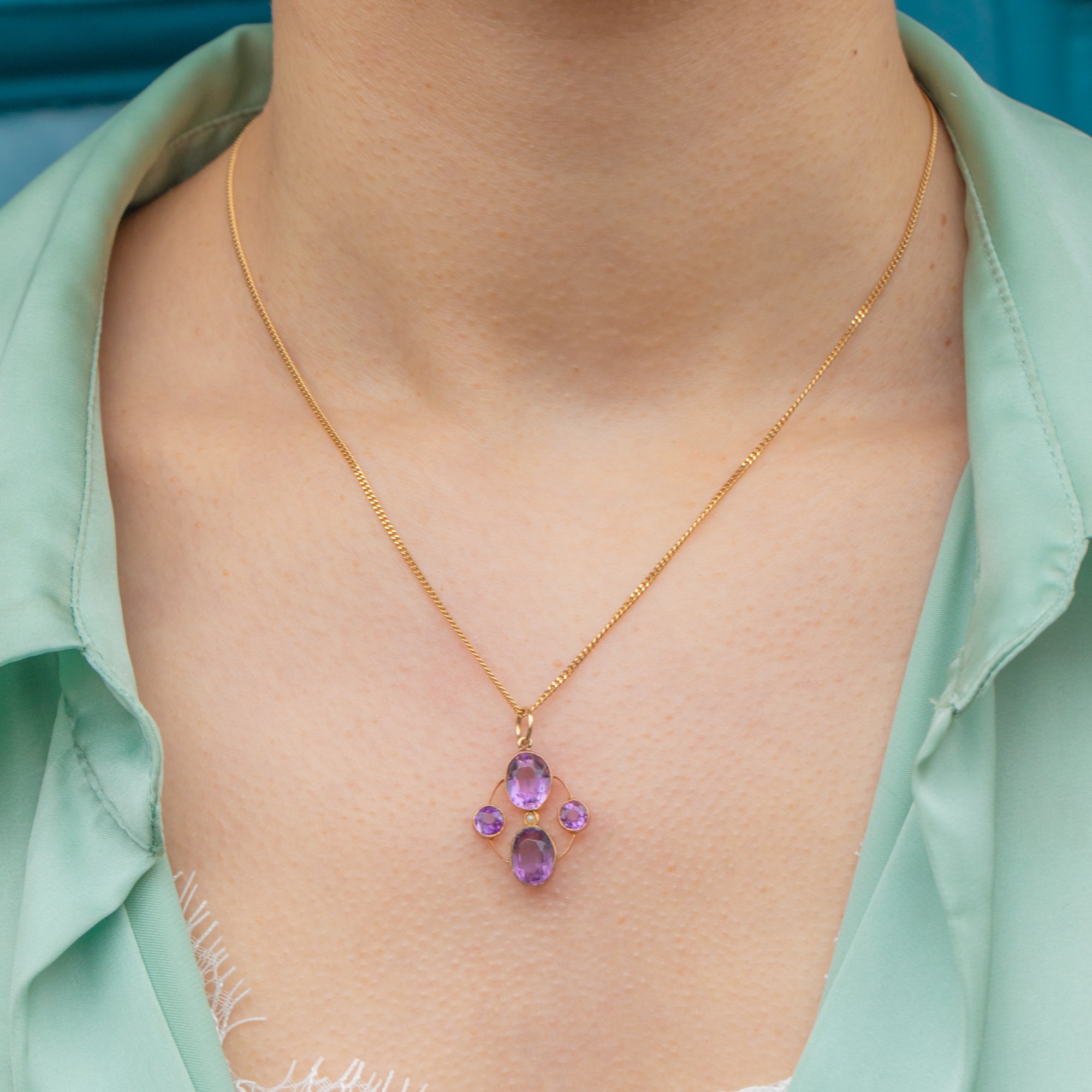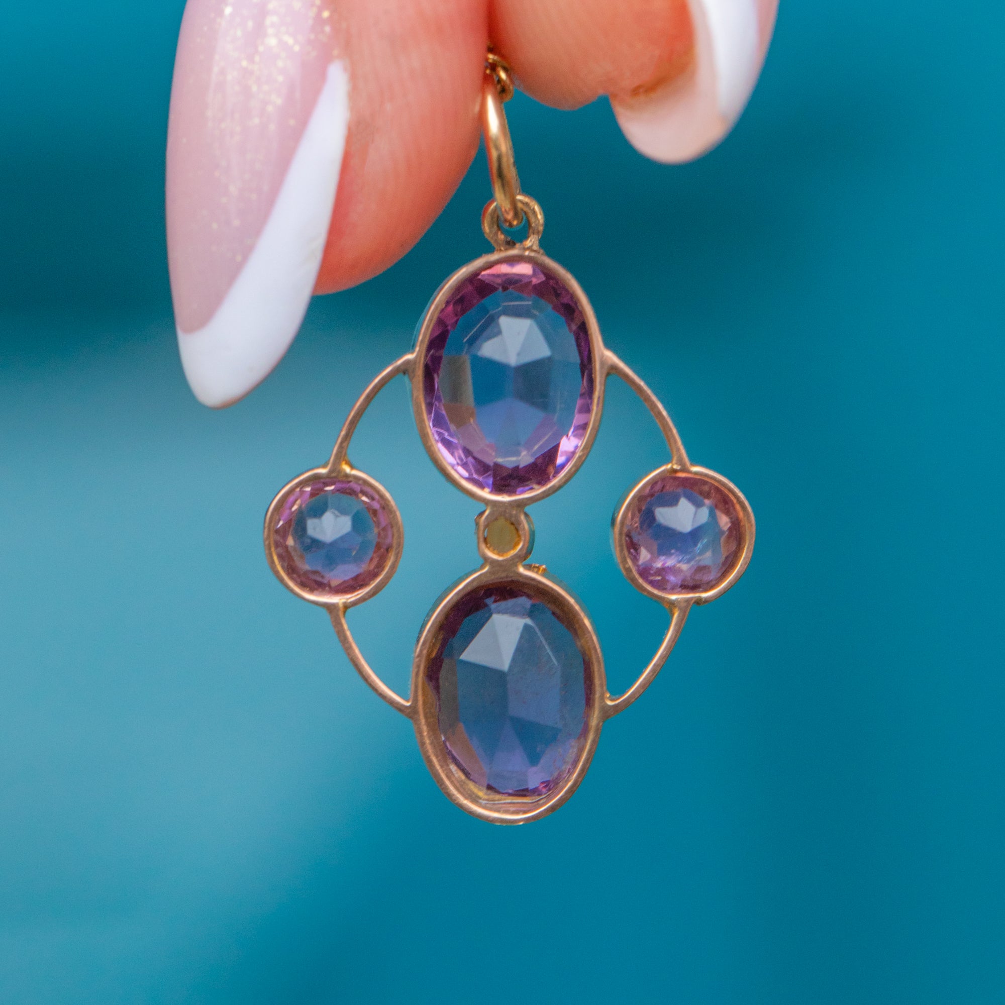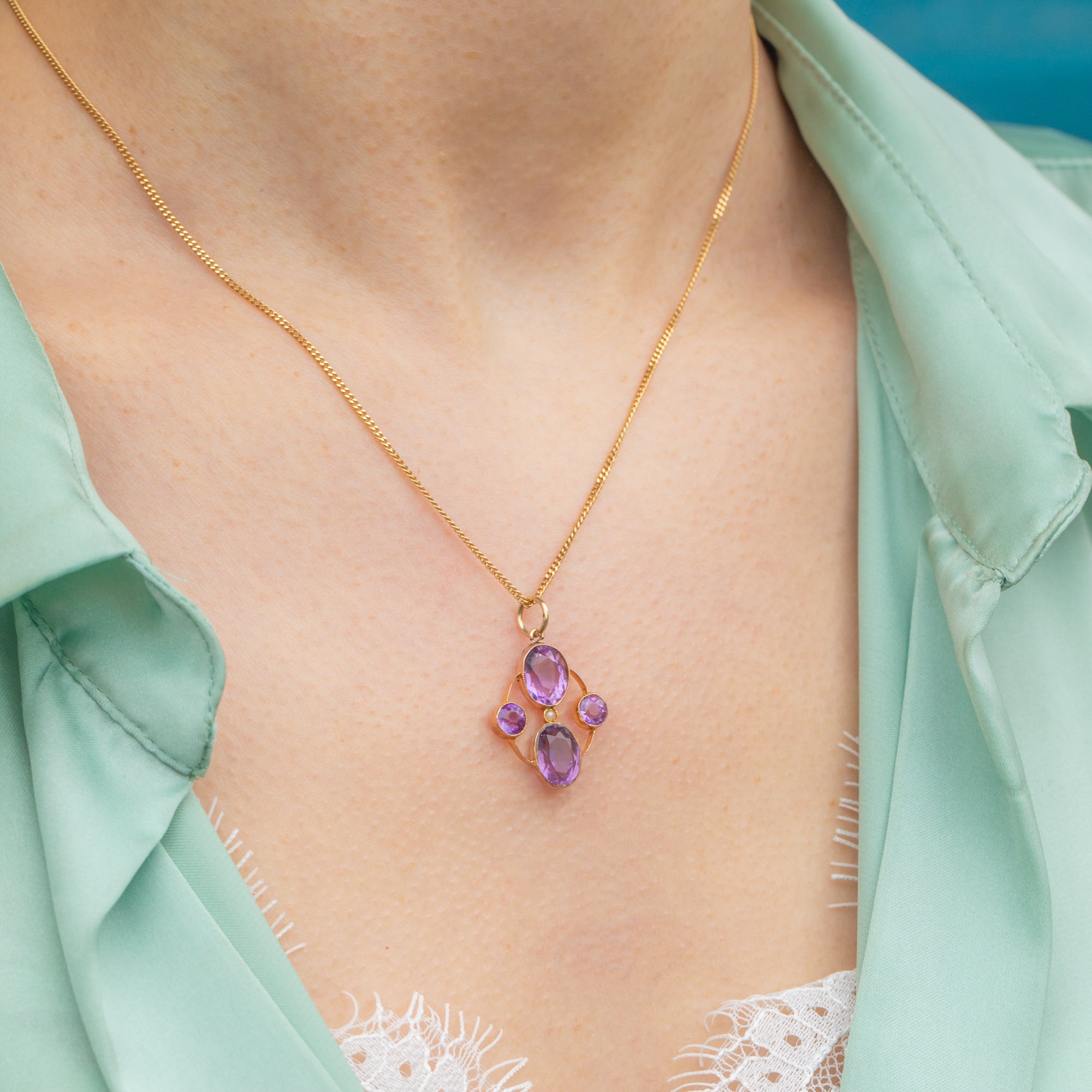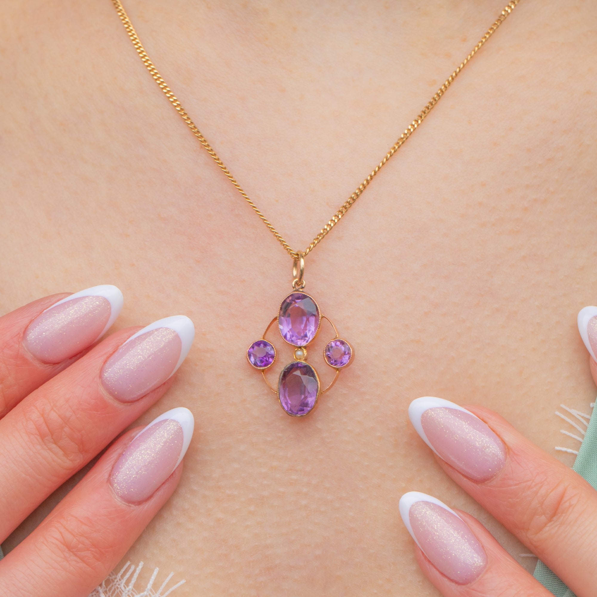 This Victorian pendant features a quadrant of regal Amethysts, radiating gorgeous lilac and lavender hues, each set within buttery 9ct Gold bezels. In her centre sits an dainty Seed Pearl, adding an iridescent accent.
