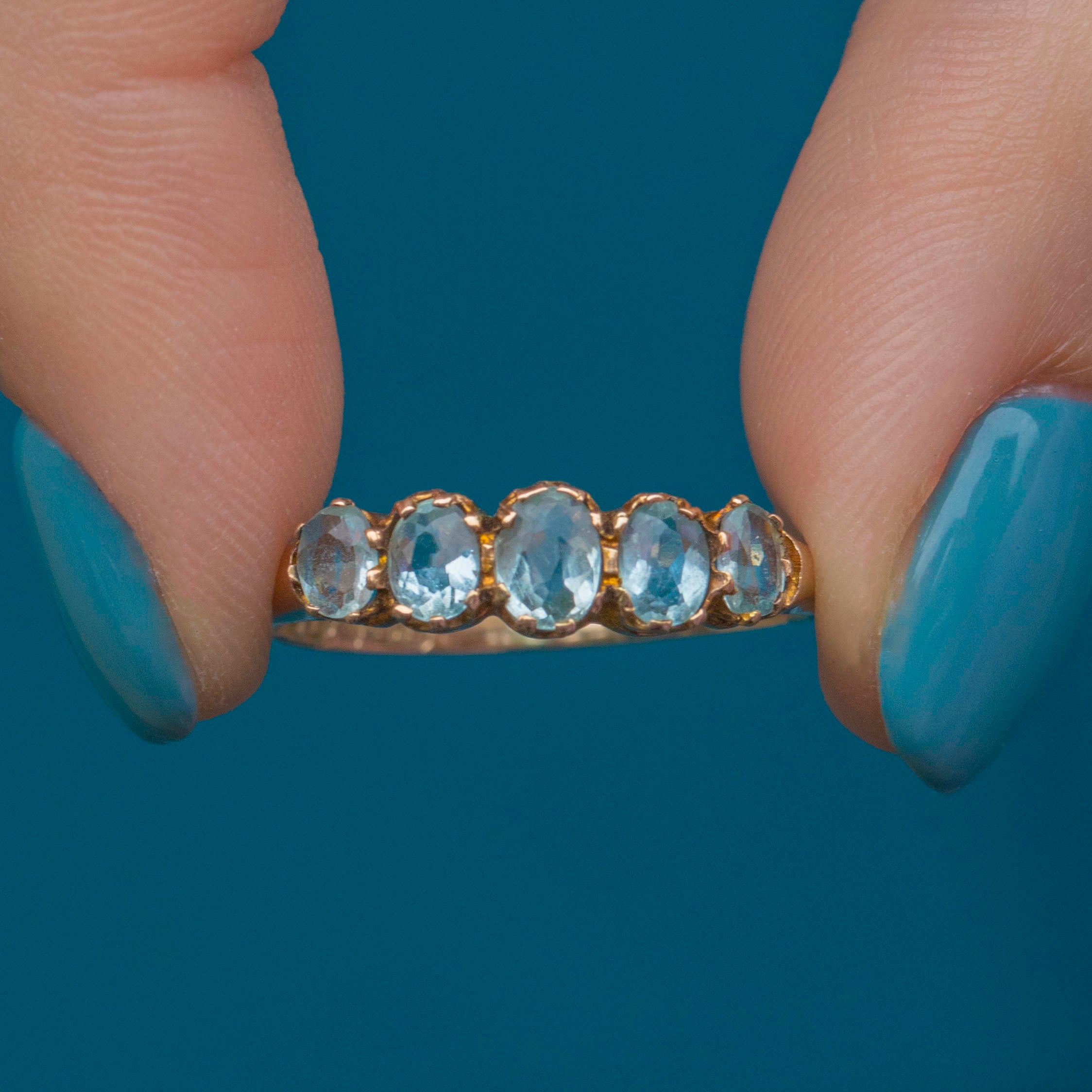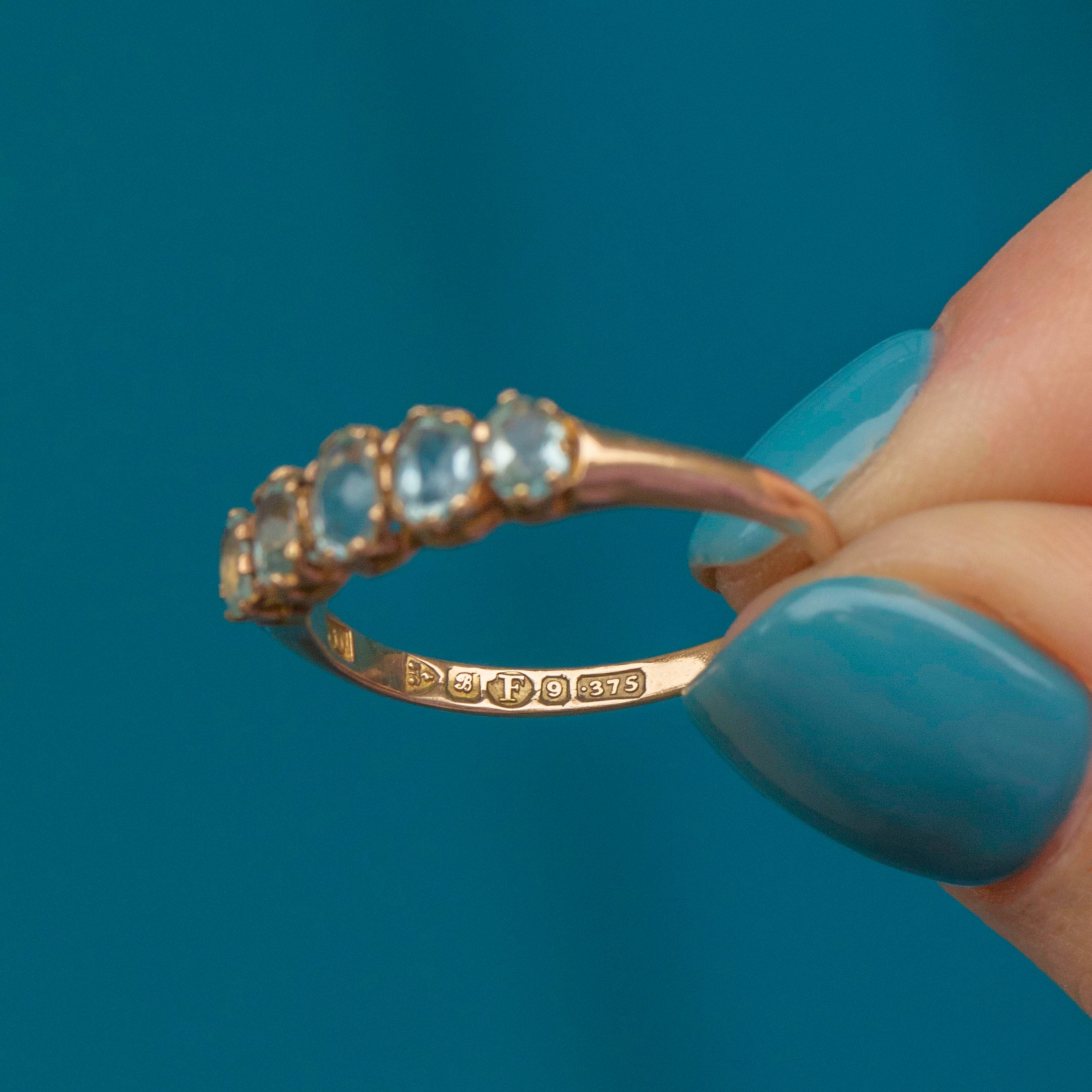 VERY GOOD-EXCELLENT. This antique 9ct Gold Aquamarine five stone ring is in wonderful condition! The Aquamarines sit securely, with all claws present and no damage to their facets. There is some subtle wear on the inside of the band, commensurate with age, but the outside has remained glossy and smooth. This Aquamarine Gold ring is the perfect piece for your summer collection!