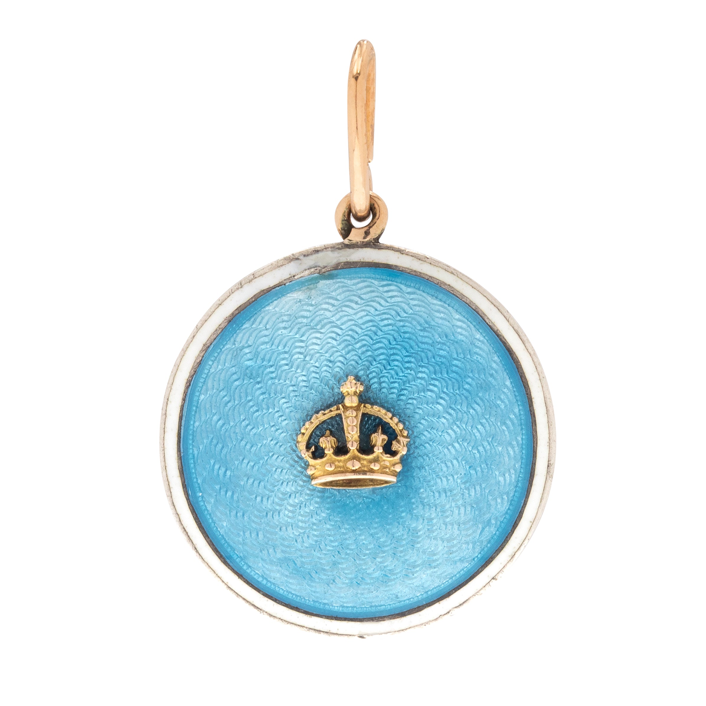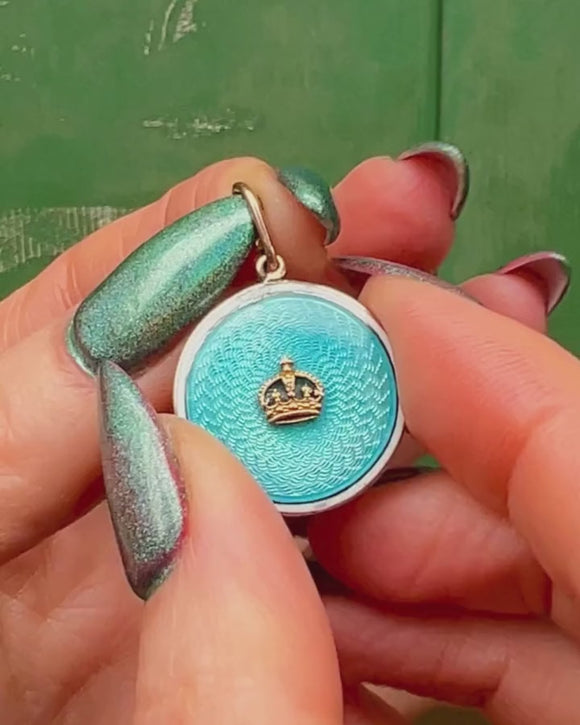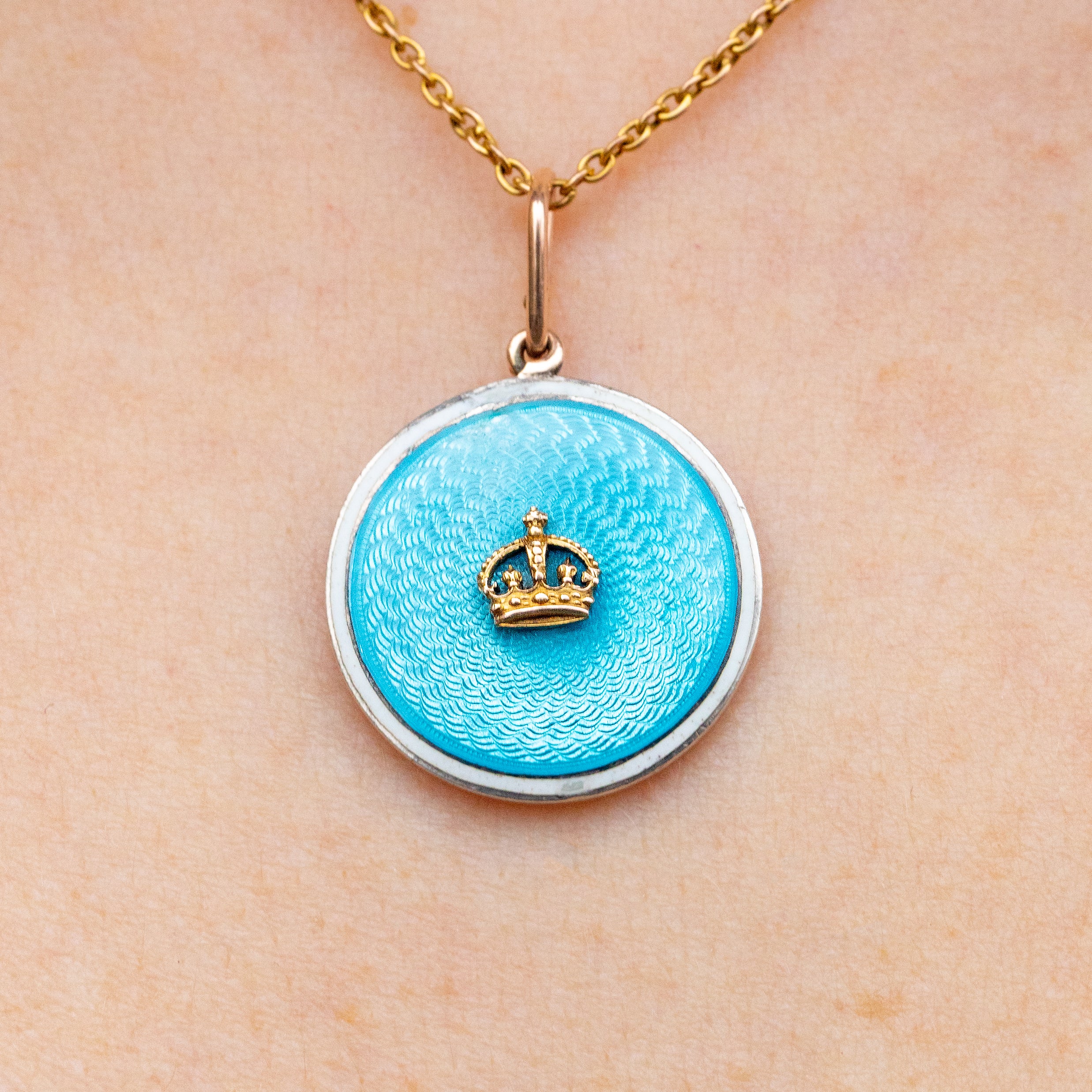 Antique 9ct Gold Blue Guilloché Enamel Pendant with Crown, Signed Child & Child