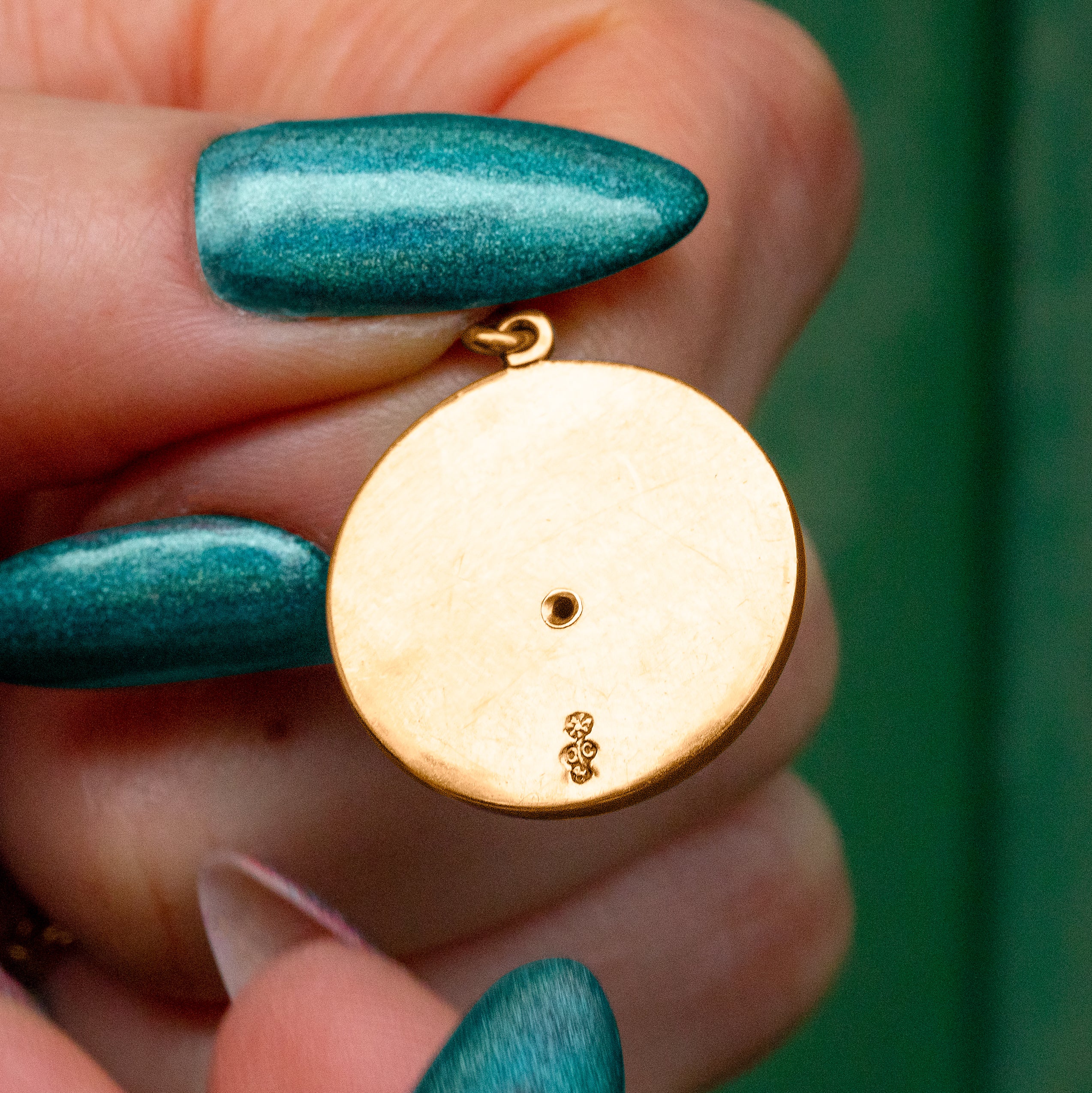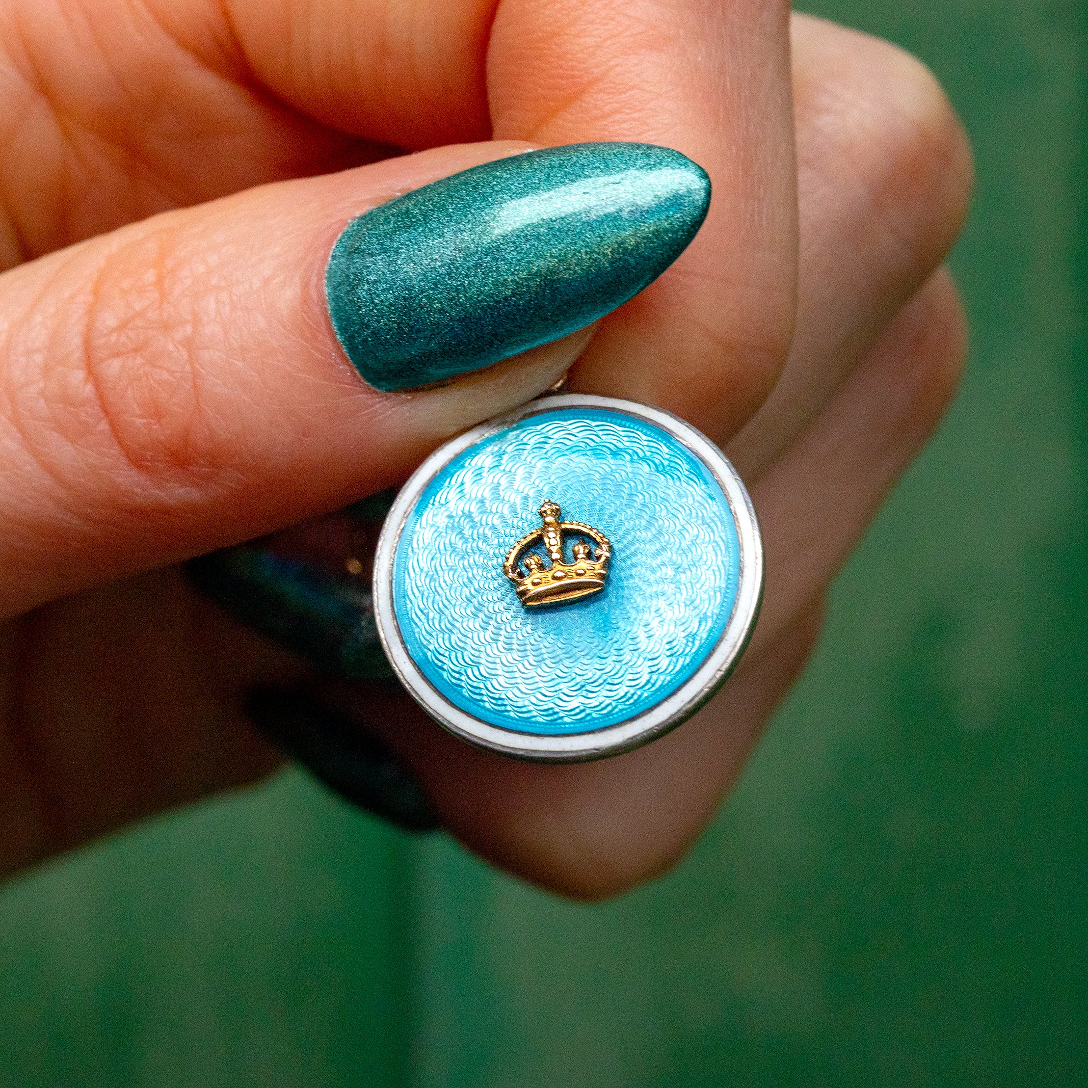 We adore this antique 9ct Gold blue Guilloché enamel pendant! Boasting shimmering blue Guilloché enamel forming her spirograph detailing, she is adorned by a 9ct Gold crown in her centre creating an undeniably striking piece of Victorian jewellery.