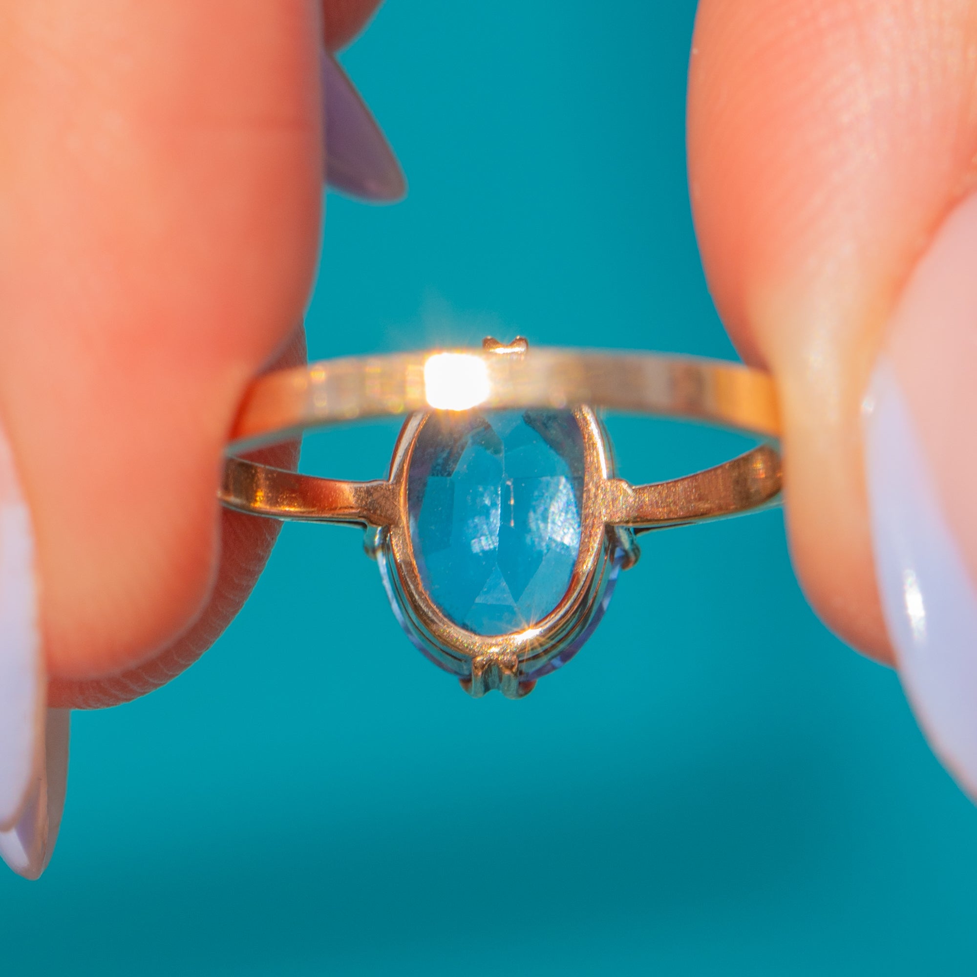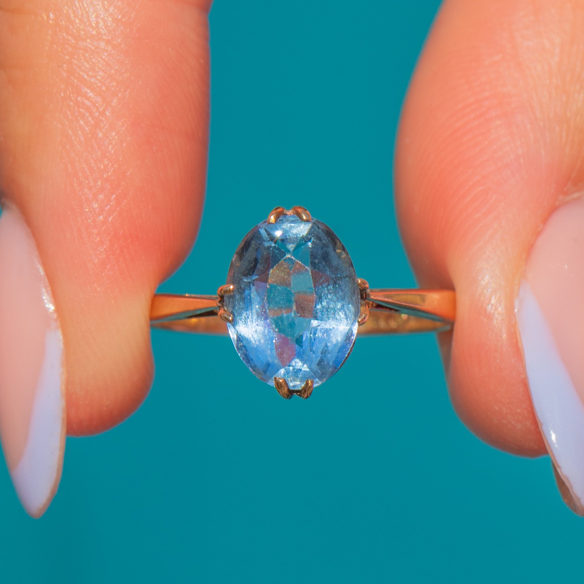 Add a pop of colour to your attire with this antique 9ct Gold blue Paste solitaire ring!