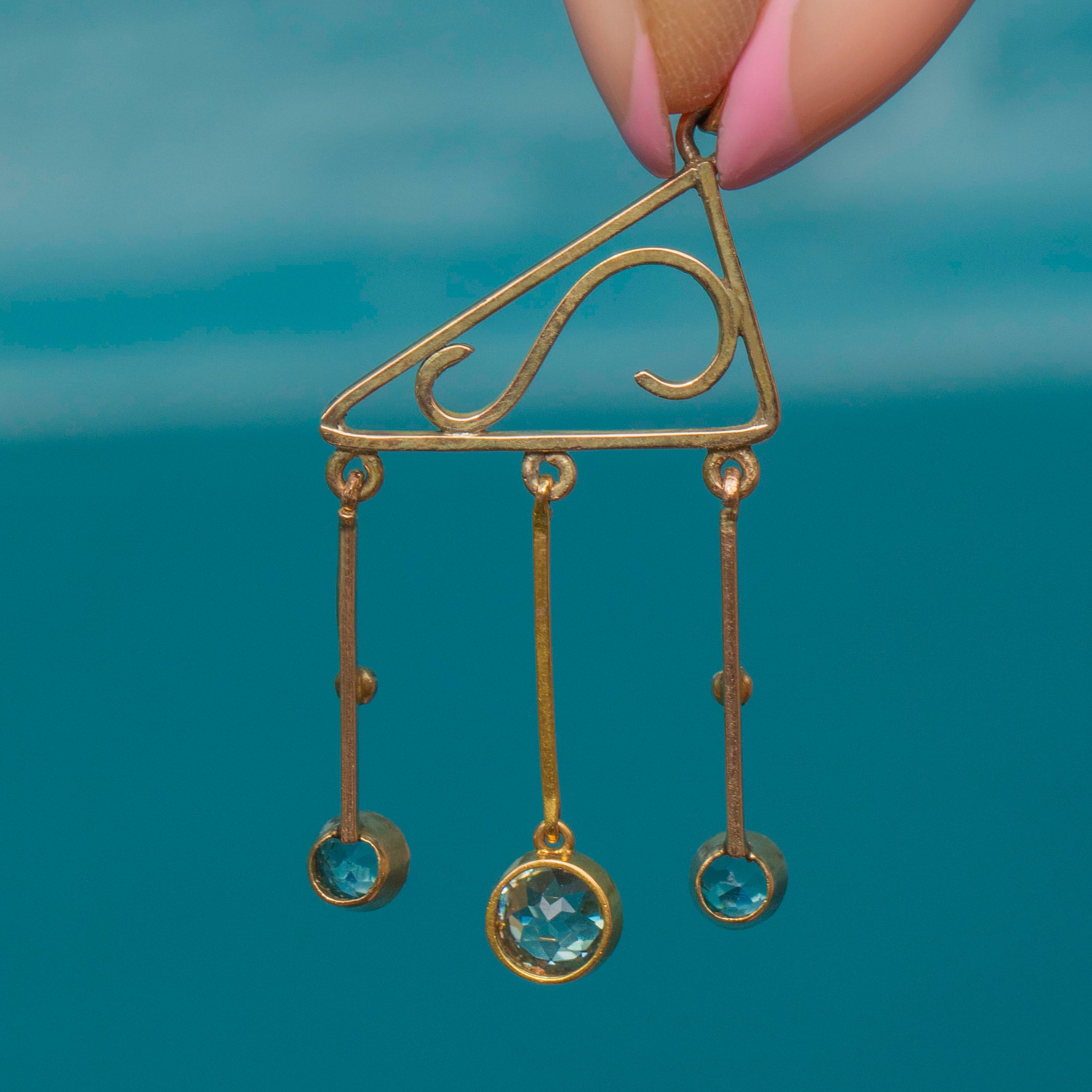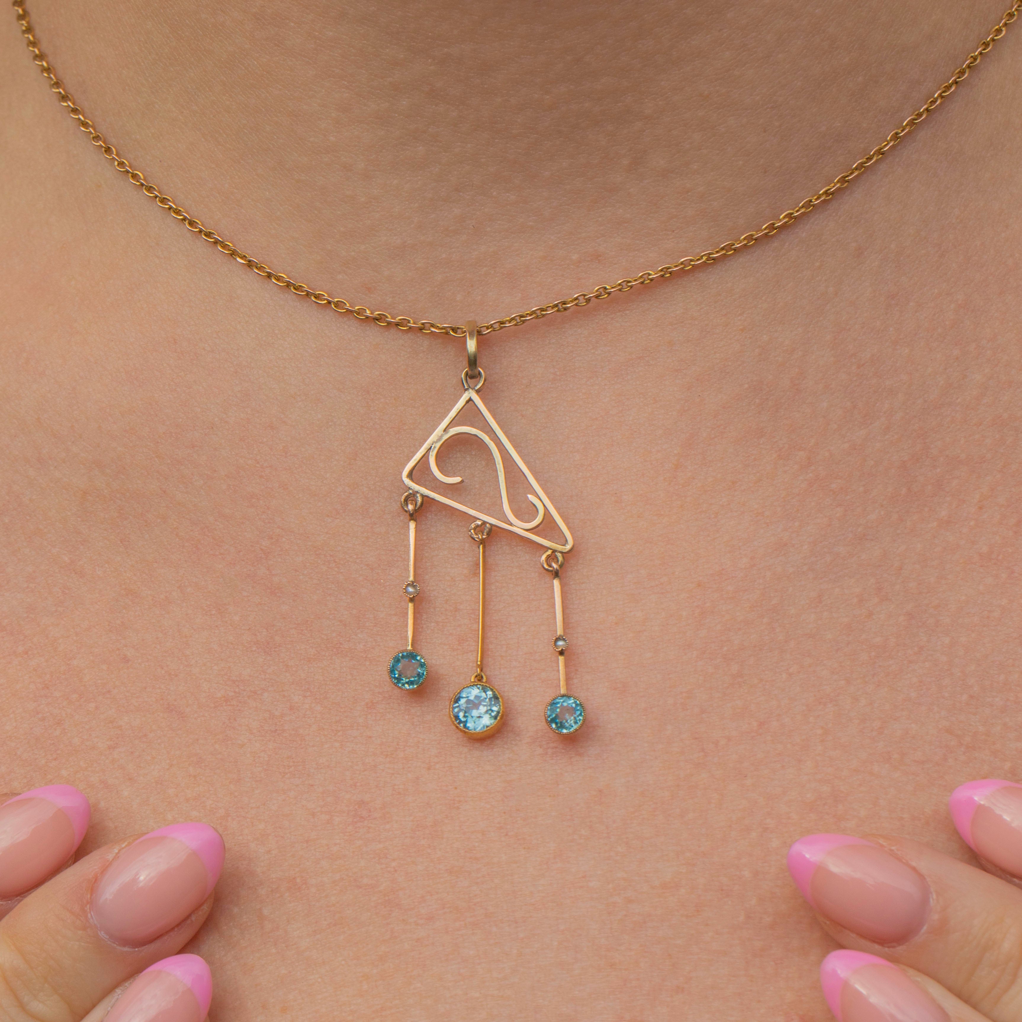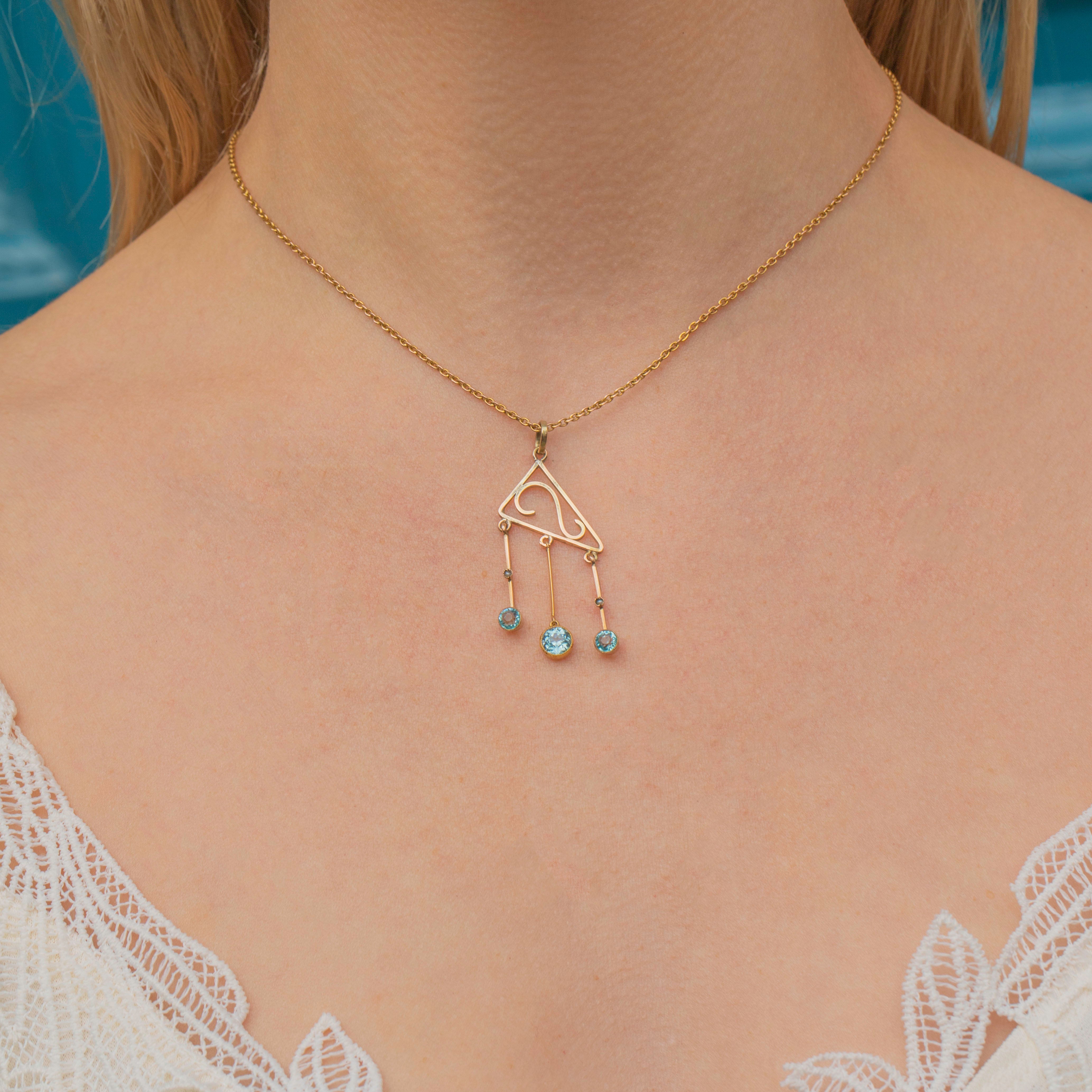 EXCELLENT. This antique 9ct Gold blue Zircon drop pendant is in mint condition! The Gold is buttery throughout with the wirework remaining robust and free from any dings. The Zircons have a crisp set of facets and are free from any chips or abrasions!