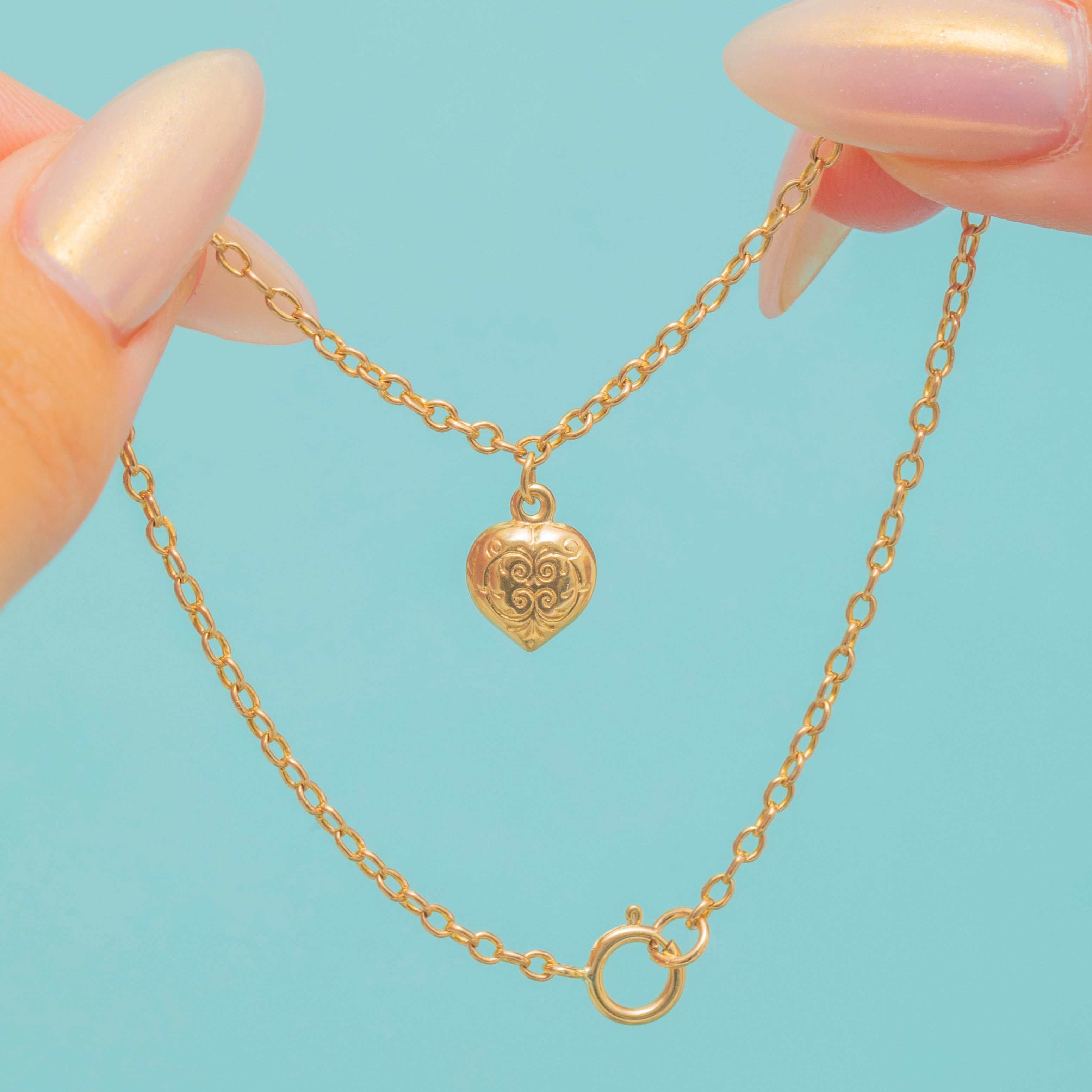 Crafted in 9ct Gold, the heart charm is finely engraved and retains a soft, polished finish. The bracelet’s petite size and elegant design make it a sweet and wearable antique jewel.