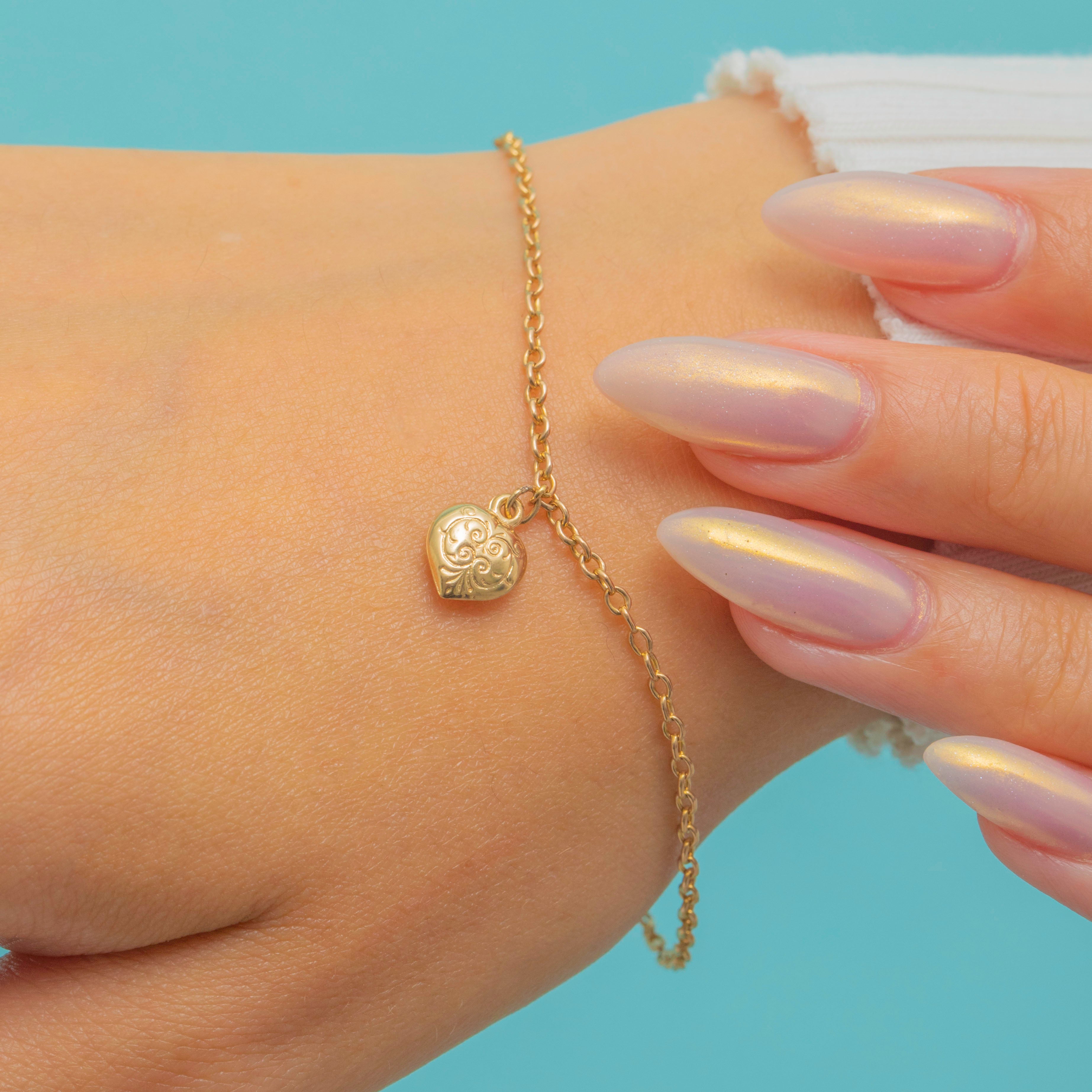 EXCELLENT: The bracelet and heart charm are in superb condition, with clear engraving and well-preserved Gold links. Wear is minimal, reflecting careful ownership over the years.