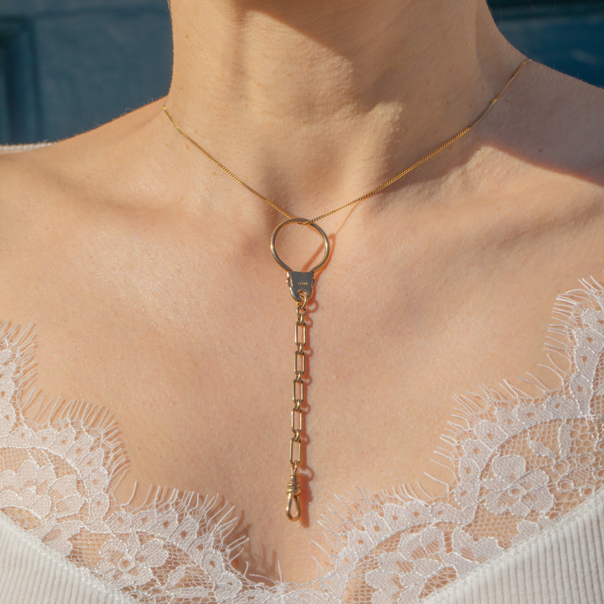 This antique 9ct Gold carabiner charm holder clasp will provide you with endless styling possibilities! Crafted from solid Gold, with a lovely buttery hue, this Victorian charm holder has a large carabiner and a dog-clip, connected by chunky trombone links.
