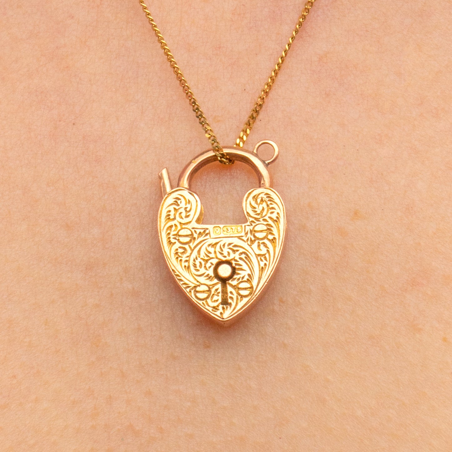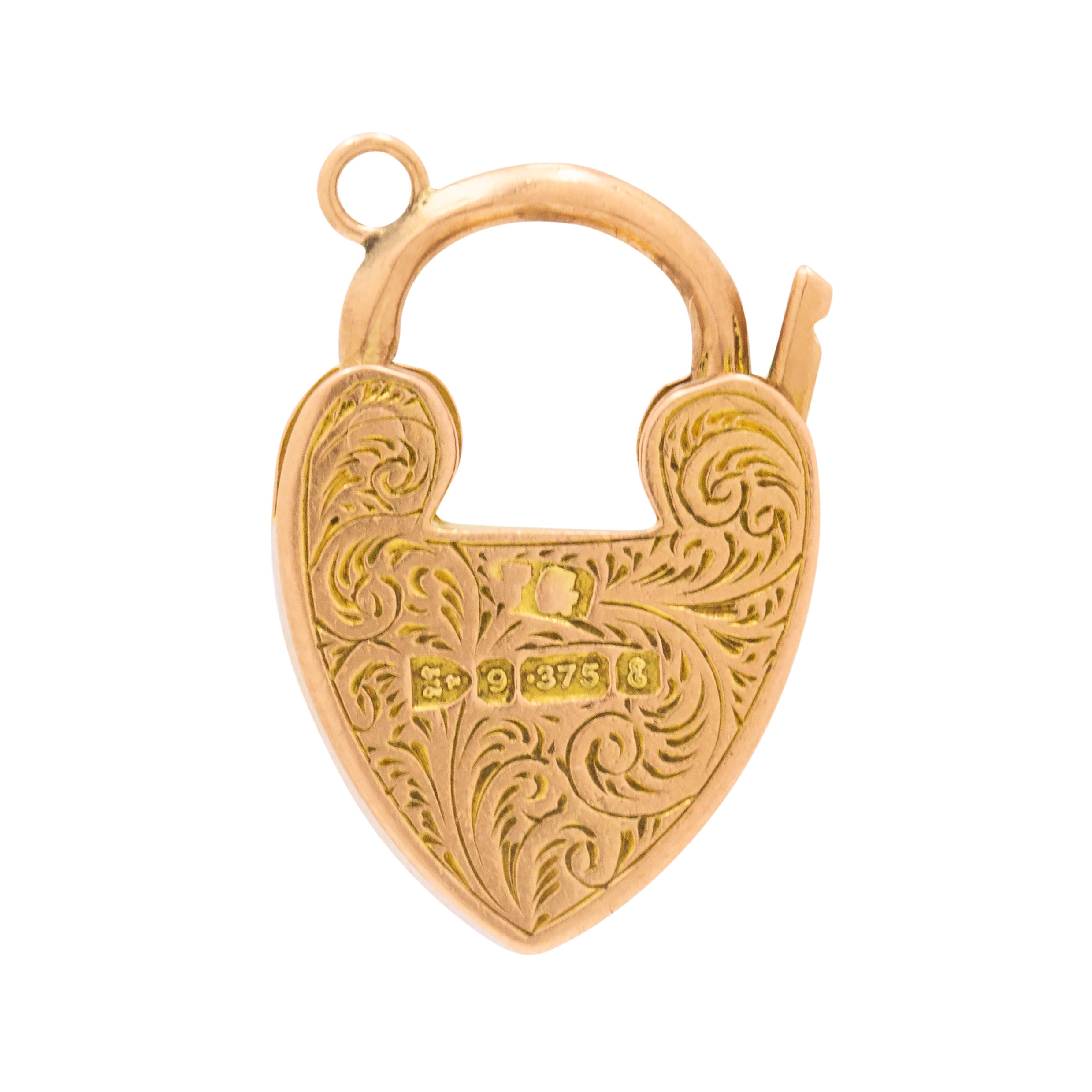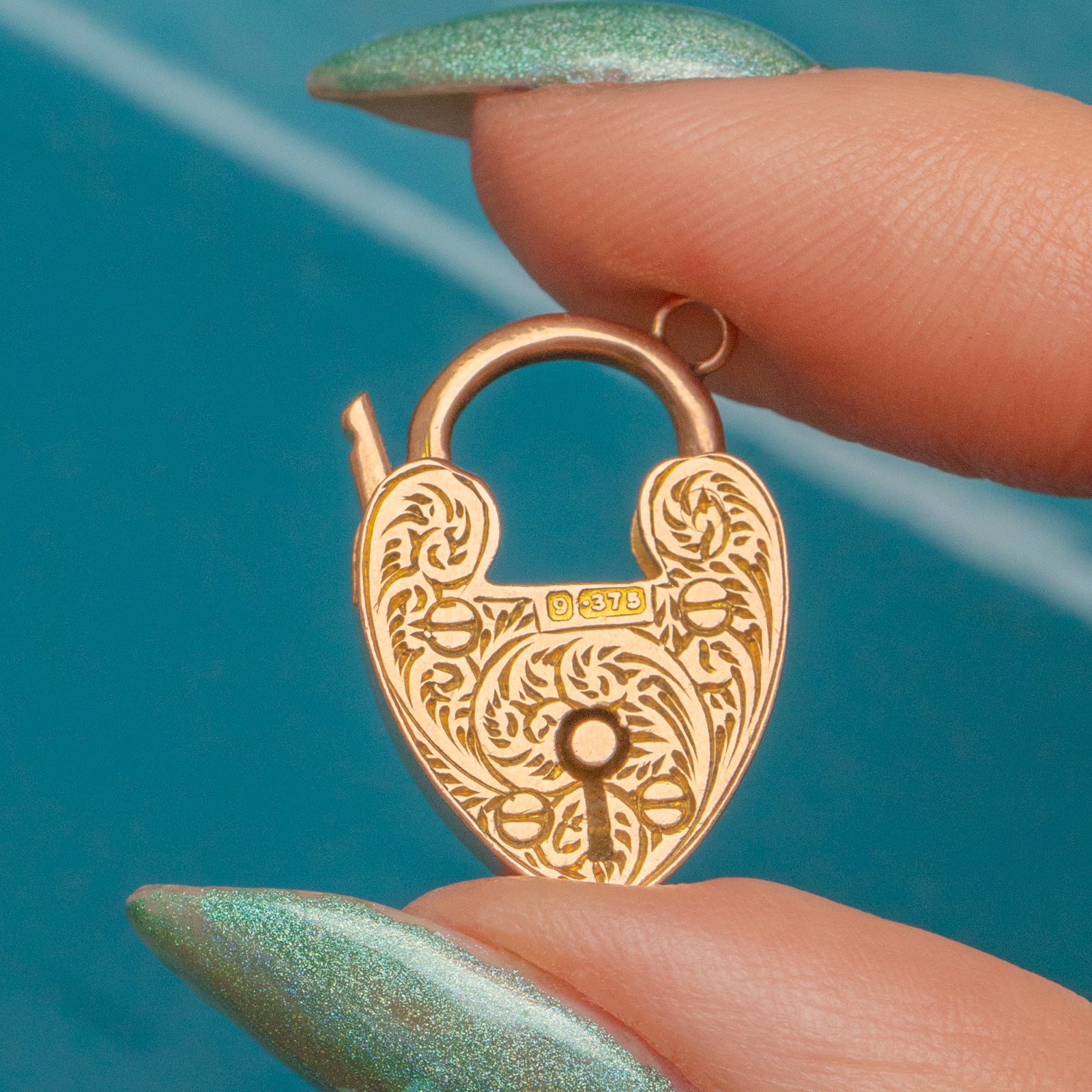 EXCELLENT. With everything in tip-top form, this antique 9ct Gold engraved heart padlock pendant is in excellent condition!