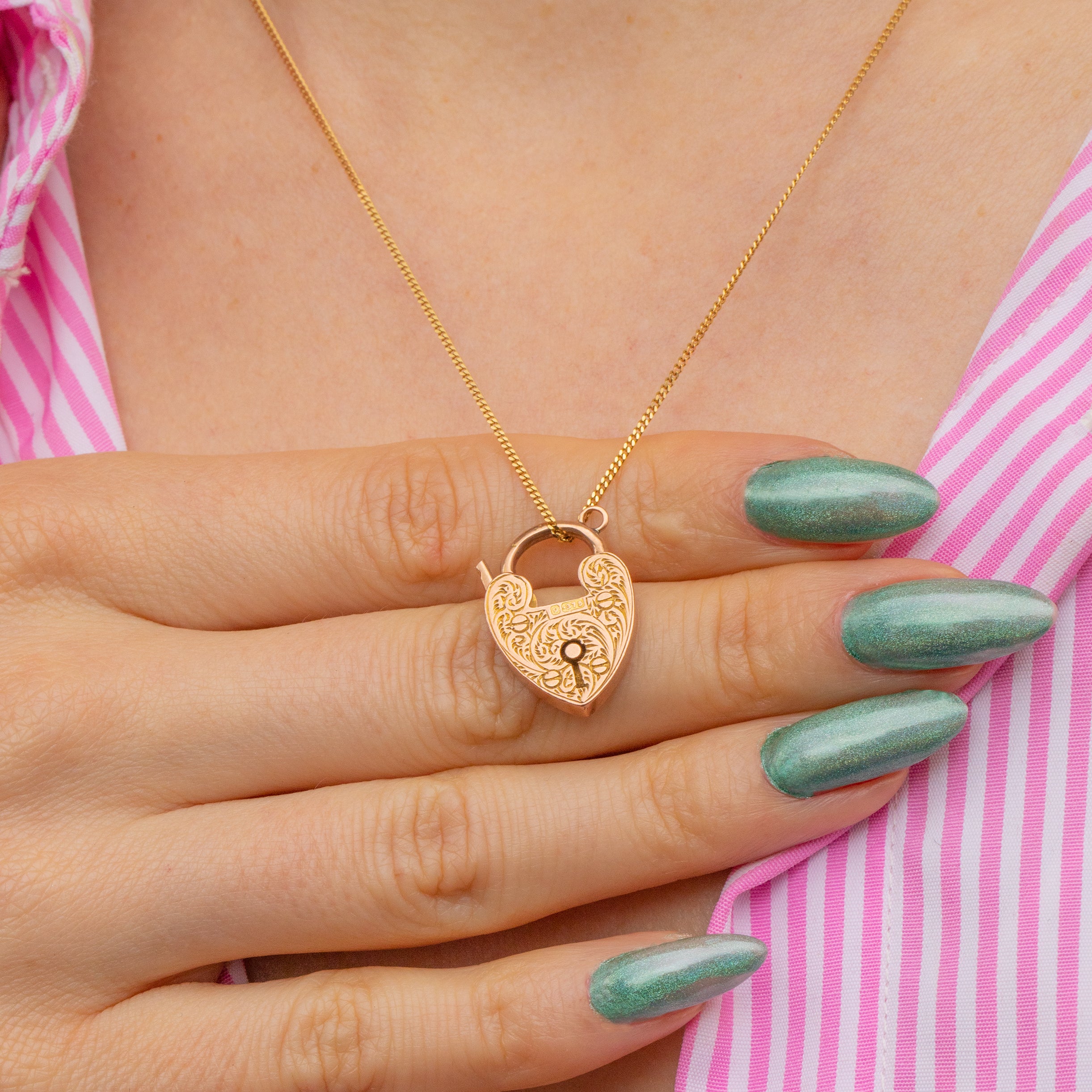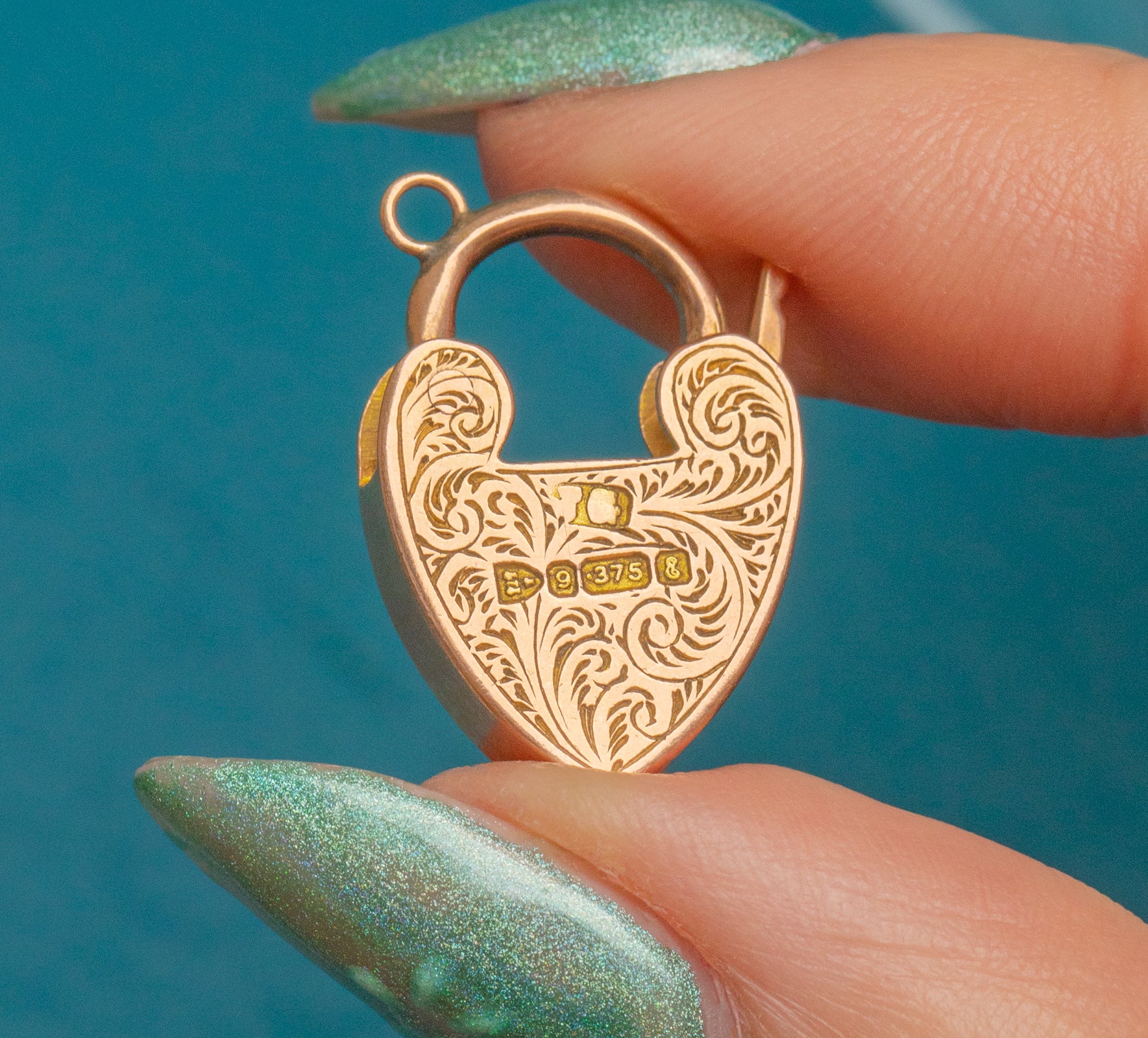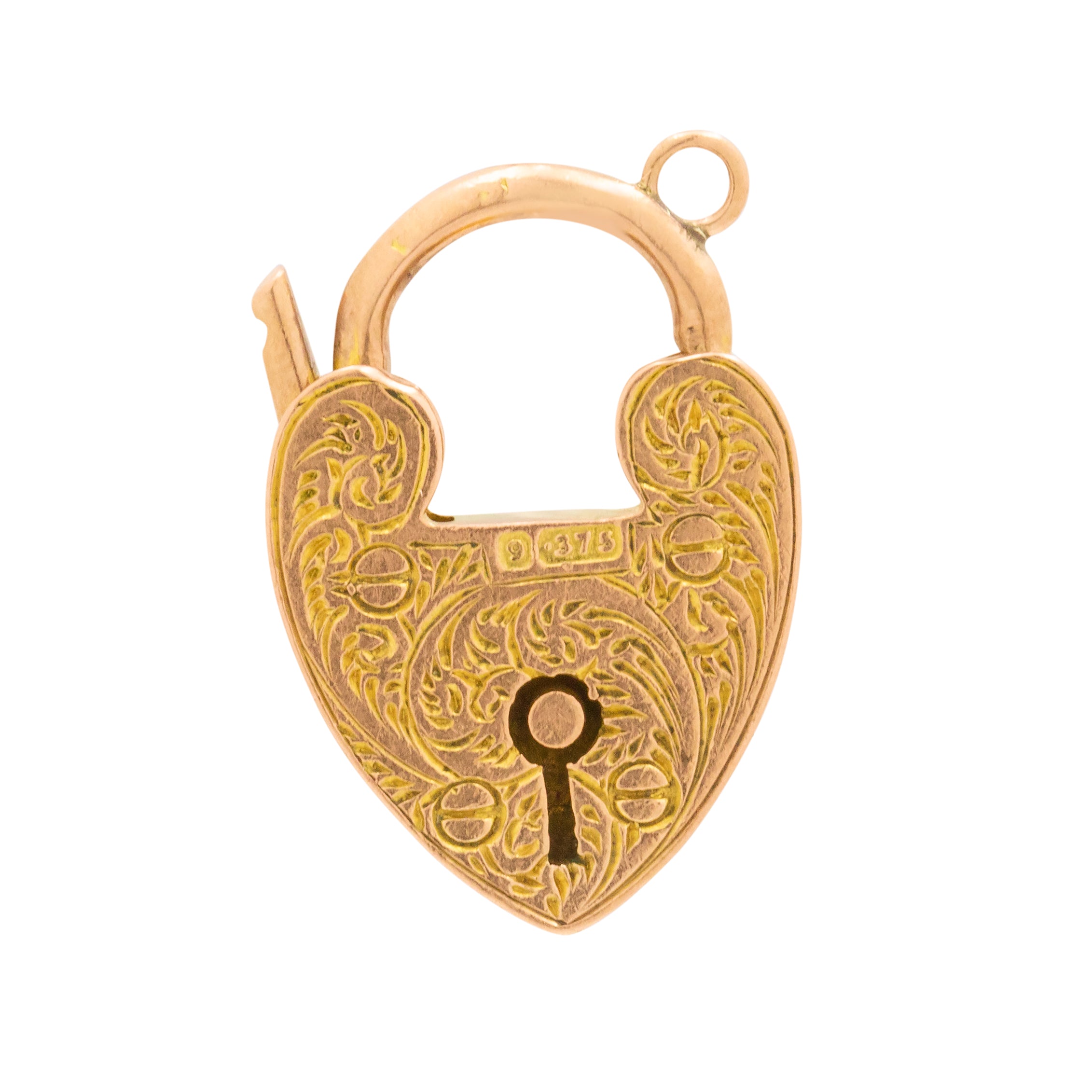 EXCELLENT. With everything in tip-top form, this antique 9ct Gold engraved heart padlock pendant is in excellent condition!