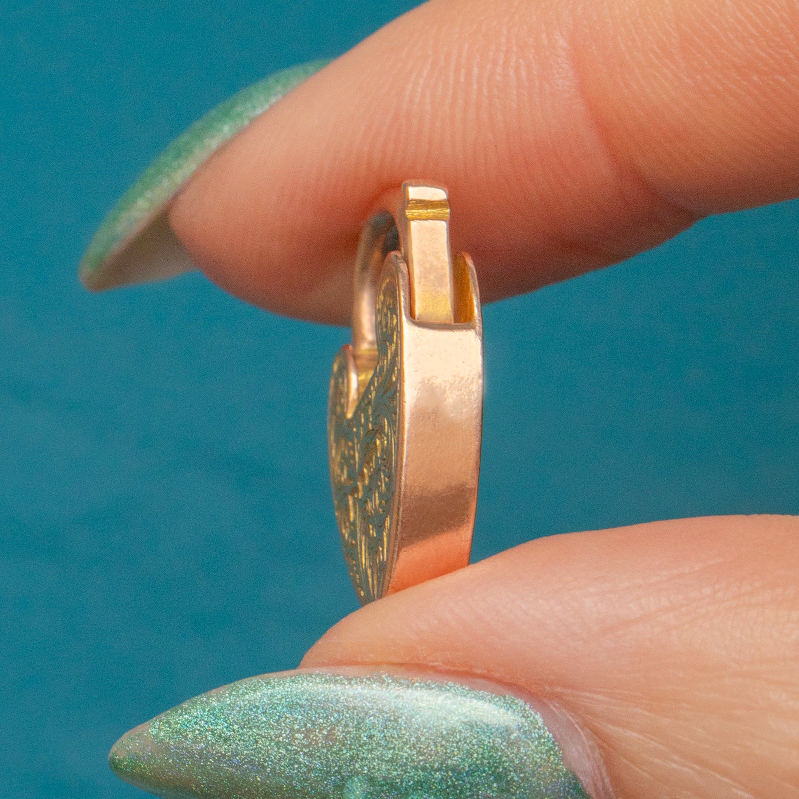 Bring a touch of the early 1900's into your repertoire with this antique 9ct Gold engraved heart padlock pendant! Sweeping acanthus leaf engravings adorn the front and back of the heart padlock, crafted entirely from blushed 9ct Gold.