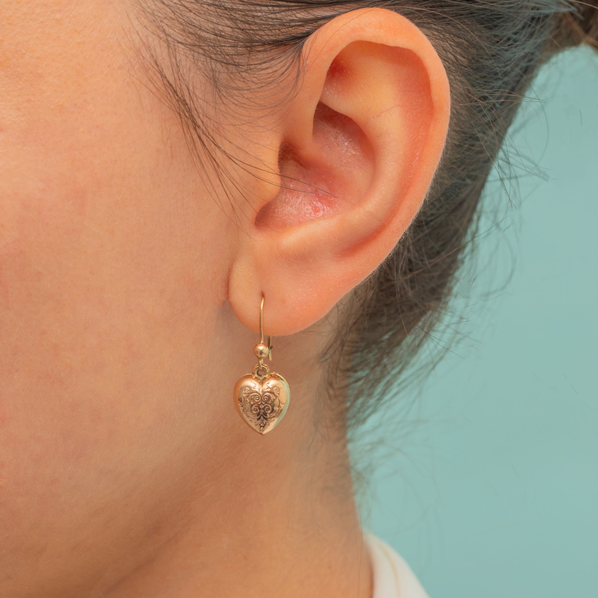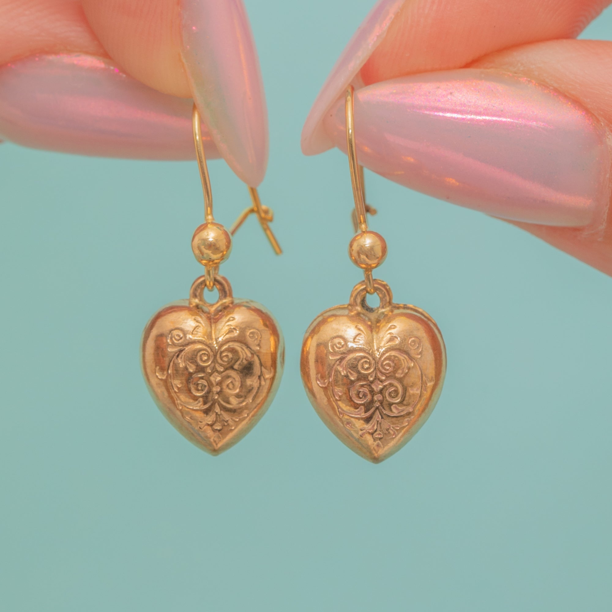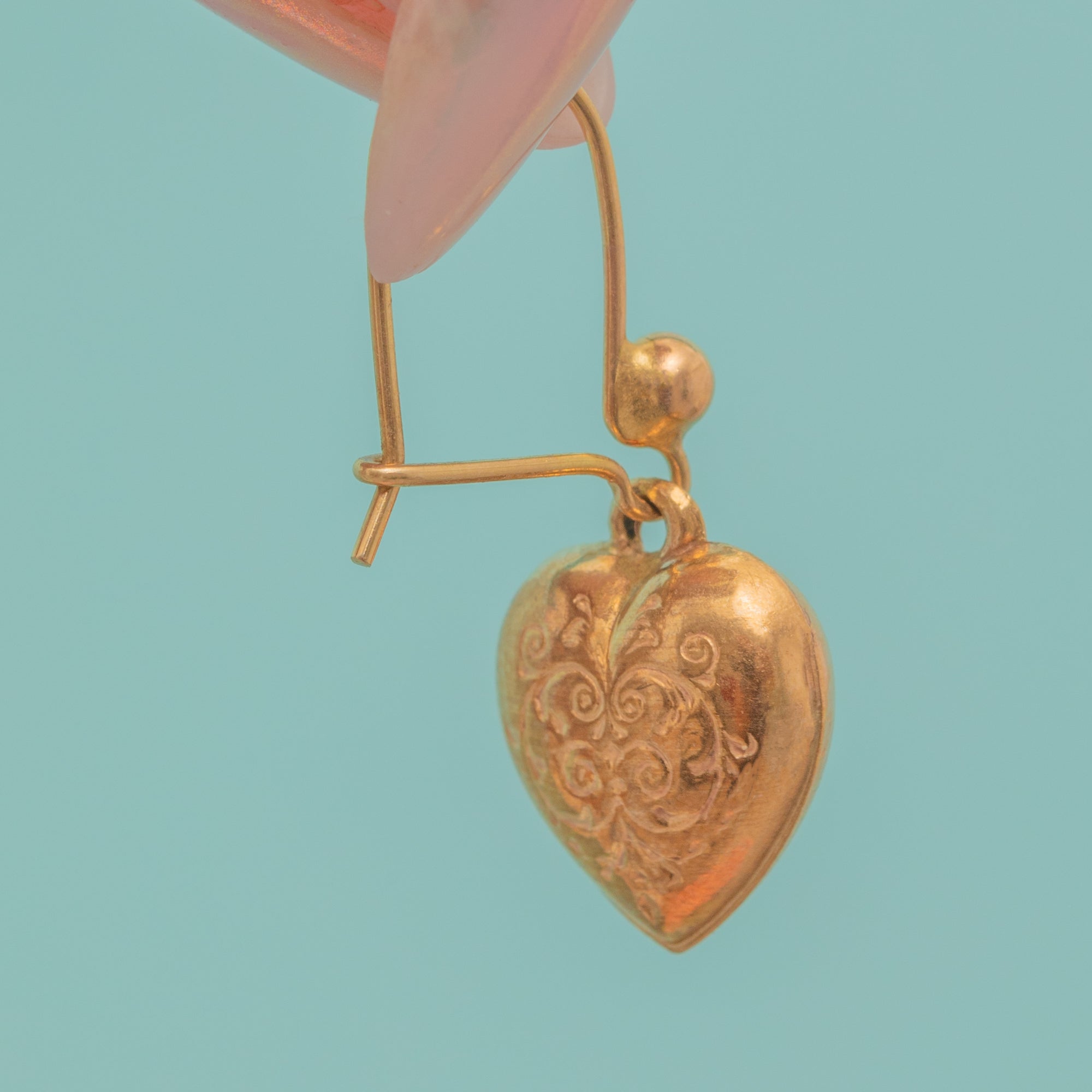 EXCELLENT: These antique 9ct Gold engraved puffy heart drop earrings are in excellent condition. The 9ct Gold is warm and radiant, with crisp and clear engravings. Totally irresistible, we have fallen in love with these Victorian heart earrings!