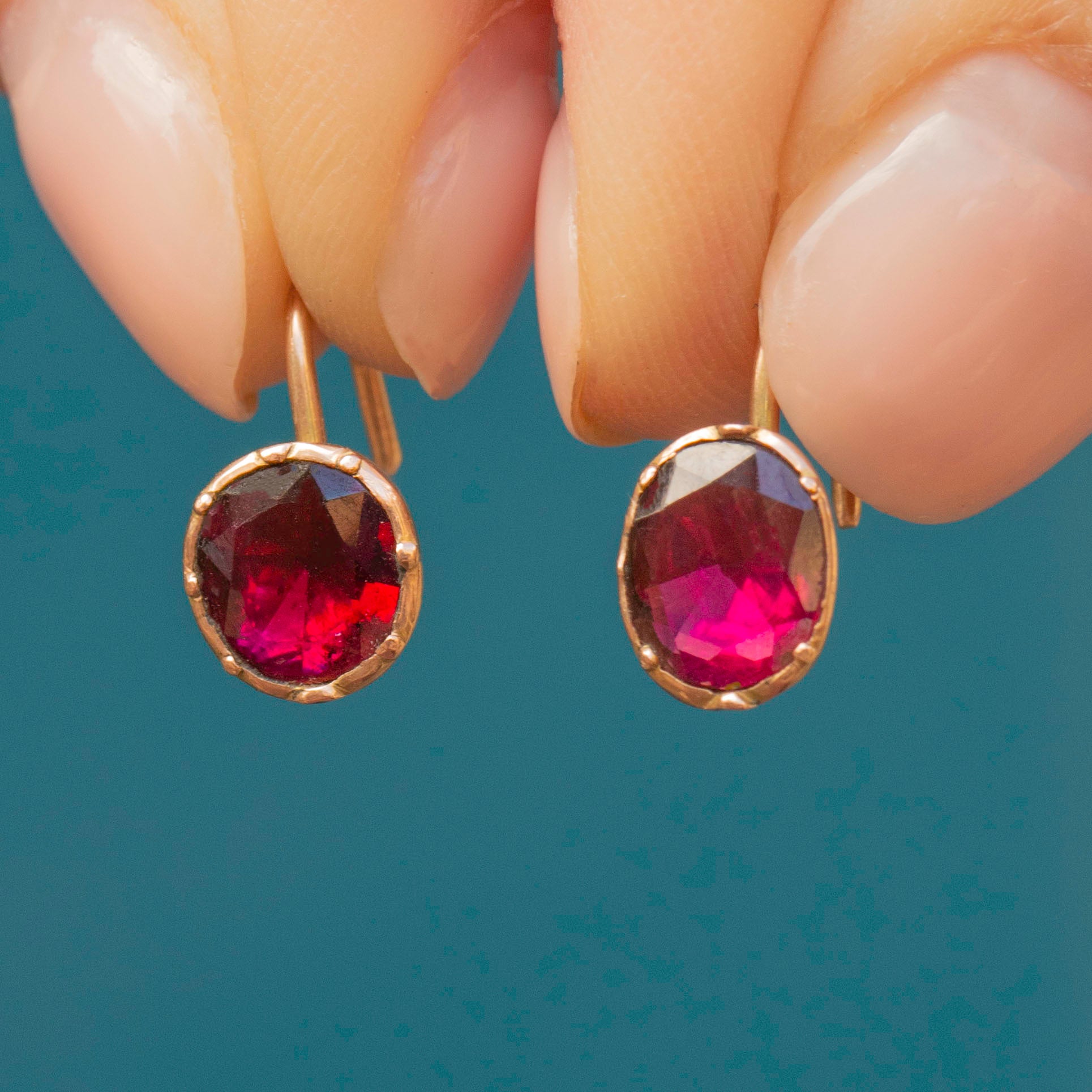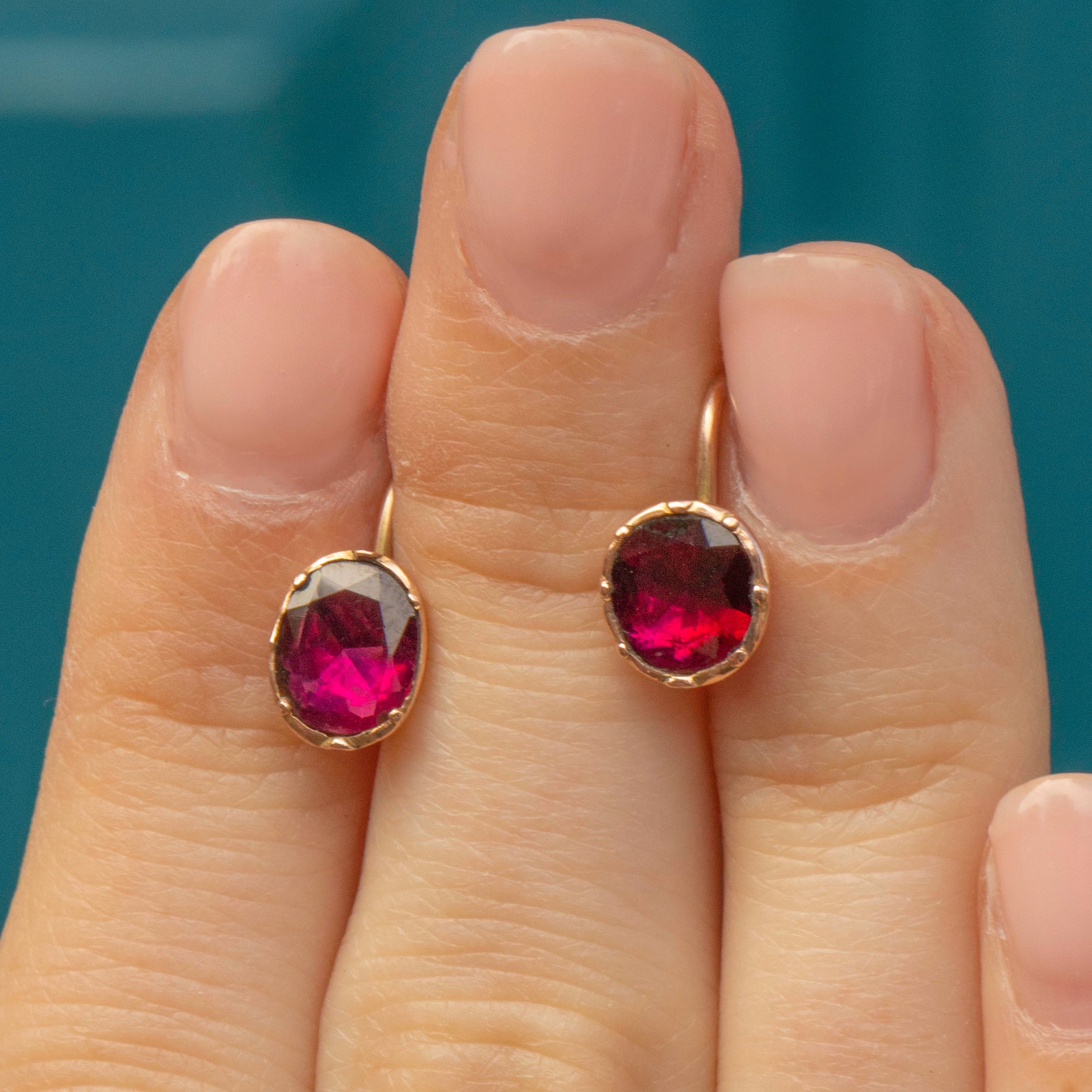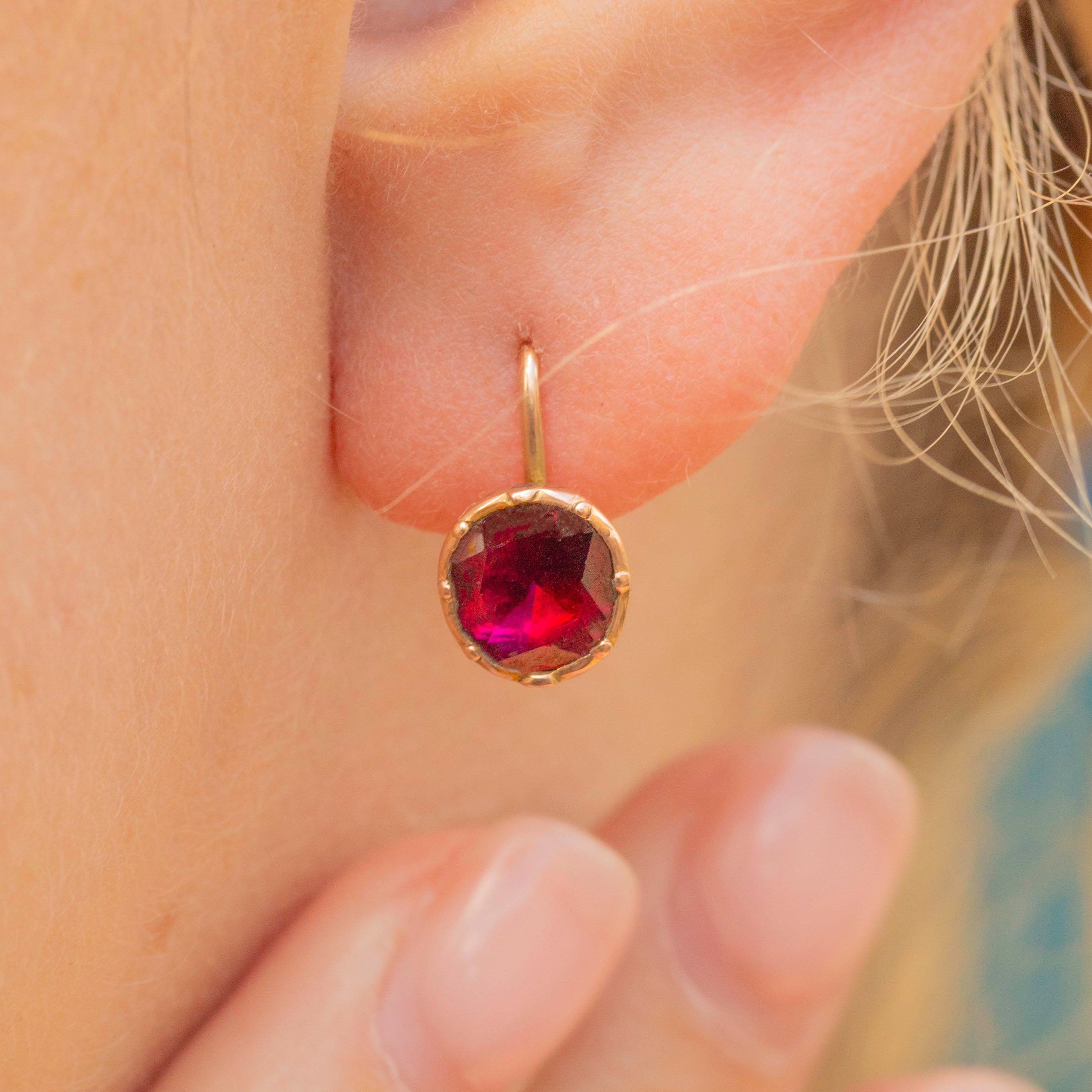 These antique 9ct Gold flat-cut Garnet earrings are a gorgeous pair, boasting beautiful cherry red Garnets with plum shimmers. The perfect earrings for a date night, these antique Garnet earrings will instantly add a touch of elegance to your outfit!
