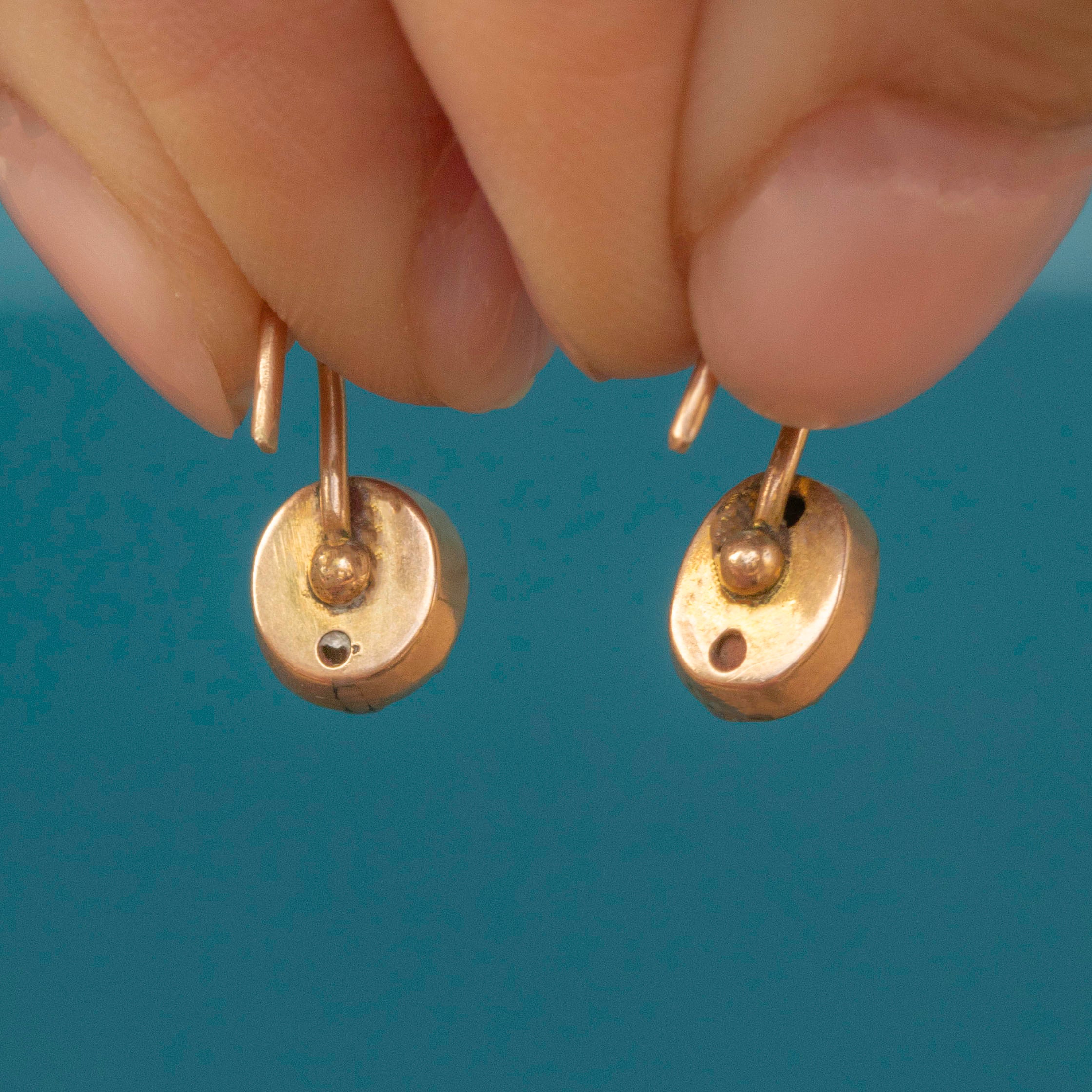 VERY GOOD. These antique 9ct Gold flat-cut Garnet earrings are in very good  condition! The Garnets are smooth to the touch, with a wonderful glisten from their foiled backs. The backs have some darkening around the grooves where the ear post meet the back but this cannot be seen when worn. Both Garnets have a beautifully concentrated colour and can be displayed proudly from their securely soldered ear hooks; What a treat!