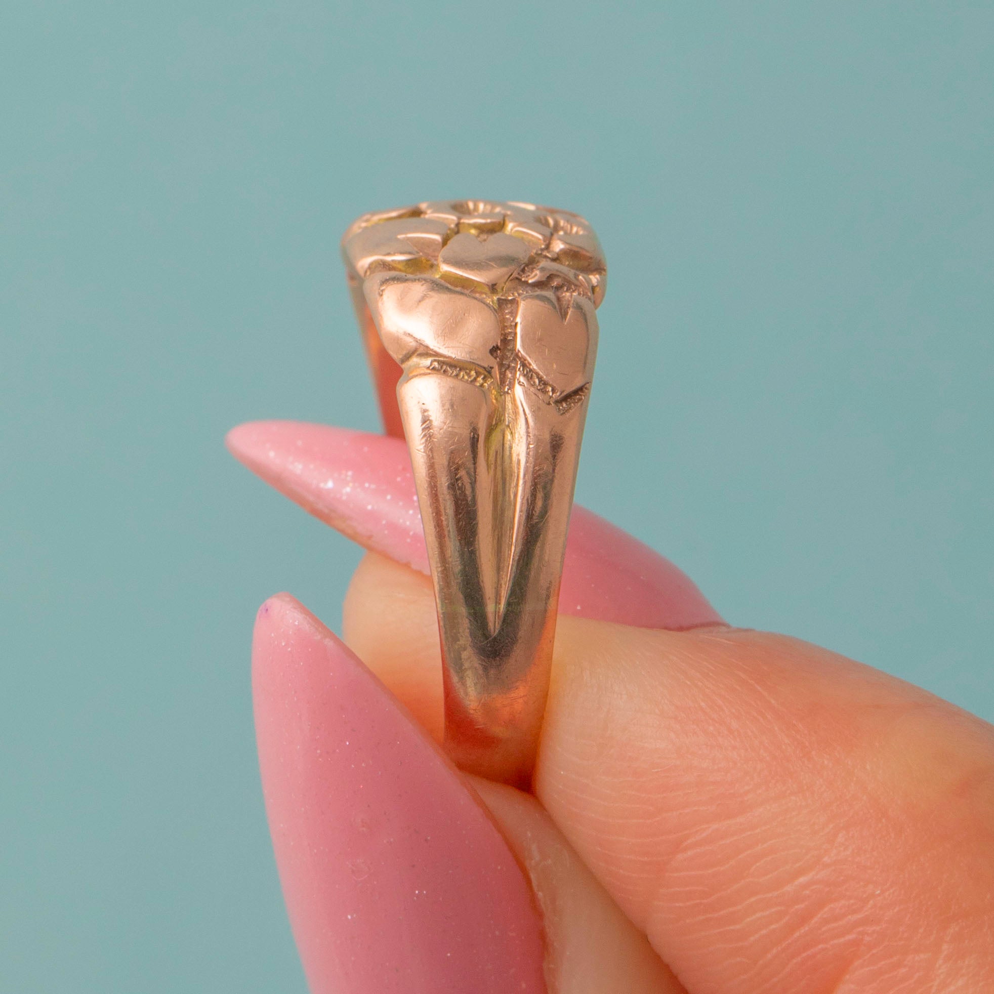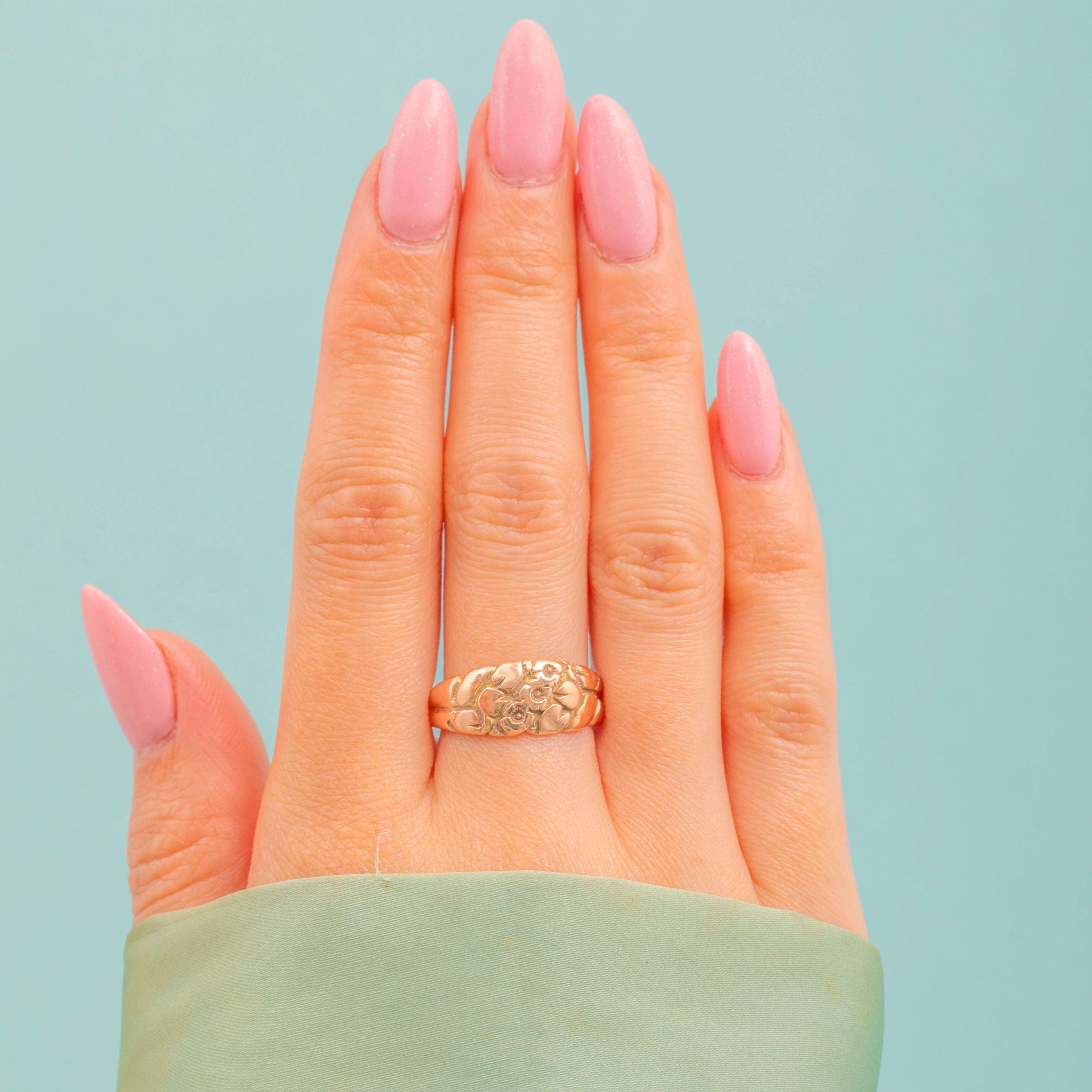 This antique 9ct Gold floral engraved ring is super gorgeous! Displaying beautiful floral and twisted details across its front, this substantial ring will add a luxurious touch to every outfit.
