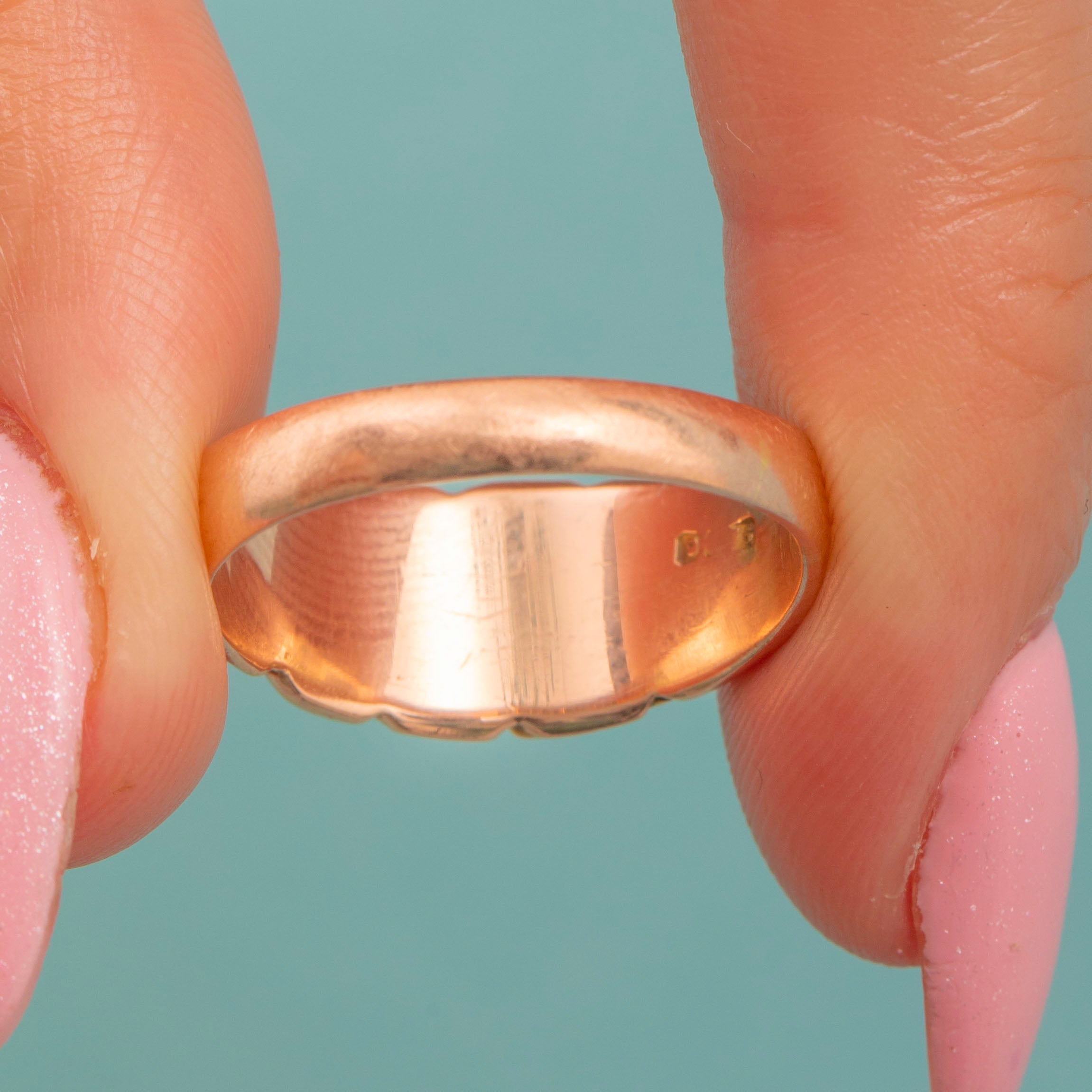 With a smooth finish inside the band, this ring will comfortably hug your finger from morning until night; it would make a fabulous antique wedding band..