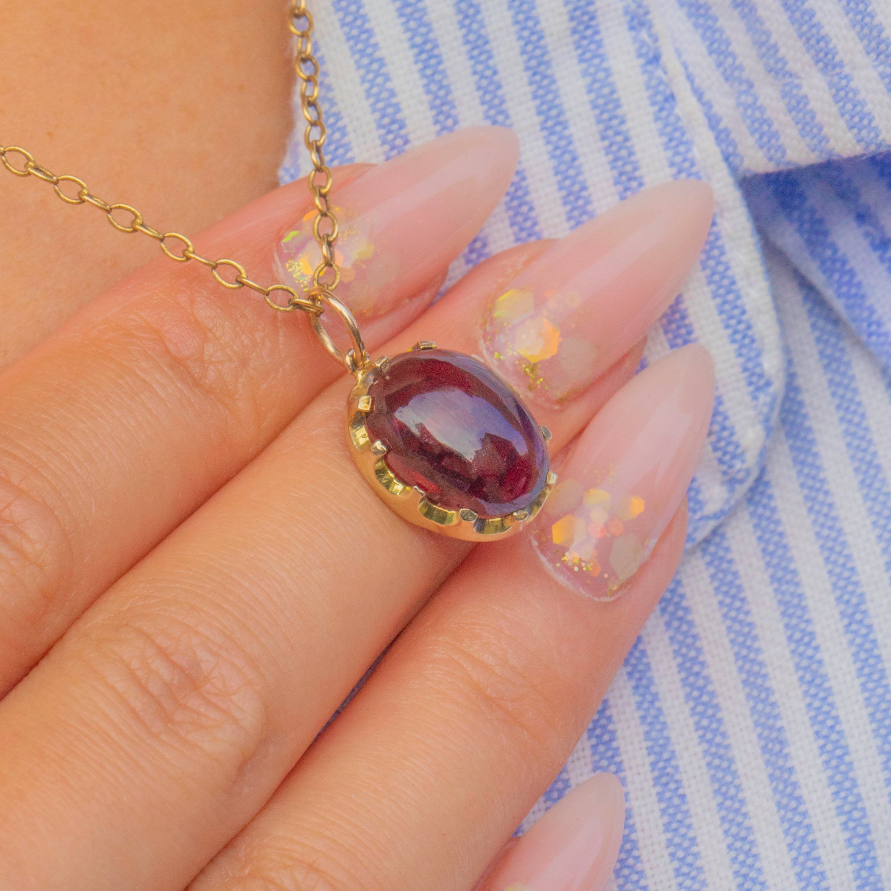 This antique charm is set with a glowing Garnet cabochon, its rich red hue alive with inner fire. The oval cabochon measures 12.5mm x 9mm, weighing approximately 1.06ct, and is securely held in a 9ct Gold bezel setting.