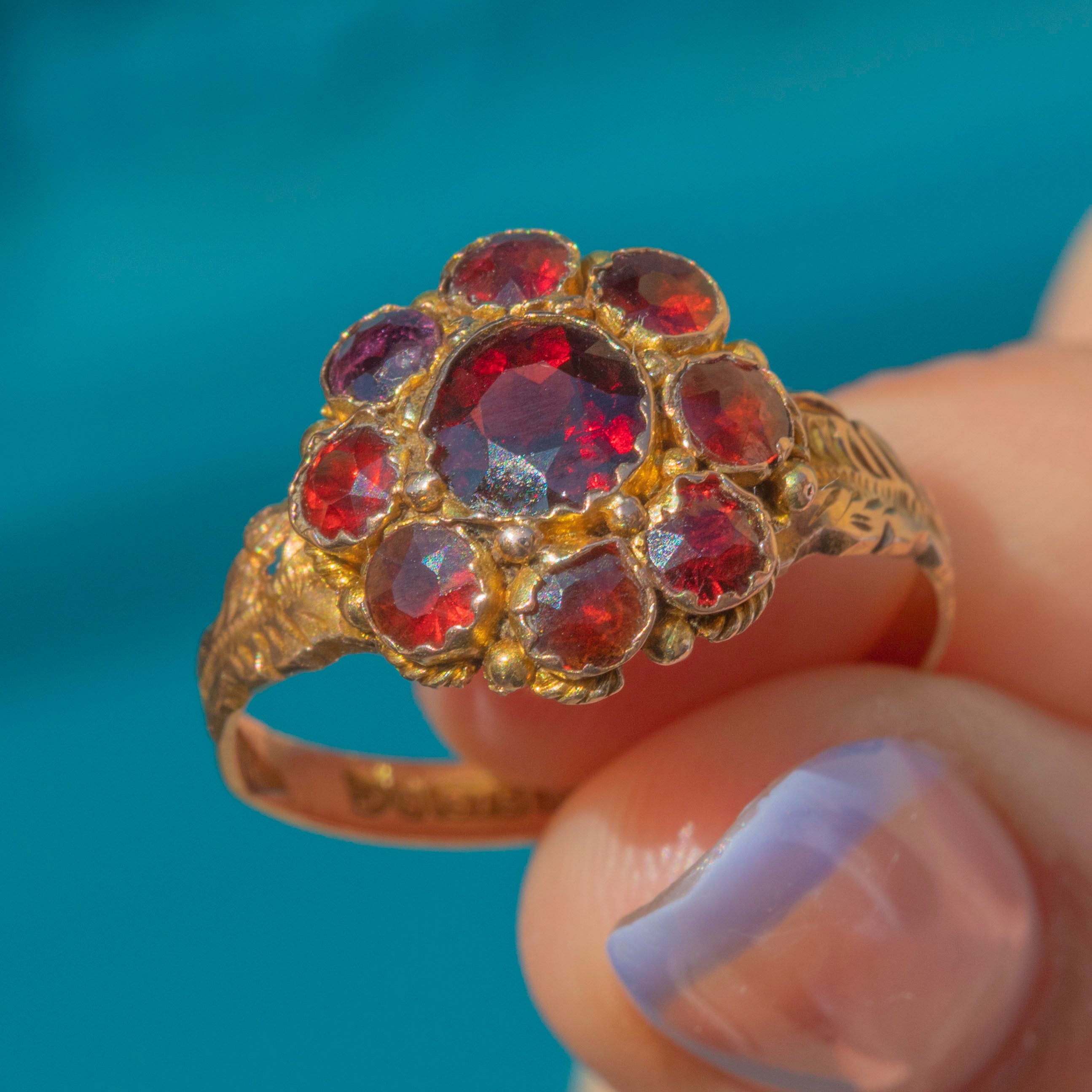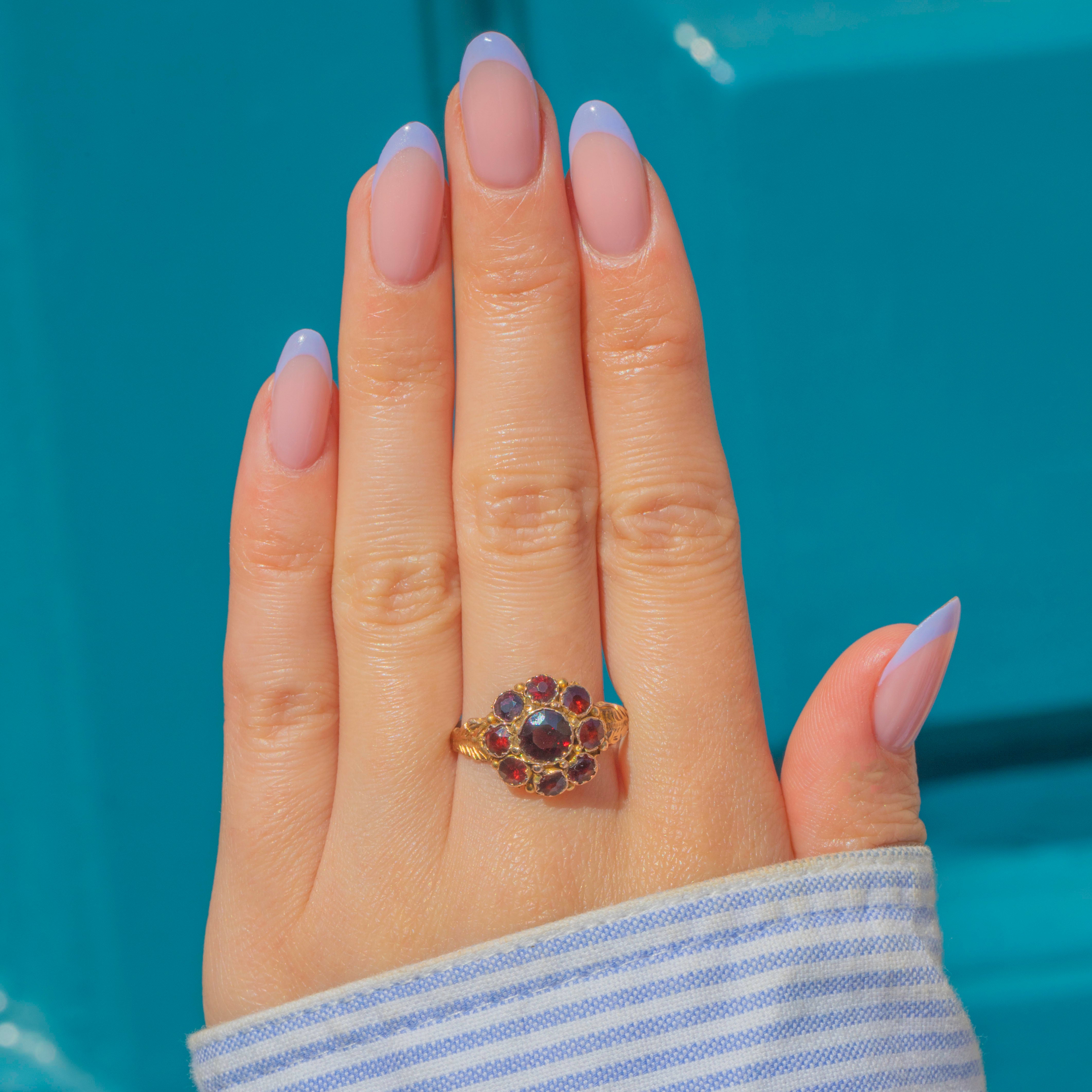 A unique antique 9ct Gold Garnet flower cluster ring for your collection. This piece has been set with a gorgeous selection of round Garnet gemstones, each one juicy and plump!