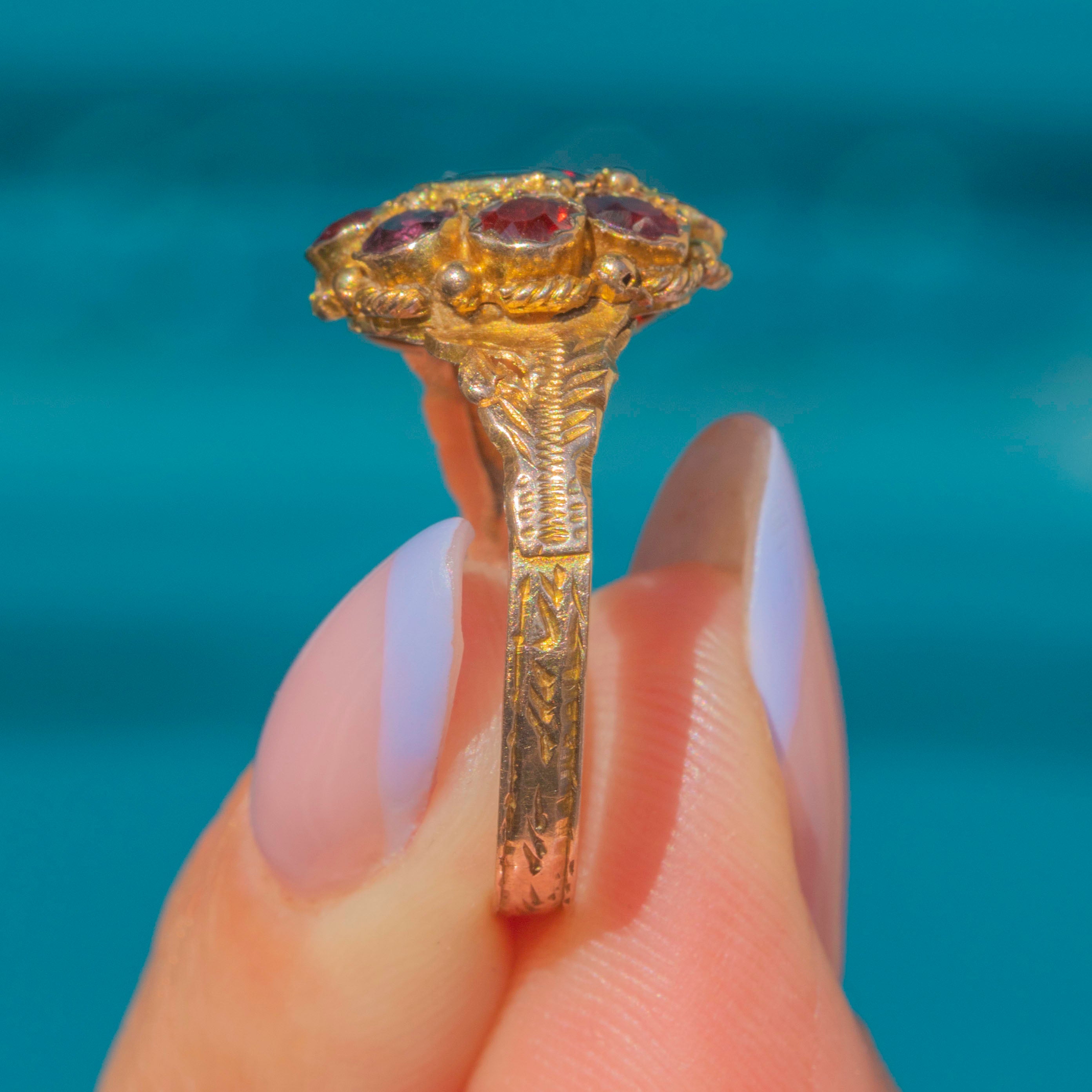 EXCELLENT: This antique 9ct Gold Garnet flower cluster ring is in excellent condition. The ring has plump and juicy gemstones neatly set and free from wear. The ring band is lovely and the piece wears like an absolute dream!