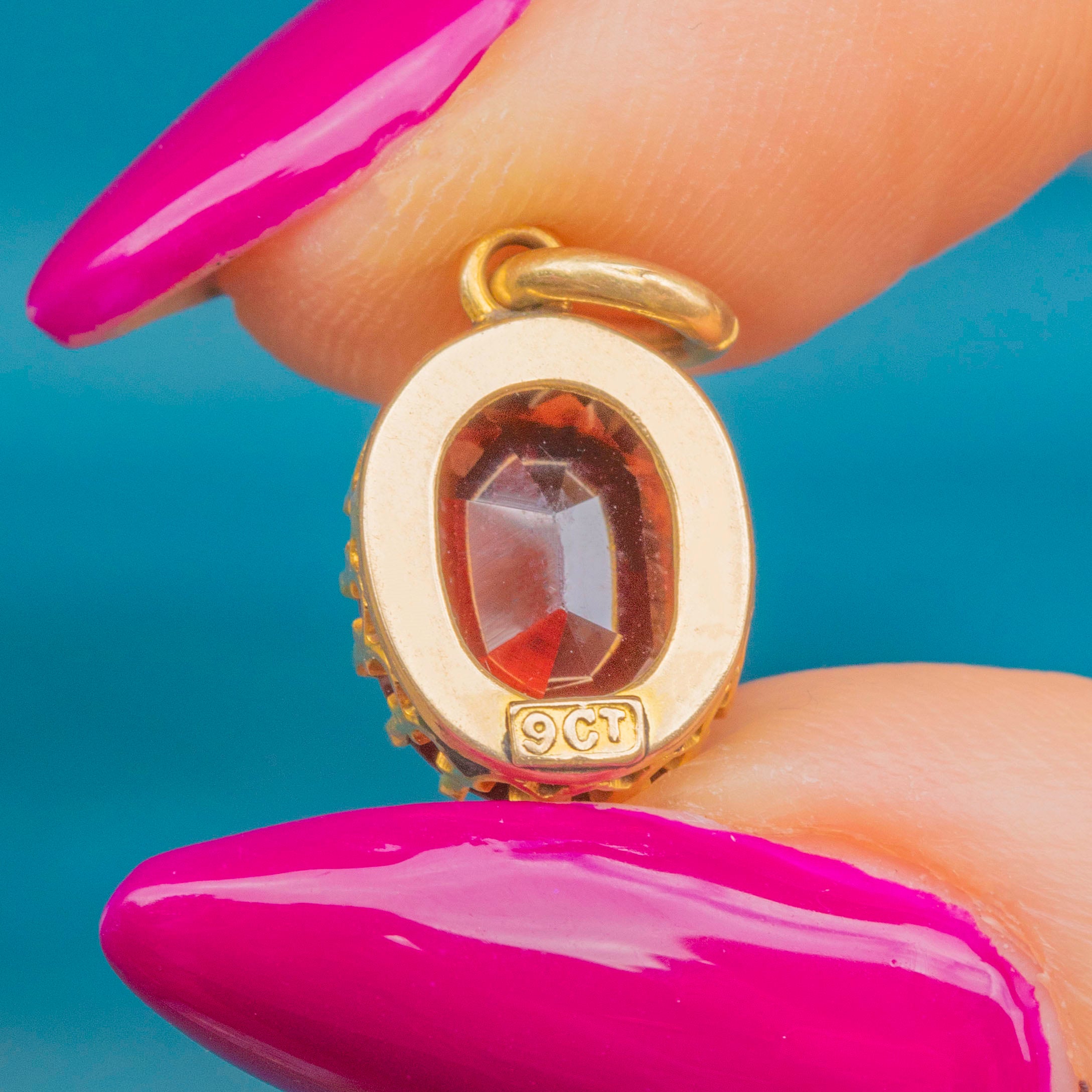 Crafted from warm 9ct Gold, this Victorian charm boasts a crisply faceted 1.75ct Garnet, shimmering with sangria red hues as it catches the light.
