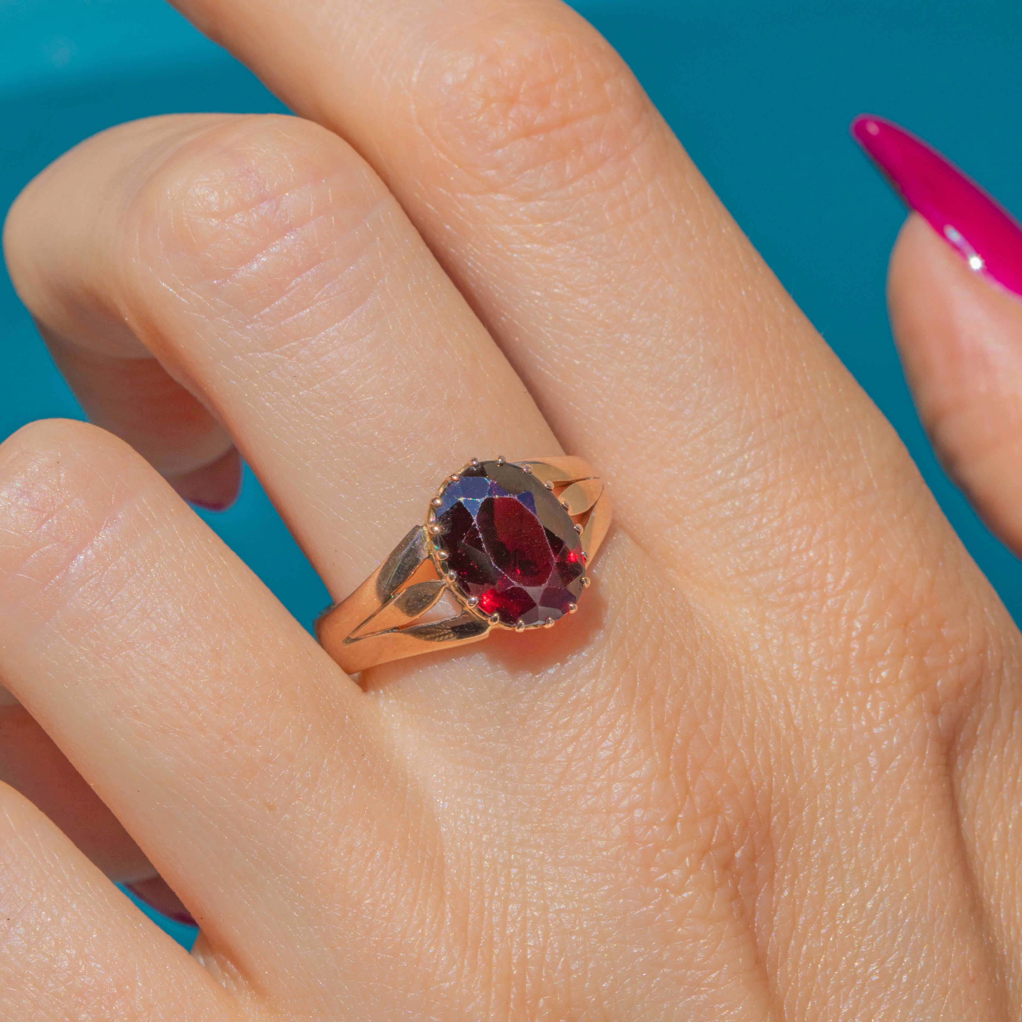 This antique solid 9ct Garnet solitaire ring is a dramatic piece from the early 20th century- hallmarked to 1918. Crafted from solid 9ct Gold, she boasts a richly hued 1.45ct Garnet, projecting flashes of crimson from its geometric facets as they catch the light.
