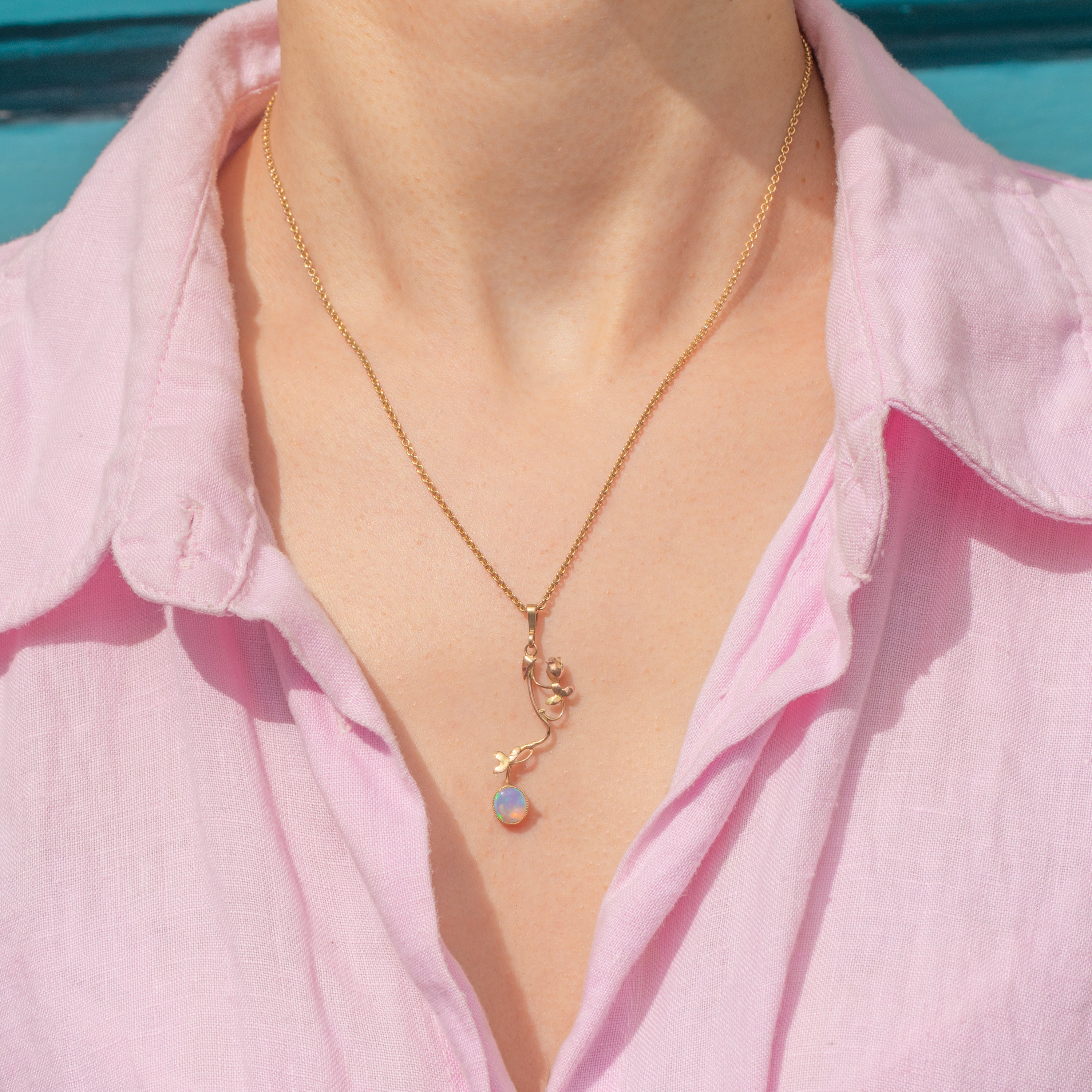 Her galactic Opal shimmers with soft flashes of colour, adding a magical touch to the romantic floral design. Crafted with care, the piece captures the delicate beauty of nature.