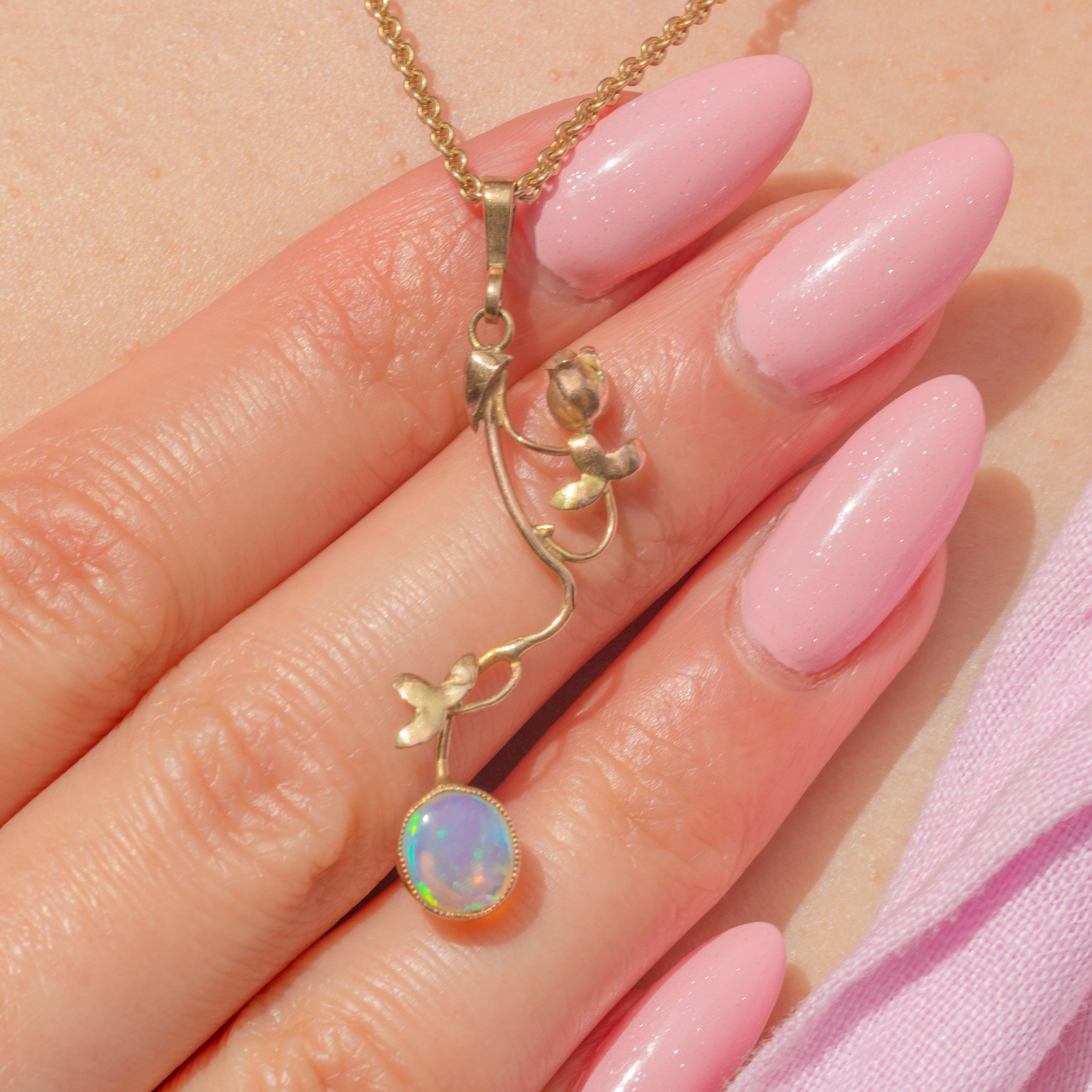 Antique 9ct Gold Opal Rose Pendant with 16" Chain