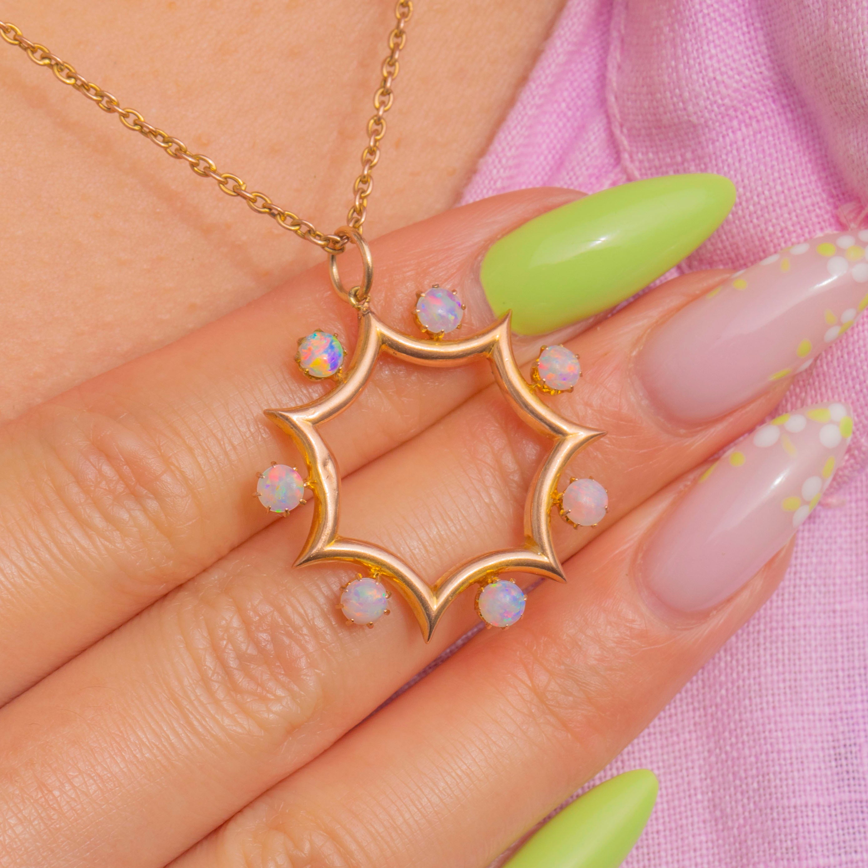 A luminous Victorian 9ct Gold sun roundel pendant, halo-set with dreamy Opal cabochons that glow with pink, blue and green fire. The scalloped, starburst silhouette is beautifully openworked, giving the piece a light, airy elegance while the highly polished Gold catches the light with every movement.