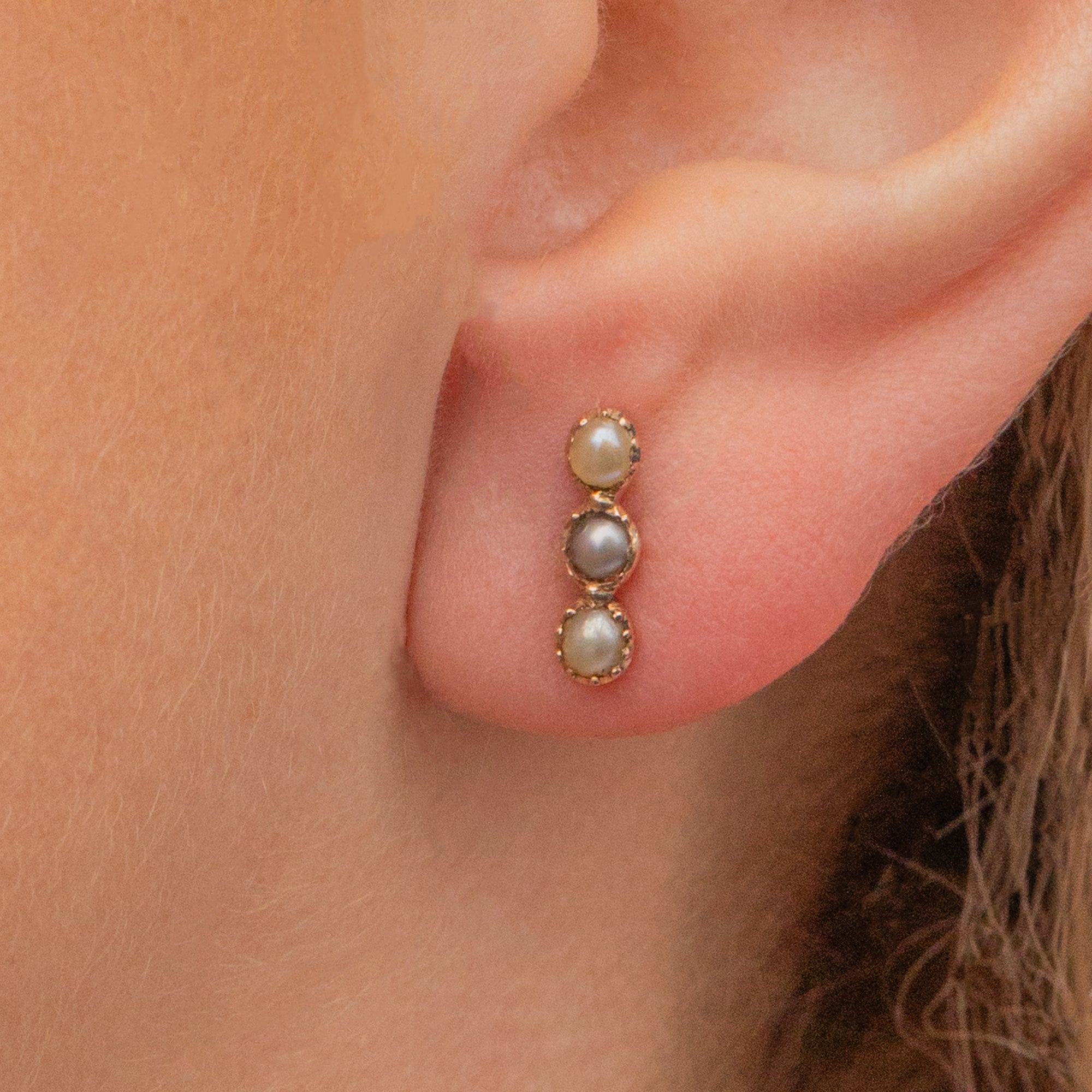 Each Victorian stud earring features three lustrous Pearls, each with a rich natural glow, set within buttery 9ct yellow Gold settings, creating a timeless and sophisticated pair.