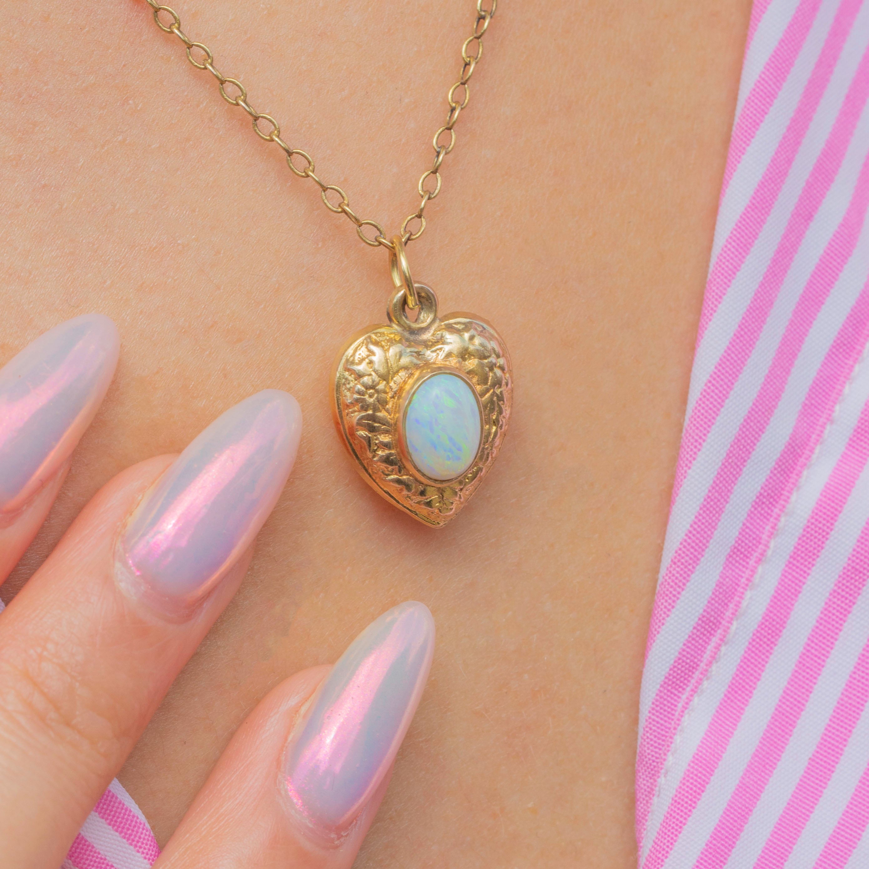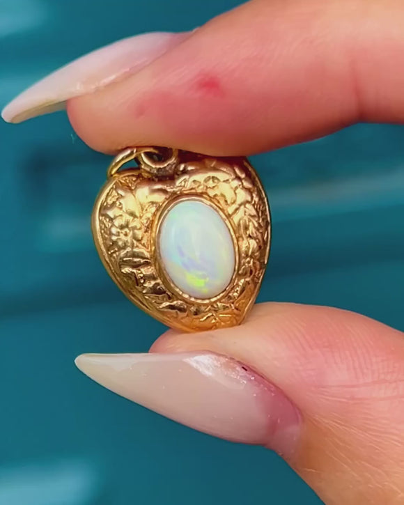 This Victorian repoussé heart charm is embellished with whimsical foliate details and is adorned with a solid 0.35ct natural Opal at her centre.